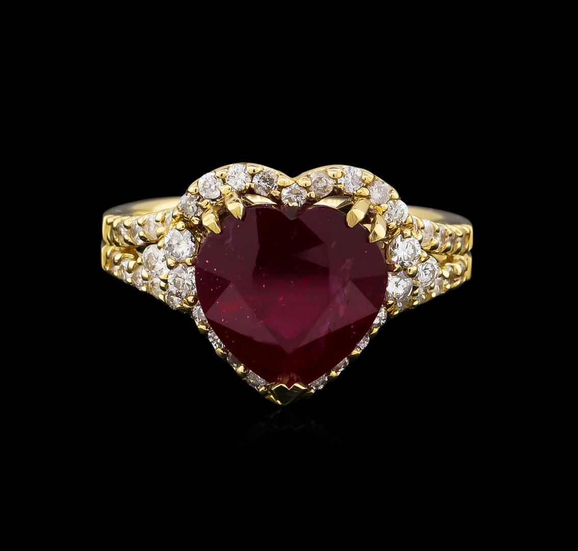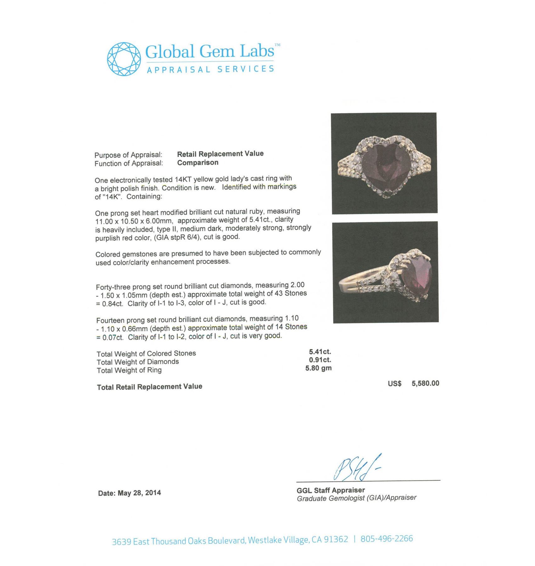 One electronically tested 14KT yellow gold Ladies cast ring with a bright polish finish. Condition is new. Identified with markings of "14K". Containing: One prong set heart modified brilliant cut natural ruby, measuring 11.00 x 10.50 x 6.00mm, approximate weight of 5.41ct., clarity is heavily included, type II, medium dark, moderately strong, strongly purplish red color, (GIA stpR 6/4), cut is good. Colored gemstones are presumed to have been subjected to commonly used color/clarity enhancement processes. Forty-Three prong set round brilliant cut diamonds, measuring 2.00 - 1.50 x 1.05mm (depth est.) approximate. Total Weight of 43 Stones = 0.84ct. Clarity: I-1 to I-3. Color: I - J, Cut is Good. Fourteen prong set round brilliant cut diamonds, measuring 1.10 - 1.10 x 0.66mm (depth est.) approximate. Total Weight of 14 Stones = 0.07ct. Clarity: I-1 to I-2. Color: I - J, Cut is Very Good. Total Weight of Colored Stones 5.41ct. Total Weight of Diamonds 0.91ct. Total Weight of Ring 5.80 Grams. GGL Appraised at $5,580.00.