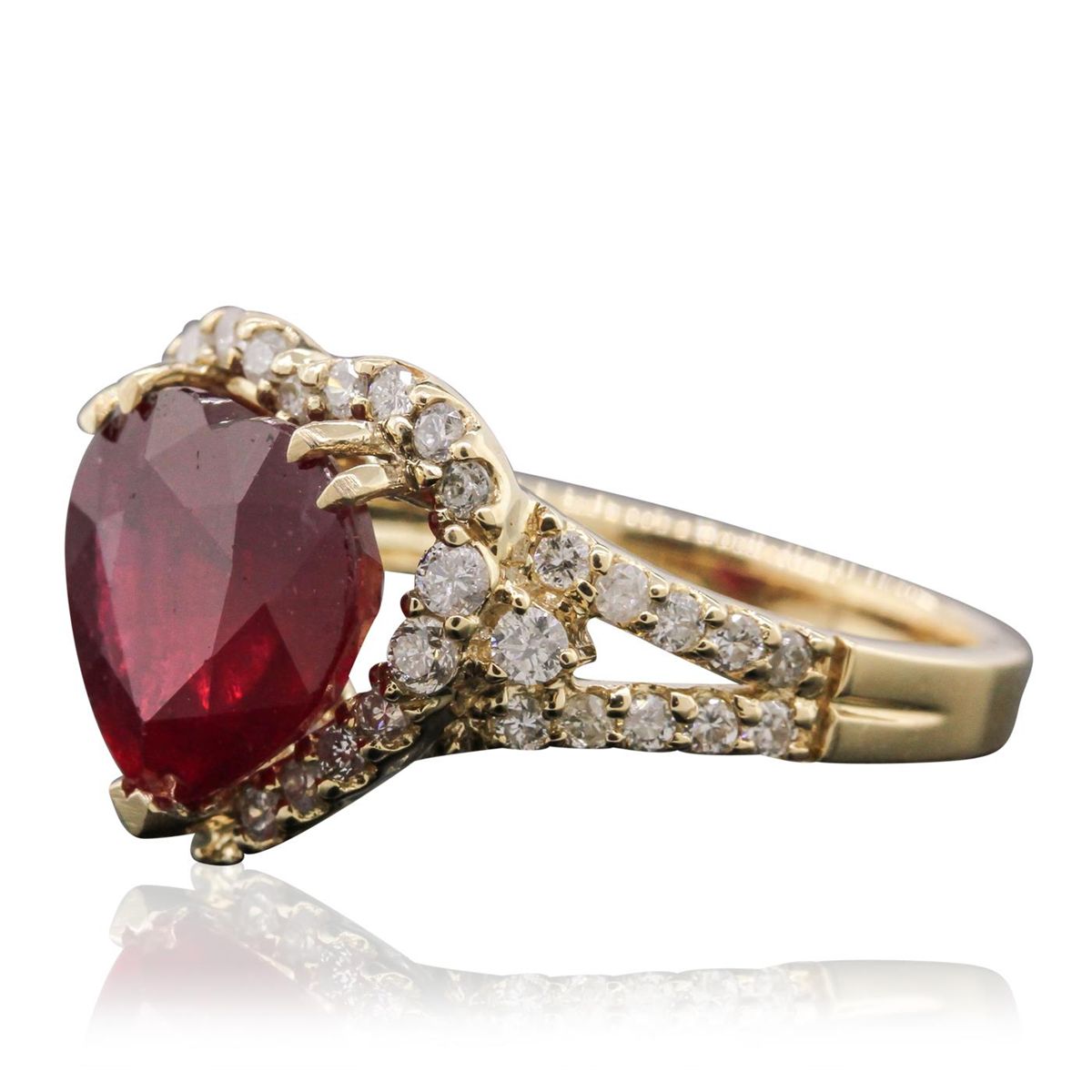 One electronically tested 14KT yellow gold Ladies cast ring with a bright polish finish. Condition is new. Identified with markings of "14K". Containing: One prong set heart modified brilliant cut natural ruby, measuring 11.00 x 10.50 x 6.00mm, approximate weight of 5.41ct., clarity is heavily included, type II, medium dark, moderately strong, strongly purplish red color, (GIA stpR 6/4), cut is good. Colored gemstones are presumed to have been subjected to commonly used color/clarity enhancement processes. Forty-Three prong set round brilliant cut diamonds, measuring 2.00 - 1.50 x 1.05mm (depth est.) approximate. Total Weight of 43 Stones = 0.84ct. Clarity: I-1 to I-3. Color: I - J, Cut is Good. Fourteen prong set round brilliant cut diamonds, measuring 1.10 - 1.10 x 0.66mm (depth est.) approximate. Total Weight of 14 Stones = 0.07ct. Clarity: I-1 to I-2. Color: I - J, Cut is Very Good. Total Weight of Colored Stones 5.41ct. Total Weight of Diamonds 0.91ct. Total Weight of Ring 5.80 Grams. GGL Appraised at $5,580.00.