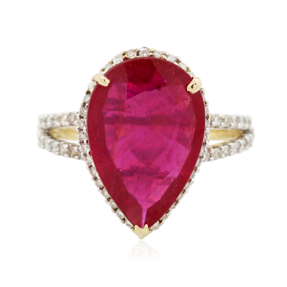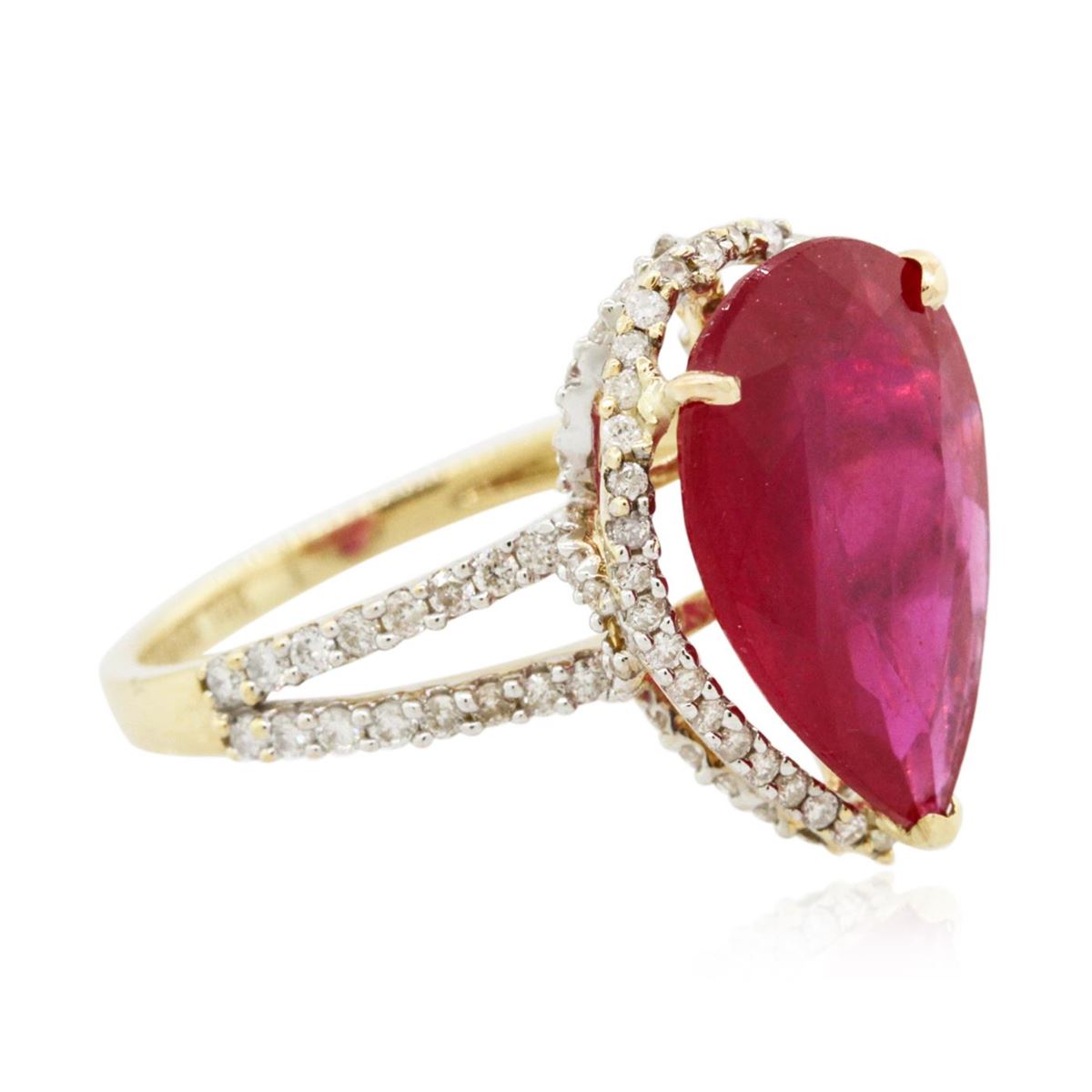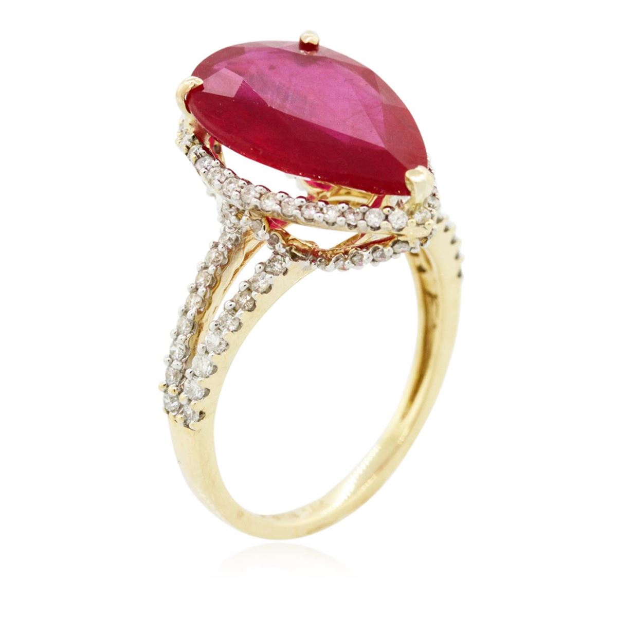 One electronically tested 14KT yellow gold ladies cast ruby and diamond ring with a bright polish finish. Identified with markings of "14K". Condition is new. Containing: One prong set pear modified brilliant cut natural ruby, measuring 16.00 x 11.00 x 3.80mm, approximate weight of 5.42ct., clarity is heavily included, medium, moderately strong, strongly purplish red color, (GIA stpR 5/4), cut is good. One Hundred Four prong set round brilliant cut diamonds, measuring 1.30 - 1.30 x 0.78mm (depth est.) approximate total weight of 104 Stones = 0.83ct. Clarity: I-1 to I-2. Color: I - J, Cut is Good. Colored gemstones are presumed to have been subjected to commonly used enhancement processes. All diamonds and colored gemstones are graded in the mounting, unless otherwise stated. Total Weight of Colored Stones 5.42ct. Total Weight of Diamonds 0.83ct. Total Weight of Ring 4.60 grams. GGL Appraised at $3,985.00.