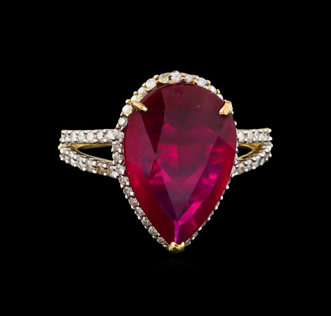 One electronically tested 14KT yellow gold ladies cast ruby and diamond ring with a bright polish finish. Identified with markings of "14K". Condition is new. Containing: One prong set pear modified brilliant cut natural ruby, measuring 16.00 x 11.00 x 3.80mm, approximate weight of 5.42ct., clarity is heavily included, medium, moderately strong, strongly purplish red color, (GIA stpR 5/4), cut is good. One Hundred Four prong set round brilliant cut diamonds, measuring 1.30 - 1.30 x 0.78mm (depth est.) approximate total weight of 104 Stones = 0.83ct. Clarity: I-1 to I-2. Color: I - J, Cut is Good. Colored gemstones are presumed to have been subjected to commonly used enhancement processes. All diamonds and colored gemstones are graded in the mounting, unless otherwise stated. Total Weight of Colored Stones 5.42ct. Total Weight of Diamonds 0.83ct. Total Weight of Ring 4.60 grams. GGL Appraised at $3,985.00.