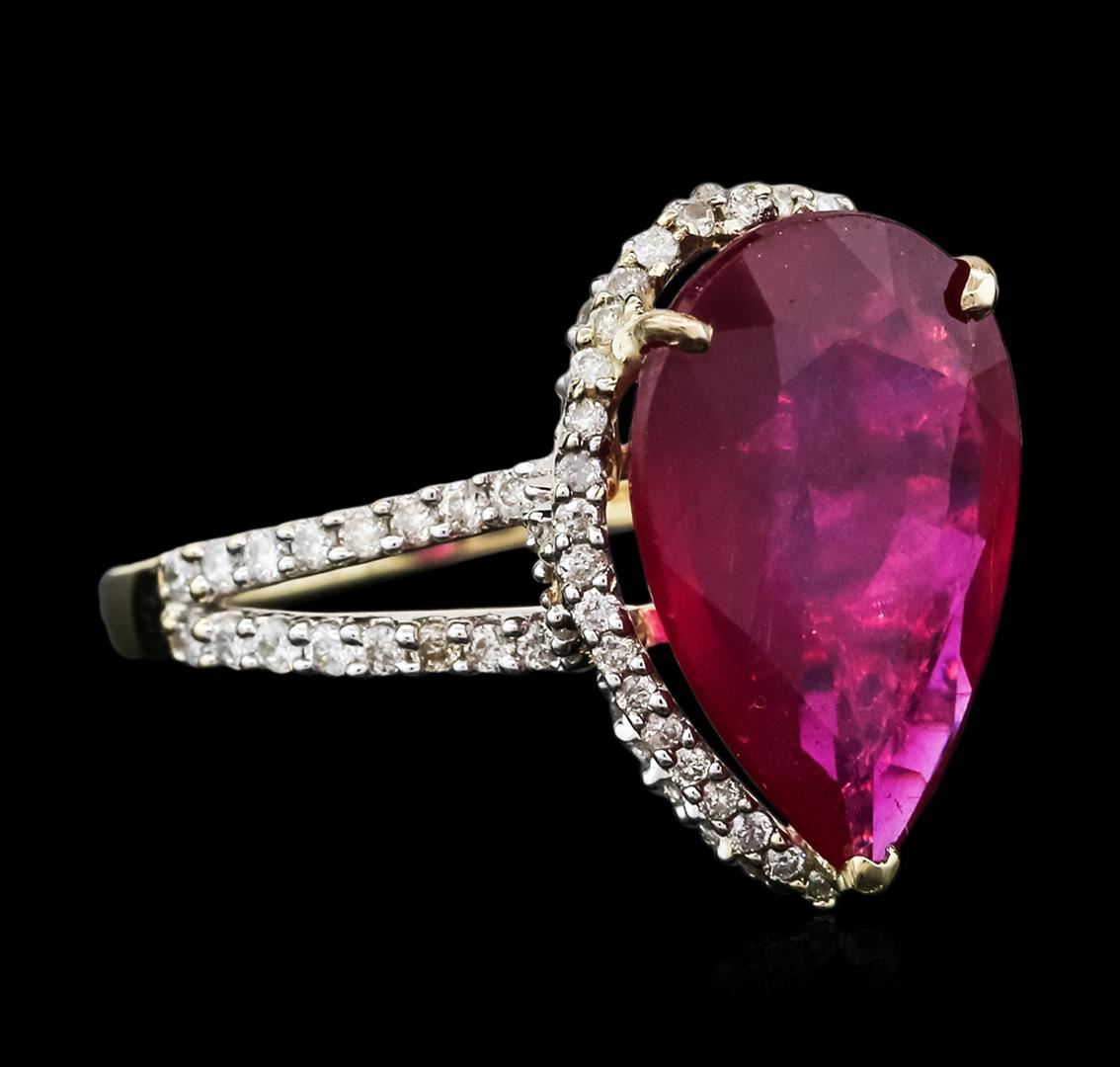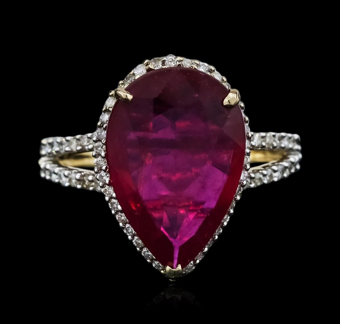 One electronically tested 14KT yellow gold ladies cast ruby and diamond ring with a bright polish finish. Identified with markings of "14K". Condition is new. Containing: One prong set pear modified brilliant cut natural ruby, measuring 16.00 x 11.00 x 3.80mm, approximate weight of 5.42ct., clarity is heavily included, medium, moderately strong, strongly purplish red color, (GIA stpR 5/4), cut is good. One Hundred Four prong set round brilliant cut diamonds, measuring 1.30 - 1.30 x 0.78mm (depth est.) approximate total weight of 104 Stones = 0.83ct. Clarity: I-1 to I-2. Color: I - J, Cut is Good. Colored gemstones are presumed to have been subjected to commonly used enhancement processes. All diamonds and colored gemstones are graded in the mounting, unless otherwise stated. Total Weight of Colored Stones 5.42ct. Total Weight of Diamonds 0.83ct. Total Weight of Ring 4.60 grams. GGL Appraised at $3,985.00.