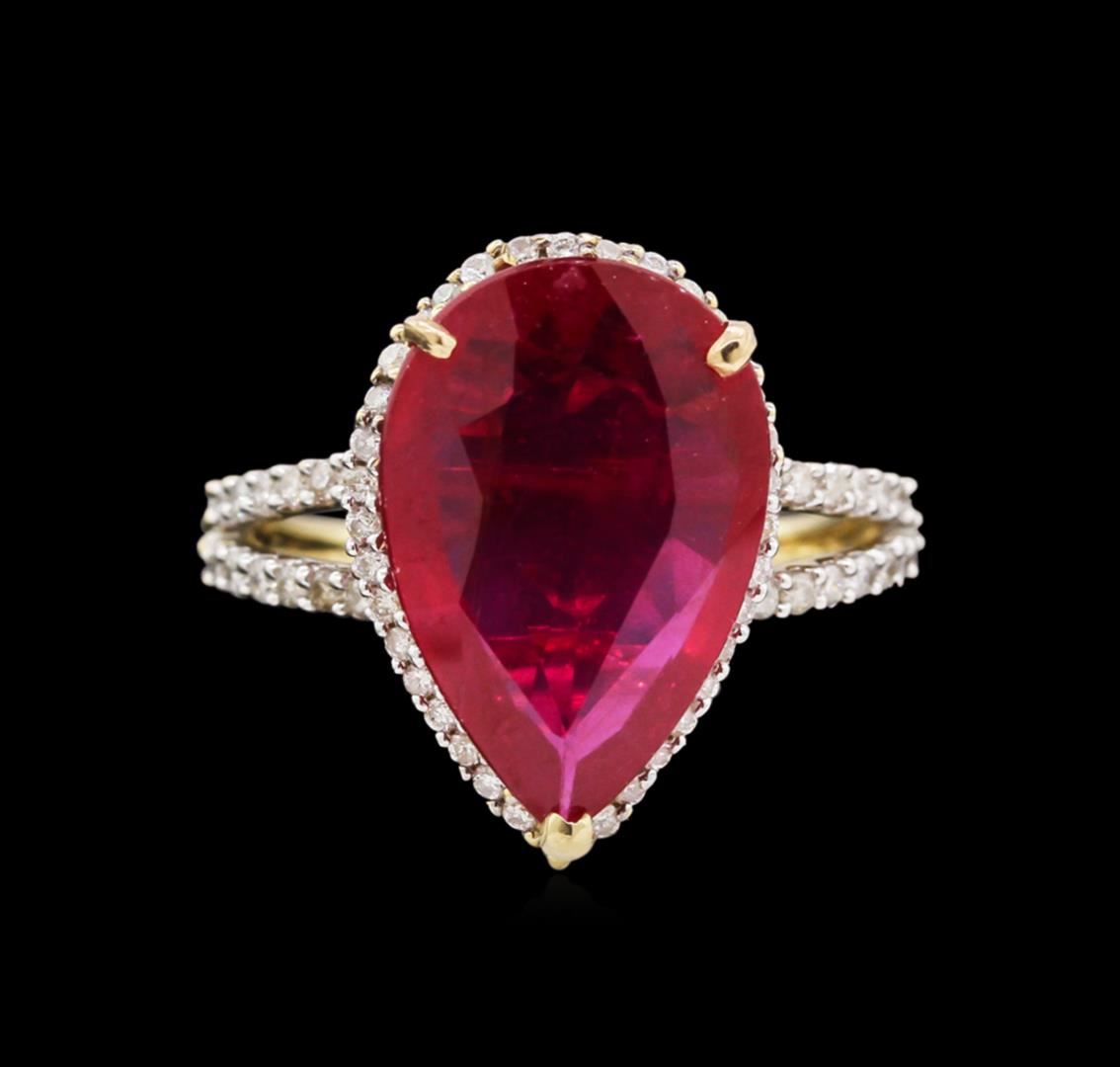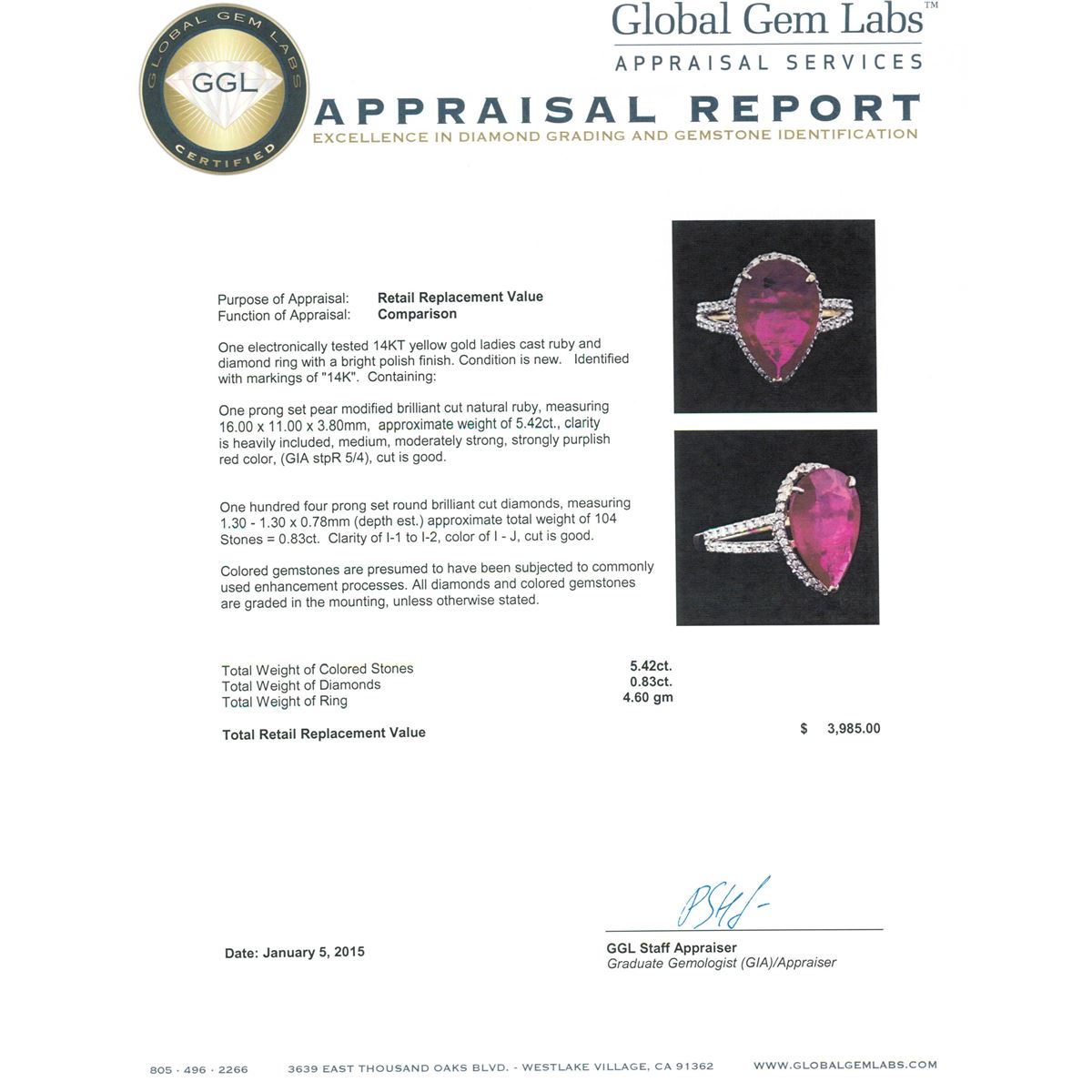 One electronically tested 14KT yellow gold ladies cast ruby and diamond ring with a bright polish finish. Identified with markings of "14K". Condition is new. Containing: One prong set pear modified brilliant cut natural ruby, measuring 16.00 x 11.00 x 3.80mm, approximate weight of 5.42ct., clarity is heavily included, medium, moderately strong, strongly purplish red color, (GIA stpR 5/4), cut is good. One Hundred Four prong set round brilliant cut diamonds, measuring 1.30 - 1.30 x 0.78mm (depth est.) approximate total weight of 104 Stones = 0.83ct. Clarity: I-1 to I-2. Color: I - J, Cut is Good. Colored gemstones are presumed to have been subjected to commonly used enhancement processes. All diamonds and colored gemstones are graded in the mounting, unless otherwise stated. Total Weight of Colored Stones 5.42ct. Total Weight of Diamonds 0.83ct. Total Weight of Ring 4.60 grams. GGL Appraised at $3,985.00.