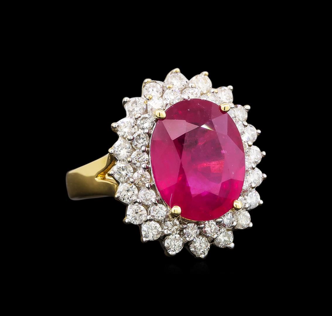 One electronically tested 14KT yellow gold ladies cast ruby and diamond ring with a split shank with a bright polish finish. Trademark is Orianne. Identified with markings of "14K". Condition is new. Containing: One prong set oval modified brilliant cut natural ruby, measuring 12.23 x 9.57 x 5.52mm, approximate weight of 5.43ct., clarity is heavily included, type II, medium dark, very slightly brownish, strongly purplish red color, (GIA stpR 6/3), cut is good. Twenty prong set round brilliant cut diamonds, measuring 2.30 - 2.30 x 1.38mm (depth est.) approximate total weight of 20 Stones = 0.89ct. Clarity: SI-2 to I-2. Color: J - K. Twenty prong set round brilliant cut diamonds, measuring 1.50 - 1.50 x 0.90mm (depth est.) approximate total weight of 20 Stones = 0.25ct. Clarity: I-1 to I-2. Color: I - J. All diamonds and colored gemstones are graded in the mounting, unless otherwise stated. Colored gemstones are presumed to have been subjected to commonly used enhancement processes.. Total Weight of Colored Stones 5.43ct. Total Weight of Diamonds 1.14ct. Total Weight of Ring 6.50 grams. GGL Appraised at $4,285.00.