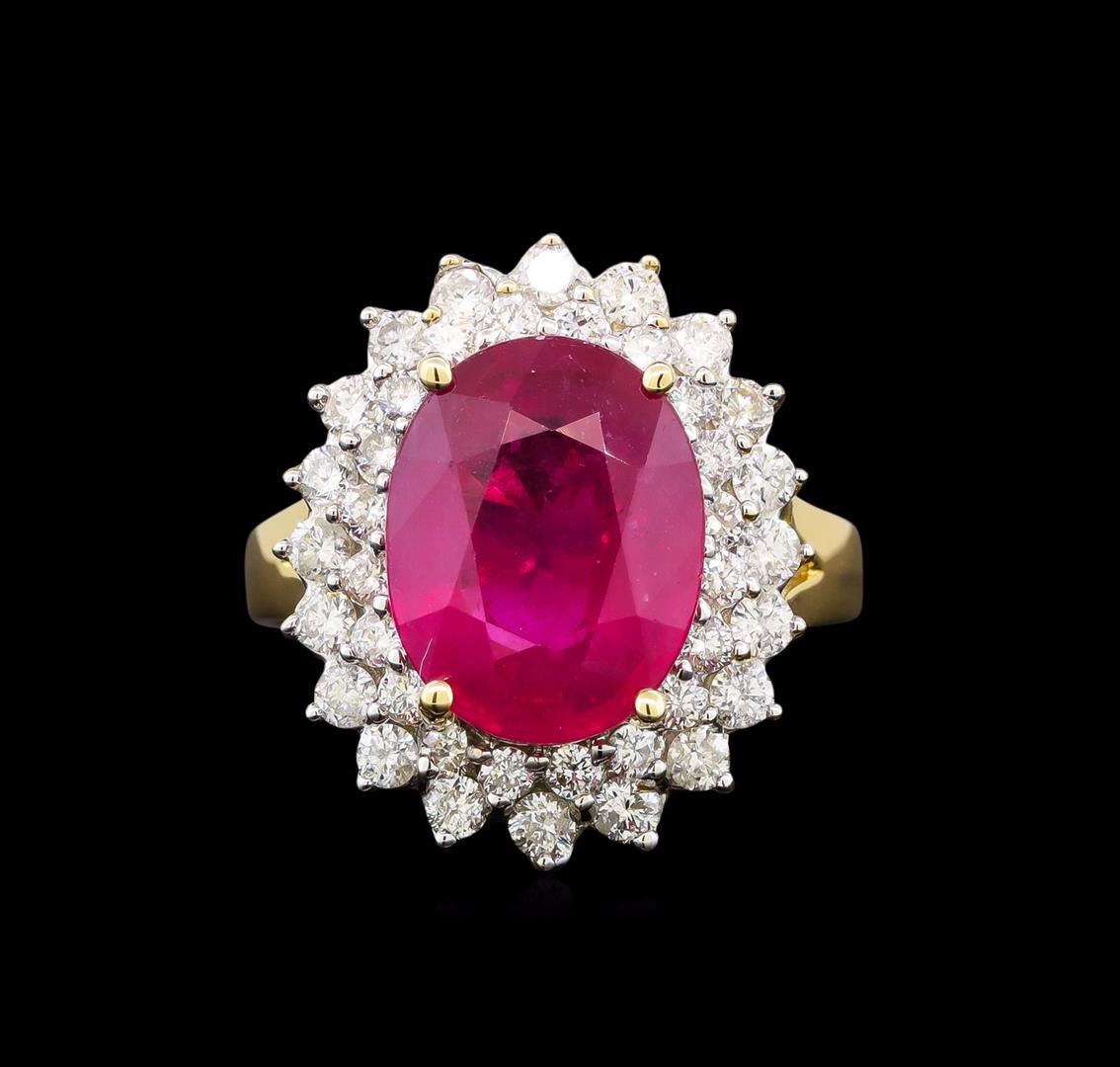 One electronically tested 14KT yellow gold ladies cast ruby and diamond ring with a split shank with a bright polish finish. Trademark is Orianne. Identified with markings of "14K". Condition is new. Containing: One prong set oval modified brilliant cut natural ruby, measuring 12.23 x 9.57 x 5.52mm, approximate weight of 5.43ct., clarity is heavily included, type II, medium dark, very slightly brownish, strongly purplish red color, (GIA stpR 6/3), cut is good. Twenty prong set round brilliant cut diamonds, measuring 2.30 - 2.30 x 1.38mm (depth est.) approximate total weight of 20 Stones = 0.89ct. Clarity: SI-2 to I-2. Color: J - K. Twenty prong set round brilliant cut diamonds, measuring 1.50 - 1.50 x 0.90mm (depth est.) approximate total weight of 20 Stones = 0.25ct. Clarity: I-1 to I-2. Color: I - J. All diamonds and colored gemstones are graded in the mounting, unless otherwise stated. Colored gemstones are presumed to have been subjected to commonly used enhancement processes.. Total Weight of Colored Stones 5.43ct. Total Weight of Diamonds 1.14ct. Total Weight of Ring 6.50 grams. GGL Appraised at $4,285.00.