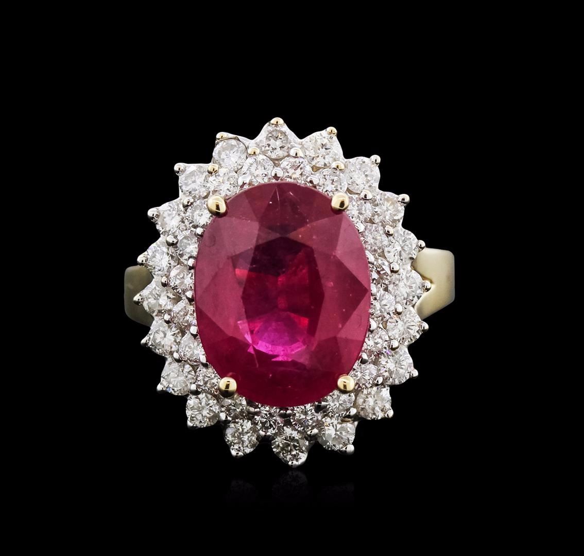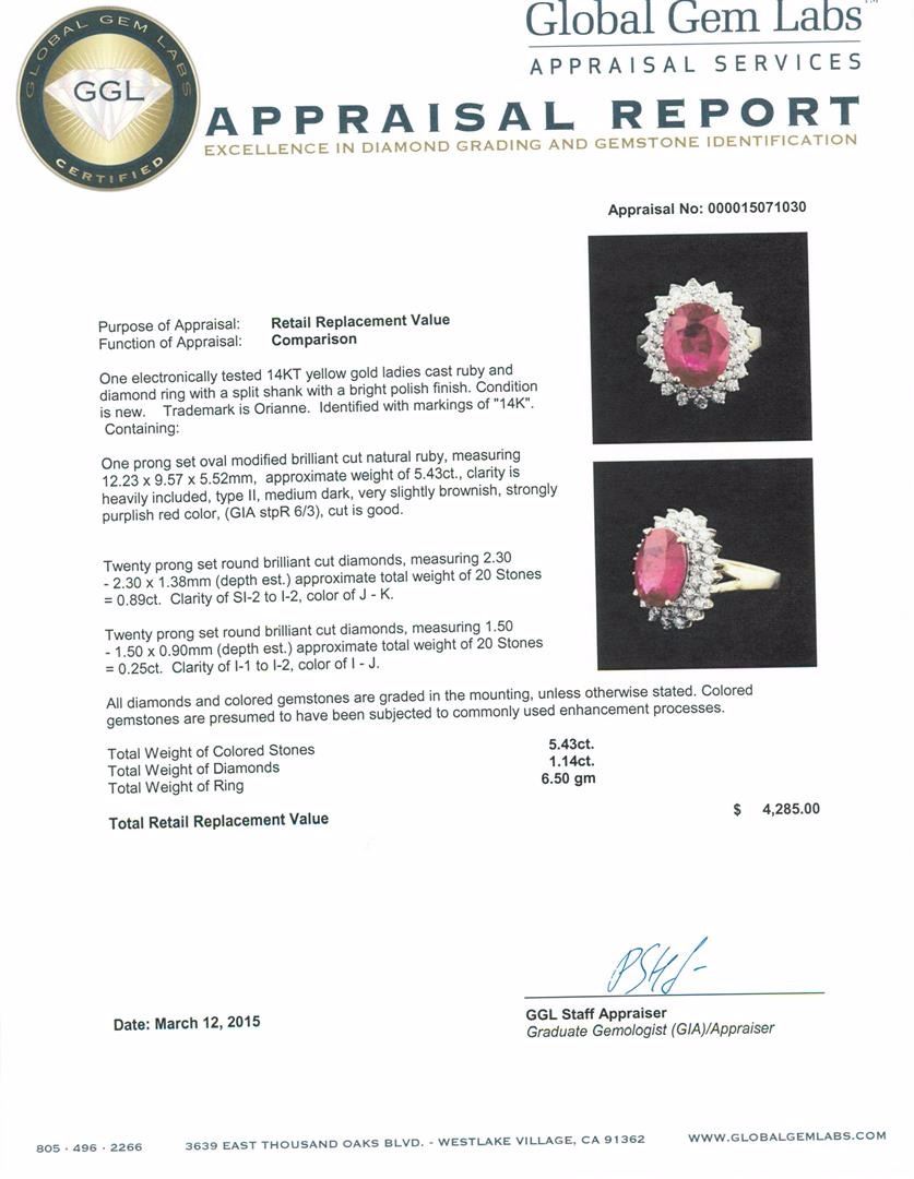 One electronically tested 14KT yellow gold ladies cast ruby and diamond ring with a split shank with a bright polish finish. Trademark is Orianne. Identified with markings of "14K". Condition is new. Containing: One prong set oval modified brilliant cut natural ruby, measuring 12.23 x 9.57 x 5.52mm, approximate weight of 5.43ct., clarity is heavily included, type II, medium dark, very slightly brownish, strongly purplish red color, (GIA stpR 6/3), cut is good. Twenty prong set round brilliant cut diamonds, measuring 2.30 - 2.30 x 1.38mm (depth est.) approximate total weight of 20 Stones = 0.89ct. Clarity: SI-2 to I-2. Color: J - K. Twenty prong set round brilliant cut diamonds, measuring 1.50 - 1.50 x 0.90mm (depth est.) approximate total weight of 20 Stones = 0.25ct. Clarity: I-1 to I-2. Color: I - J. All diamonds and colored gemstones are graded in the mounting, unless otherwise stated. Colored gemstones are presumed to have been subjected to commonly used enhancement processes.. Total Weight of Colored Stones 5.43ct. Total Weight of Diamonds 1.14ct. Total Weight of Ring 6.50 grams. GGL Appraised at $4,285.00.