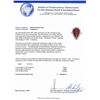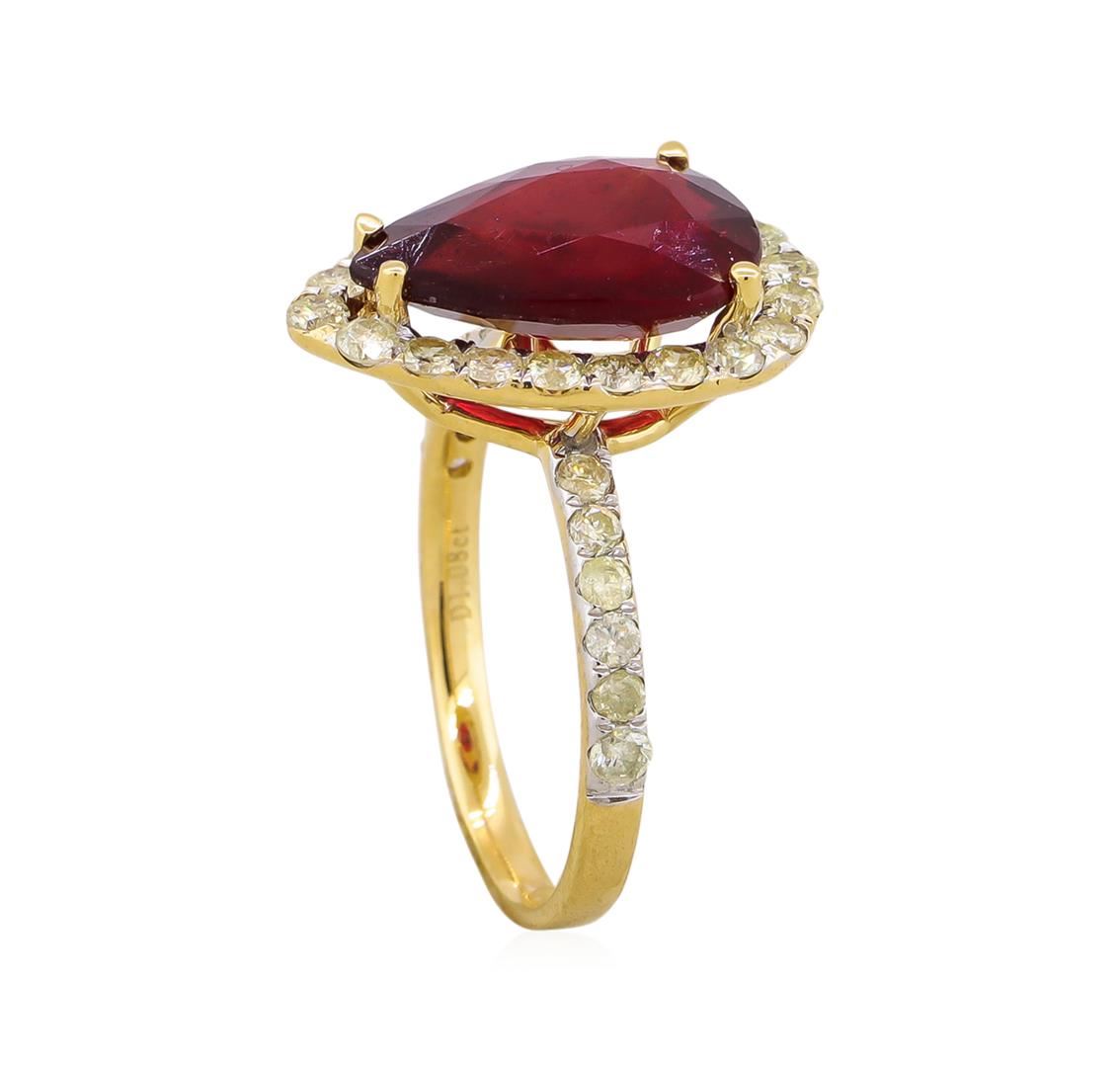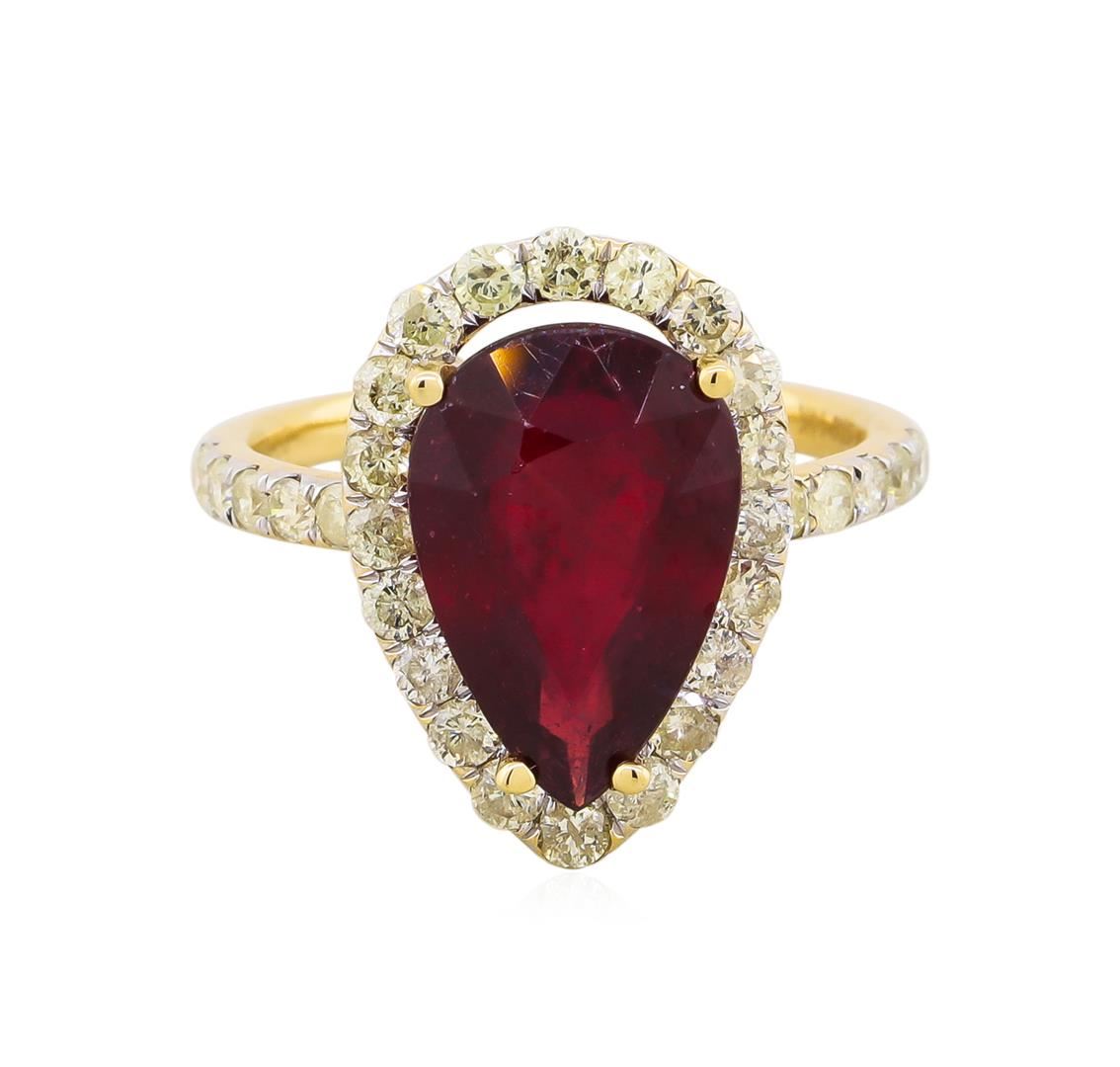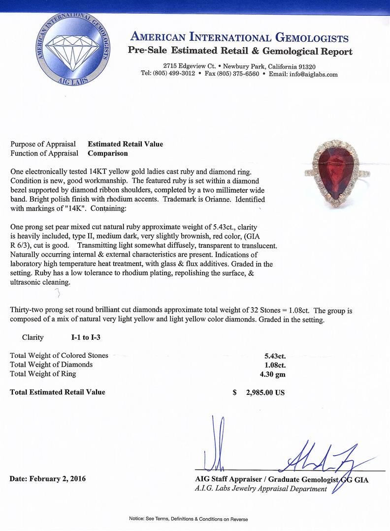 One electronically tested 14KT yellow gold ladies cast ruby and diamond ring. The featured ruby is set within a diamond bezel supported by diamond ribbon shoulders, completed by a two millimeter wide band. Bright polish finish with rhodium accents. Trademark is Orianne. Identified with markings of "14K". Condition is new, good workmanship. Containing: One prong set pear mixed cut natural ruby approximate weight of 5.43ct., clarity is heavily included, type II, medium dark, very slightly brownish, red color, (GIA R 6/3), cut is good. Transmitting light somewhat diffusely, transparent to translucent. Naturally occurring internal & external characteristics are present. Indications of laboratory high temperature heat treatment, with glass & flux additives. Graded in the setting. Ruby has a low tolerance to rhodium plating, repolishing the surface, & ultrasonic cleaning.Thirty-Two prong set round brilliant cut diamonds approximate. Total Weight of 32 Stones = 1.08ct. The group is composed of a mix of natural very light yellow and light yellow color diamonds. Graded in the setting. Clarity: I-1 to I-3. Total Weight of Colored Stones 5.43ct. Total Weight of Diamonds 1.08ct. Total Weight of Ring 4.30gm. AIG Appraised at $2,985.00.