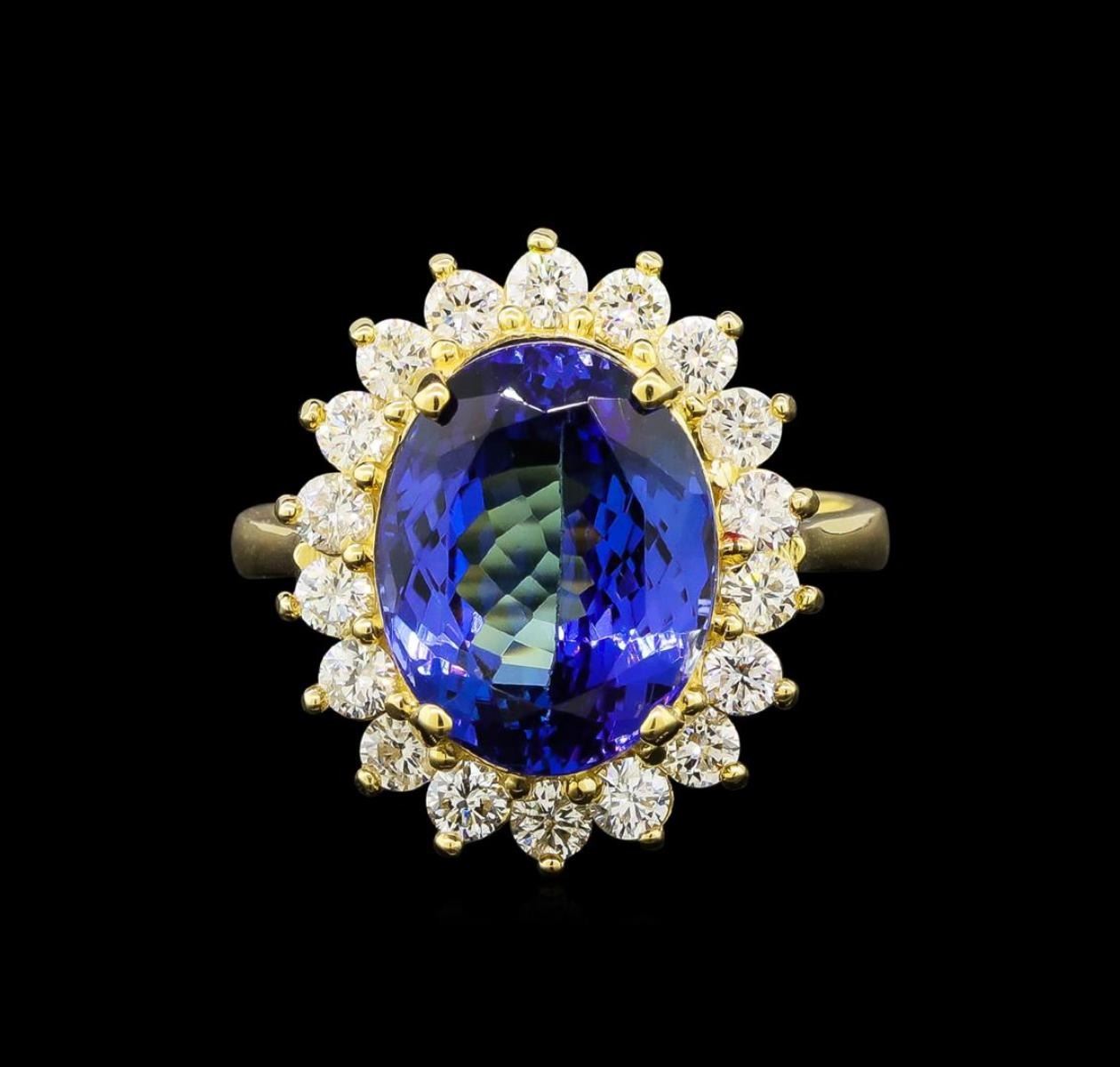 One electronically tested 14KT yellow gold ladies cast tanzanite and diamond ring with a bright polish finish. Identified with markings of "14K". Condition is new. Containing: One prong set oval modified brilliant cut natural tanzanite, measuring 12.44 x 9.78 x 6.36mm, approximate weight of 5.44ct., clarity is eye clean, type I, medium, moderately strong, bluish violet color, (GIA bV 5/4), cut is good. Eighteen prong set round brilliant cut diamonds, measuring 2.20 - 2.20 x 1.32mm (depth est.) approximate total weight of 18 Stones = 0.70ct. Clarity: SI-1 to SI-2. Color: J - K, Cut is Good. Colored gemstones are presumed to have been subjected to commonly used enhancement processes. All diamonds and colored gemstones are graded in the mounting, unless otherwise stated. Total Weight of Colored Stones 5.44ct. Total Weight of Diamonds 0.70ct. Total Weight of Ring 6.00 grams. GGL Appraised.