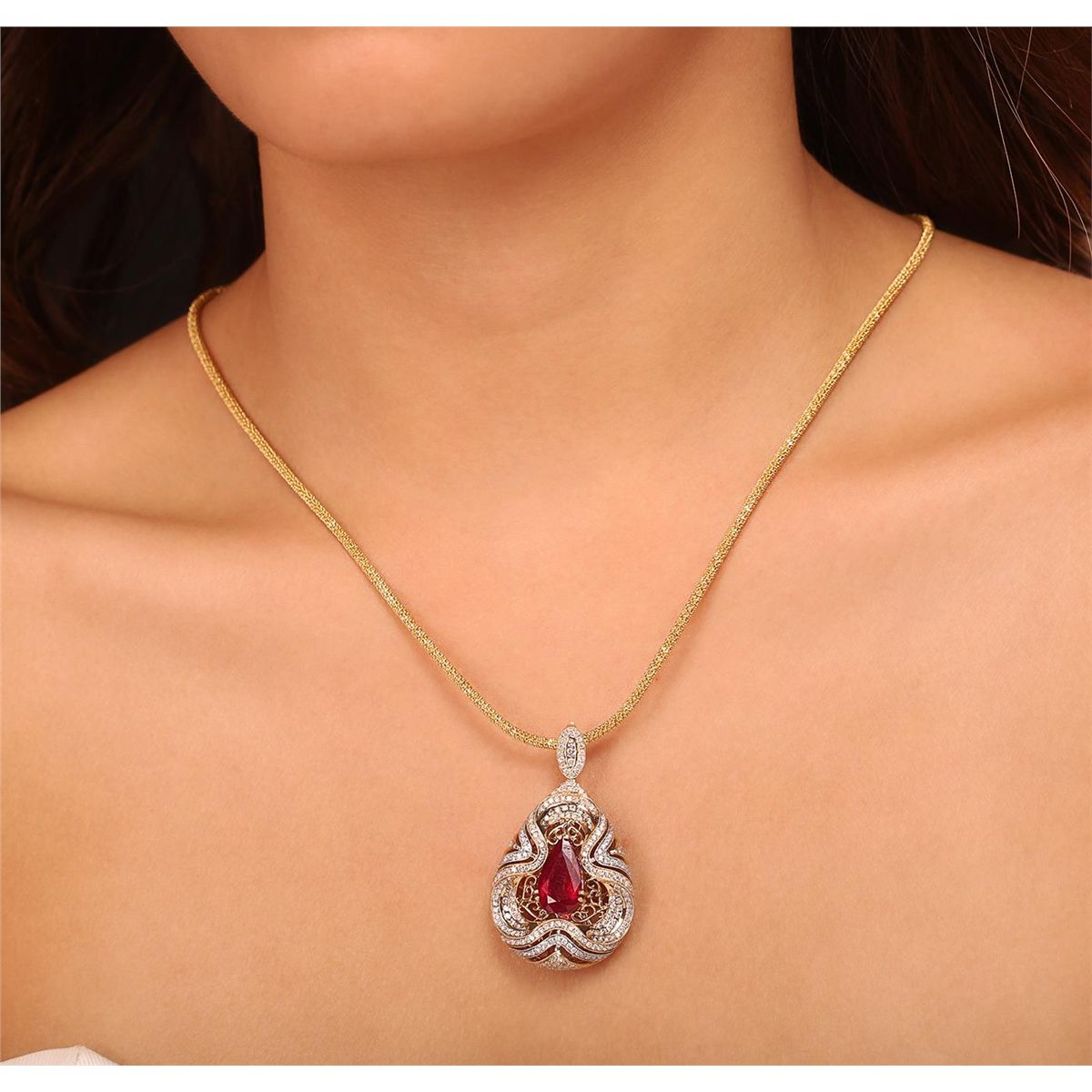 One electronically tested 14KT yellow gold Ladies combination cast & die struck pendant & chain 16.0" long, medium fancy cable link with a lobster claw clasp with a bright polish finish. Condition is new. Identified with markings of "14K". Containing: One prong set pear modified brilliant cut natural ruby, measuring 14.00 x 9.00 x 5.85mm, approximate weight of 5.44ct., clarity is heavily included, type II, medium, moderately strong, strongly purplish red color, (GIA stpR 5/4), cut is good. Colored gemstones are presumed to have been subjected to commonly used color/clarity enhancement processes. Two Hundred Eighty-Two prong set round brilliant cut diamonds, measuring 1.50 - 1.30 x 0.84mm (depth est.) approximate. Total Weight of 282 Stones = 1.51ct. Clarity: I-1 to I-2. Color: H - I, Cut is Good. Total Weight of Colored Stones 5.44ct. Total Weight of Diamonds 1.51ct. Total Weight of Pendant & Chain 22.20 grams. GGL Appraised at $14,035.00.