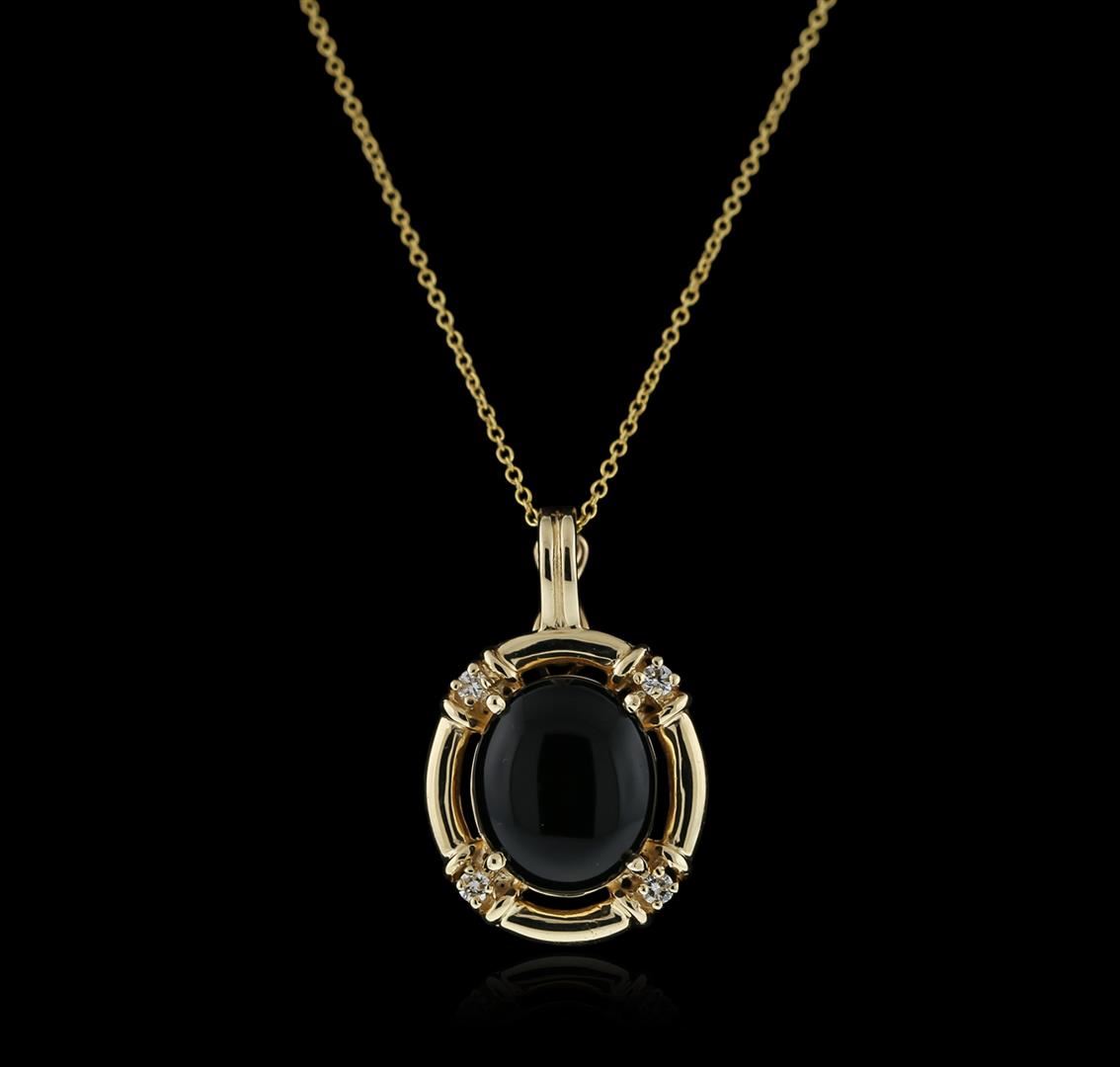 One pendant with chain featuring: 14KT yellow gold weighing 5.62 grams containing one onyx center stone with a total weight of 5.50ct and diamonds with a total weight of 0.16ct.