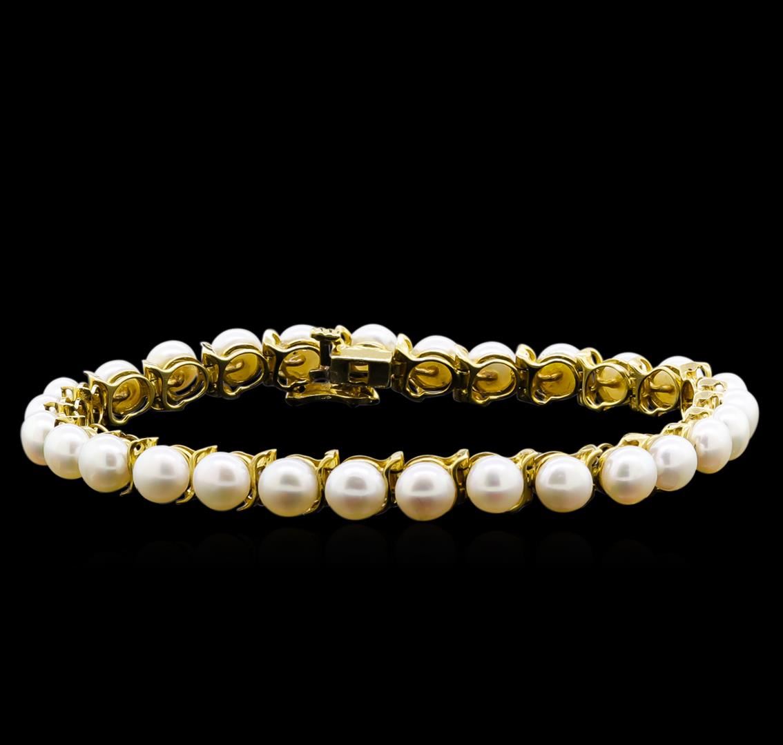 One 14KT yellow gold 5.5mm pearl bracelet. Metal: 14KT solid yellow gold. Face Measurements: 6 x 180mm. Size: 7. Finish: Bright polish. Total Item Weight: 15.0 grams. Markings: Stamped 14K. Containing: 28 round pearls measuring 5.5mm. Setting: Prong. Type: South Sea. Shape: Button. Color: White. Luster: High. Nacre: Thick. Quality: AA+. Excellent workmanship. Pearls graded in the setting. BHGL Appraised at $3,500.00.