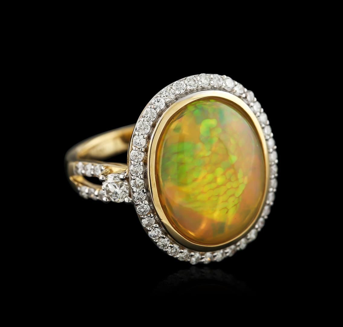 One ring featuring: 14KT yellow gold weighing 6.30 grams containing one opal center stone with a total weight of 5.61ct and round diamonds with a total weight of 1.04ct.