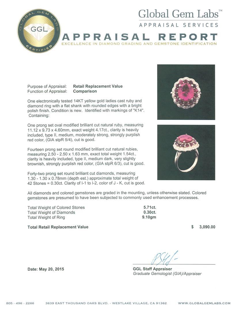 One electronically tested 14KT yellow gold ladies cast ruby and diamond ring with a flat shank with rounded edges with a bright polish finish. Identified with markings of "K14". Condition is new. Containing: One prong set oval modified brilliant cut natural ruby, measuring 11.12 x 9.73 x 4.60mm, exact weight 4.17ct., clarity is heavily included, type II, medium, moderately strong, strongly purplish red color, (GIA stpR 5/4), cut is good. Fourteen prong set round modified brilliant cut natural rubies, measuring 2.50 - 2.50 x 1.63 mm, exact total weight 1.54ct., clarity is heavily included, type II, medium dark, very slightly brownish, strongly purplish red color, (GIA stpR 6/3), cut is good. Forty-Two prong set round brilliant cut diamonds, measuring 1.30 - 1.30 x 0.78mm (depth est.) approximate total weight of 42 Stones = 0.30ct. Clarity: I-1 to I-2. Color: J - K, Cut is Good. All diamonds and colored gemstones are graded in the mounting, unless otherwise stated. Colored gemstones are presumed to have been subjected to commonly used enhancement processes. Total Weight of Colored Stones 5.71ct. Total Weight of Diamonds 0.30ct. Total Weight of Ring 9.10 grams. GGL Appraised at $3,090.00.