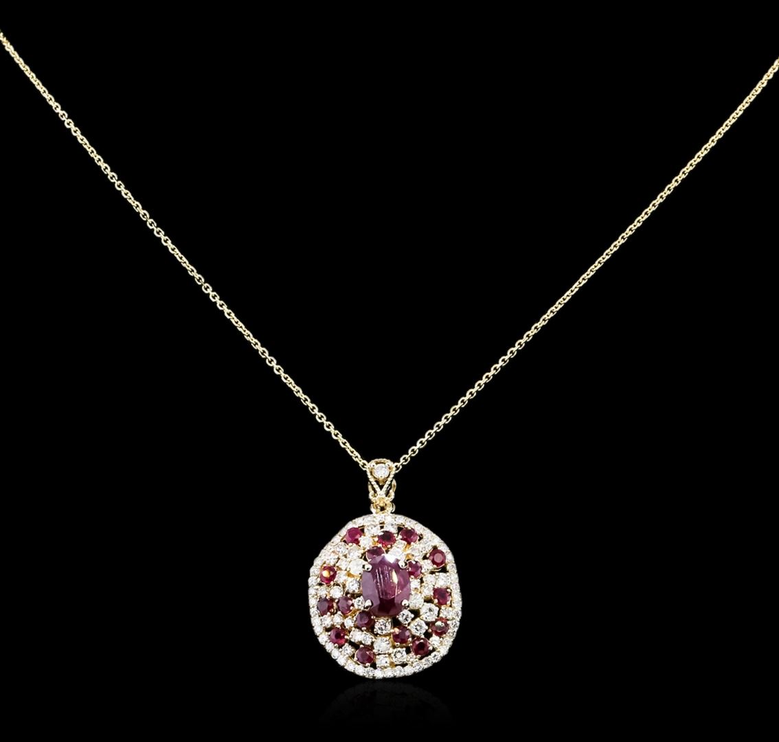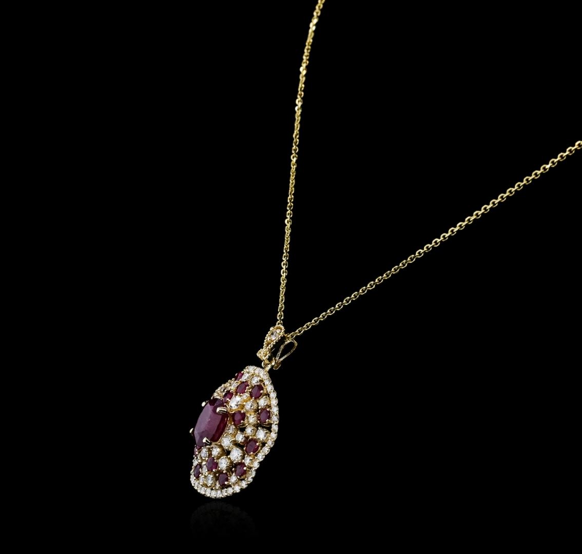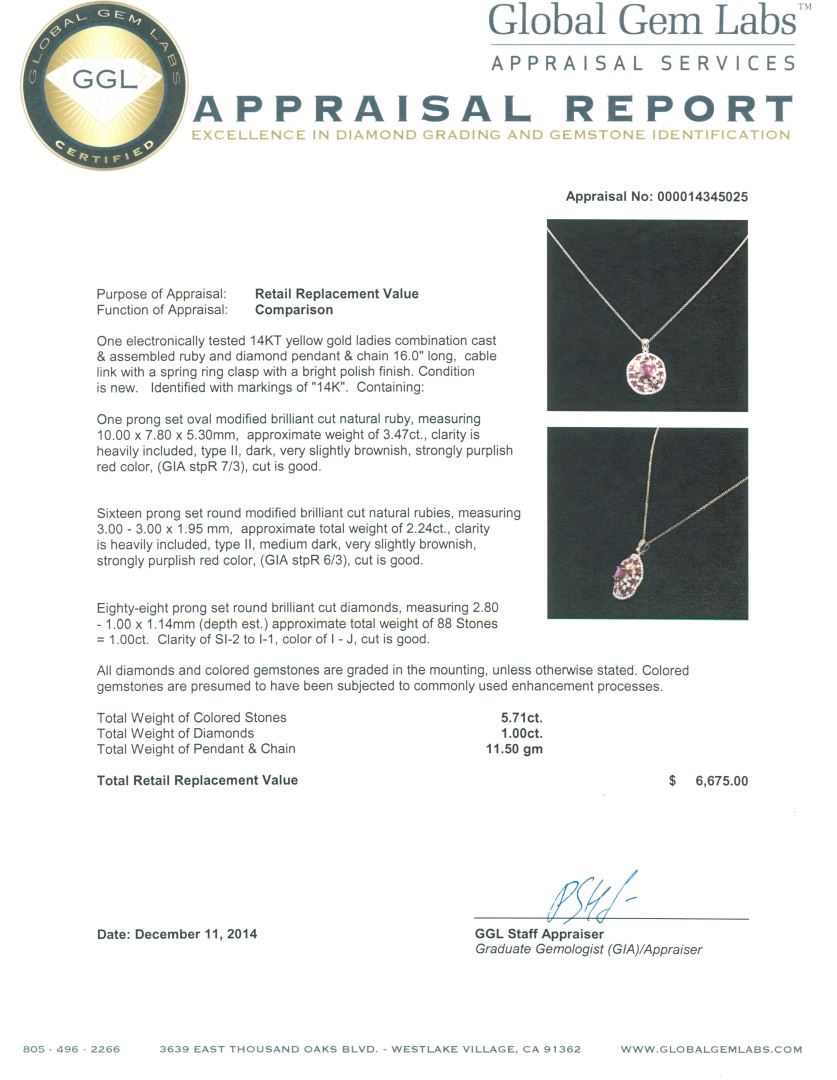 One electronically tested 14KT yellow gold ladies combination cast & assembled ruby and diamond pendant & chain 16.0" long, cable link with a spring ring clasp with a bright polish finish. Identified with markings of "14K". Condition is new. Containing: One prong set oval modified brilliant cut natural ruby, measuring 10.00 x 7.80 x 5.30mm, approximate weight of 3.47ct., clarity is heavily included, type II, dark, very slightly brownish, strongly purplish red color, (GIA stpR 7/3), cut is good. Sixteen prong set round modified brilliant cut natural rubies, measuring 3.00 - 3.00 x 1.95 mm, approximate total weight of 2.24ct., clarity is heavily included, type II, medium dark, very slightly brownish, strongly purplish red color, (GIA stpR 6/3), cut is good. Eighty-Eight prong set round brilliant cut diamonds, measuring 2.80 - 1.00 x 1.14mm (depth est.) approximate total weight of 88 Stones = 1.00ct. Clarity: SI-2 to I-1. Color: I - J, Cut is Good. All diamonds and colored gemstones are graded in the mounting, unless otherwise stated. Colored gemstones are presumed to have been subjected to commonly used enhancement processes. Total Weight of Colored Stones 5.71ct. Total Weight of Diamonds 1.00ct. Total Weight of Pendant & Chain 11.50 grams. GGL Appraised at $6,675.00.