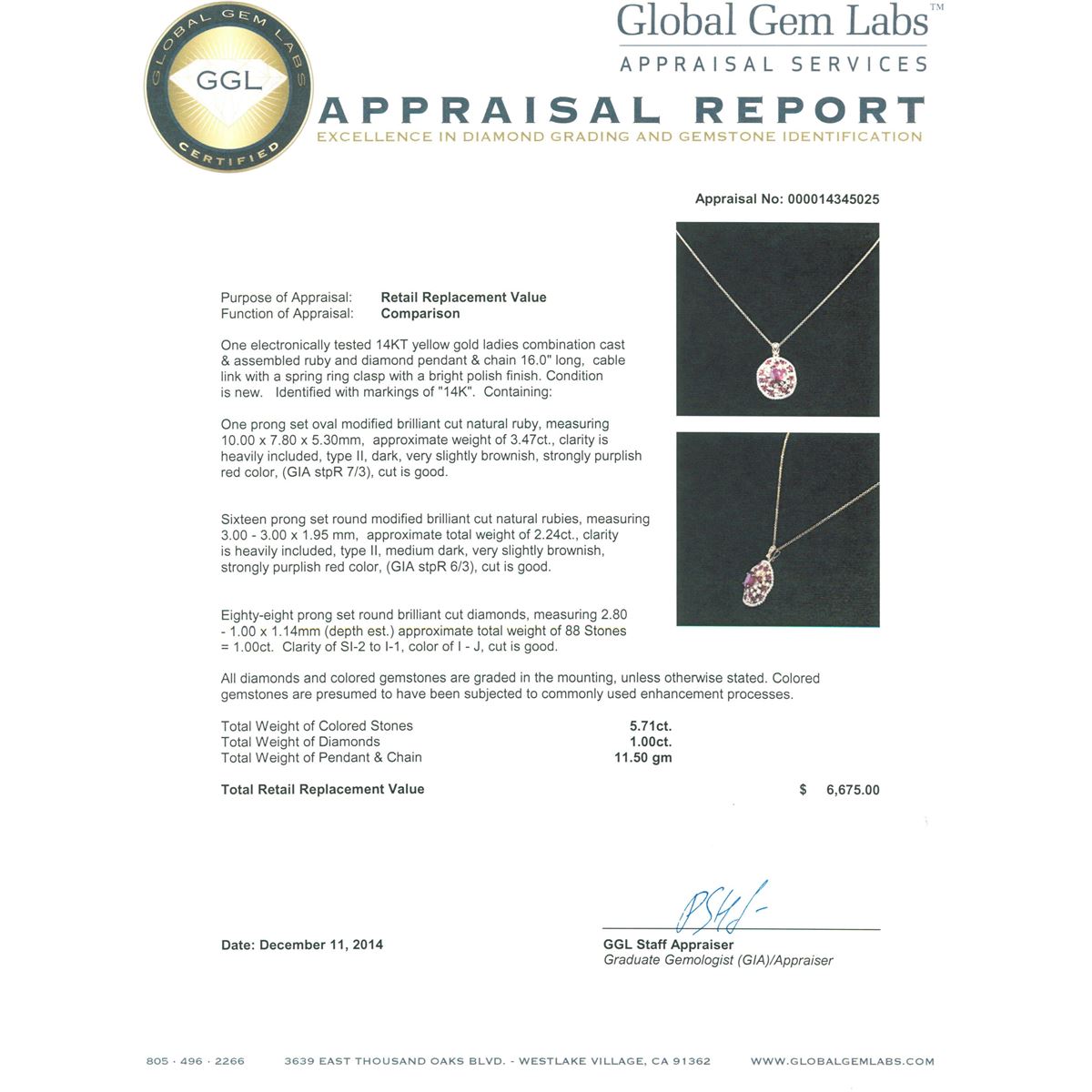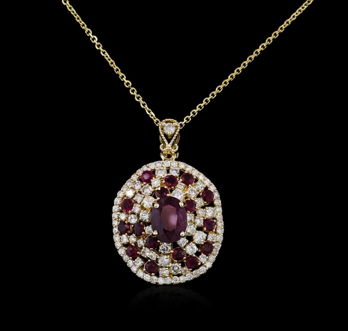 One electronically tested 14KT yellow gold ladies combination cast & assembled ruby and diamond pendant & chain 16.0" long, cable link with a spring ring clasp with a bright polish finish. Identified with markings of "14K". Condition is new. Containing: One prong set oval modified brilliant cut natural ruby, measuring 10.00 x 7.80 x 5.30mm, approximate weight of 3.47ct., clarity is heavily included, type II, dark, very slightly brownish, strongly purplish red color, (GIA stpR 7/3), cut is good. Sixteen prong set round modified brilliant cut natural rubies, measuring 3.00 - 3.00 x 1.95 mm, approximate total weight of 2.24ct., clarity is heavily included, type II, medium dark, very slightly brownish, strongly purplish red color, (GIA stpR 6/3), cut is good. Eighty-Eight prong set round brilliant cut diamonds, measuring 2.80 - 1.00 x 1.14mm (depth est.) approximate total weight of 88 Stones = 1.00ct. Clarity: SI-2 to I-1. Color: I - J, Cut is Good. All diamonds and colored gemstones are graded in the mounting, unless otherwise stated. Colored gemstones are presumed to have been subjected to commonly used enhancement processes. Total Weight of Colored Stones 5.71ct. Total Weight of Diamonds 1.00ct. Total Weight of Pendant & Chain 11.50 grams. GGL Appraised at $6,675.00.