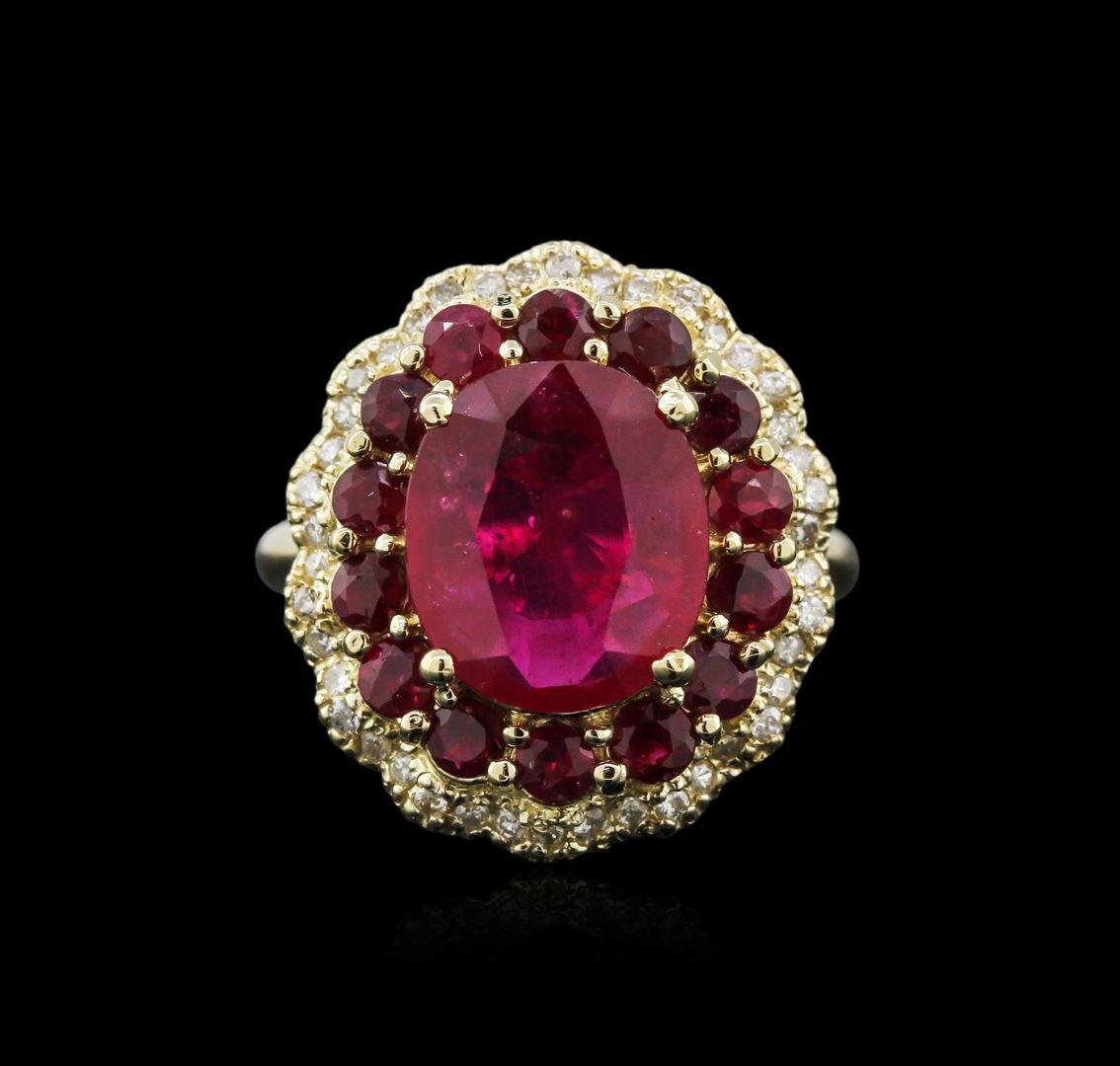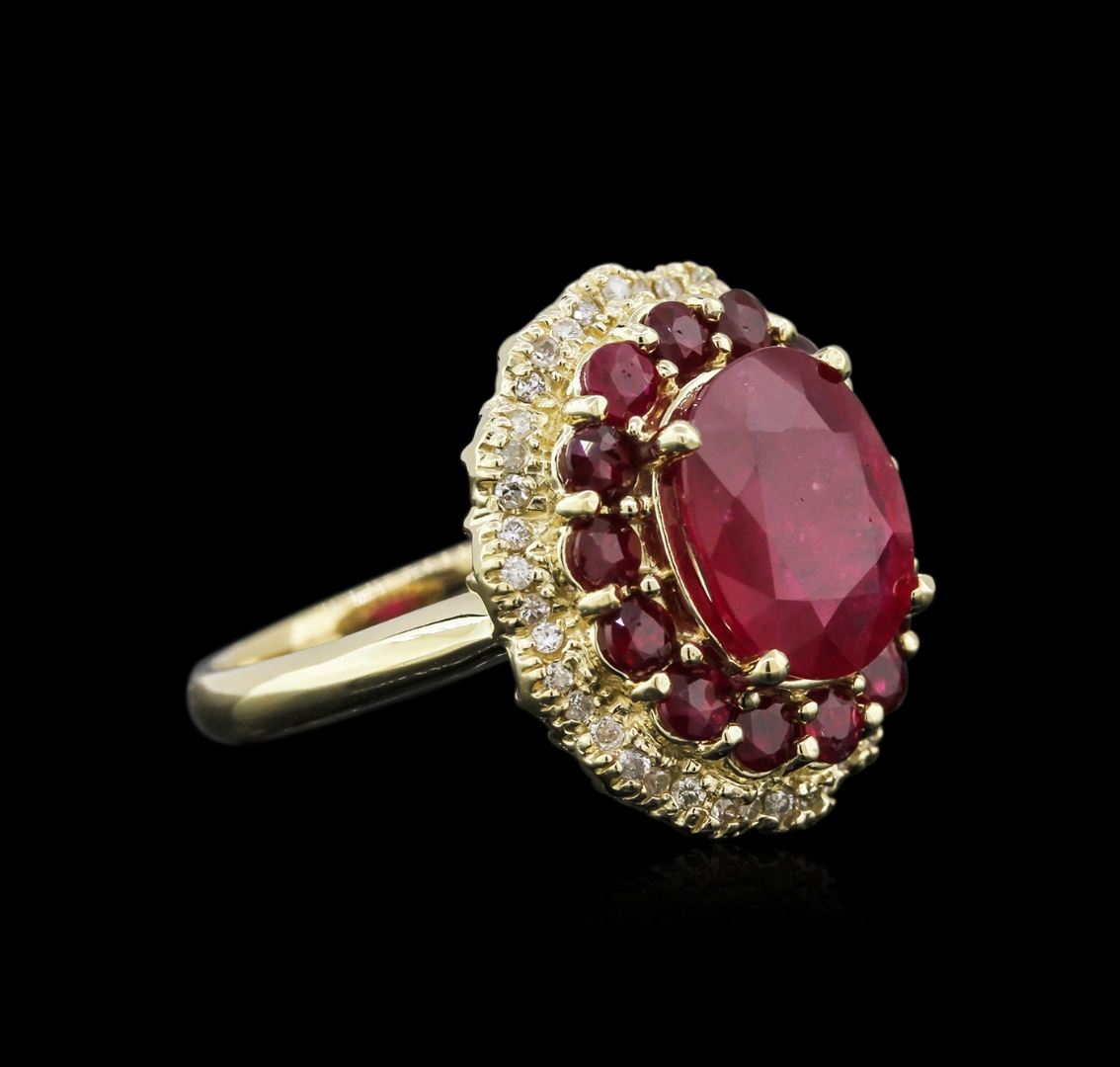 One electronically tested 14KT yellow gold ladies cast ruby and diamond ring with a flat shank with rounded edges with a bright polish finish. Identified with markings of "K14". Condition is new. Containing: One prong set oval modified brilliant cut natural ruby, measuring 11.12 x 9.73 x 4.60mm, exact weight 4.17ct., clarity is heavily included, type II, medium, moderately strong, strongly purplish red color, (GIA stpR 5/4), cut is good. Fourteen prong set round modified brilliant cut natural rubies, measuring 2.50 - 2.50 x 1.63 mm, exact total weight 1.54ct., clarity is heavily included, type II, medium dark, very slightly brownish, strongly purplish red color, (GIA stpR 6/3), cut is good. Forty-Two prong set round brilliant cut diamonds, measuring 1.30 - 1.30 x 0.78mm (depth est.) approximate total weight of 42 Stones = 0.30ct. Clarity: I-1 to I-2. Color: J - K, Cut is Good. All diamonds and colored gemstones are graded in the mounting, unless otherwise stated. Colored gemstones are presumed to have been subjected to commonly used enhancement processes. Total Weight of Colored Stones 5.71ct. Total Weight of Diamonds 0.30ct. Total Weight of Ring 9.10 grams. GGL Appraised at $3,090.00.