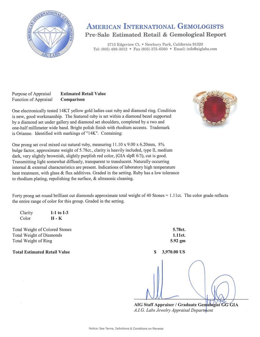 One electronically tested 14KT yellow gold ladies cast ruby and diamond ring. The featured ruby is set within a diamond bezel supported by a diamond set under gallery and diamond set shoulders, completed by a two and one-half millimeter wide band. Bright polish finish with rhodium accents. Trademark is Orianne. Identified with markings of "14K". Condition is new, good workmanship. Containing: One prong set oval mixed cut natural ruby, measuring 11.10 x 9.00 x 6.20mm, 8%. bulge factor, approximate weight of 5.78ct., clarity is heavily included, type II, medium dark, very slightly brownish, slightly purplish red color, (GIA slpR 6/3), cut is good. Transmitting light somewhat diffusely, transparent to translucent. Naturally occurring internal & external characteristics are present. Indications of laboratory high temperature heat treatment, with glass & flux additives. Graded in the setting. Ruby has a low tolerance to rhodium plating, repolishing the surface, & ultrasonic cleaning. Forty prong set round brilliant cut diamonds approximate total weight of 40 Stones = 1.11ct. The color grade reflects the entire range of color for this group. Graded in the setting. Clarity: I-1 to I-3. Color: H - K. Total Weight of Colored Stones 5.78ct. Total Weight of Diamonds 1.11ct. Total Weight of Ring 5.92gm. AIG Appraised at $3,970.00.