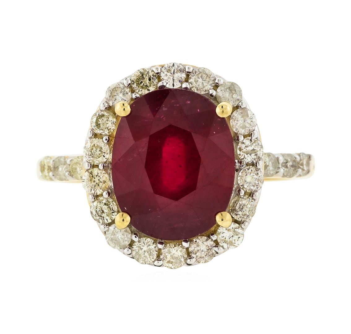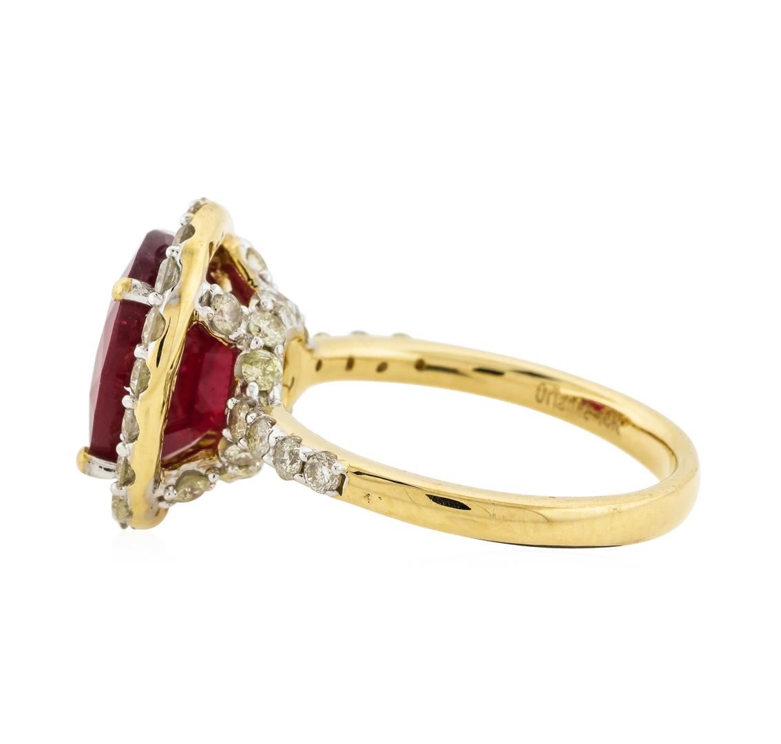 One electronically tested 14KT yellow gold ladies cast ruby and diamond ring. The featured ruby is set within a diamond bezel supported by a diamond set under gallery and diamond set shoulders, completed by a two and one-half millimeter wide band. Bright polish finish with rhodium accents. Trademark is Orianne. Identified with markings of "14K". Condition is new, good workmanship. Containing: One prong set oval mixed cut natural ruby, measuring 11.10 x 9.00 x 6.20mm, 8%. bulge factor, approximate weight of 5.78ct., clarity is heavily included, type II, medium dark, very slightly brownish, slightly purplish red color, (GIA slpR 6/3), cut is good. Transmitting light somewhat diffusely, transparent to translucent. Naturally occurring internal & external characteristics are present. Indications of laboratory high temperature heat treatment, with glass & flux additives. Graded in the setting. Ruby has a low tolerance to rhodium plating, repolishing the surface, & ultrasonic cleaning. Forty prong set round brilliant cut diamonds approximate total weight of 40 Stones = 1.11ct. The color grade reflects the entire range of color for this group. Graded in the setting. Clarity: I-1 to I-3. Color: H - K. Total Weight of Colored Stones 5.78ct. Total Weight of Diamonds 1.11ct. Total Weight of Ring 5.92gm. AIG Appraised.