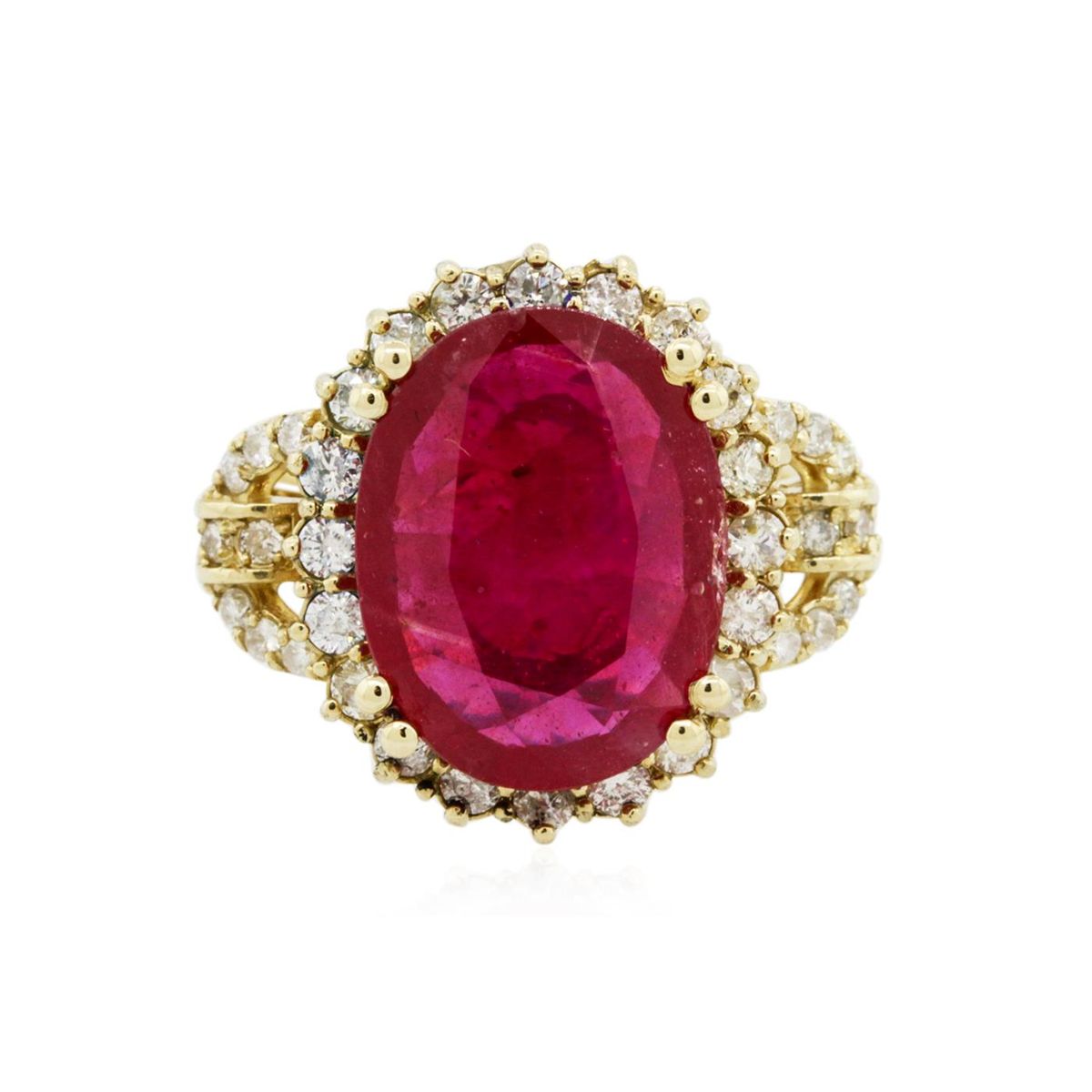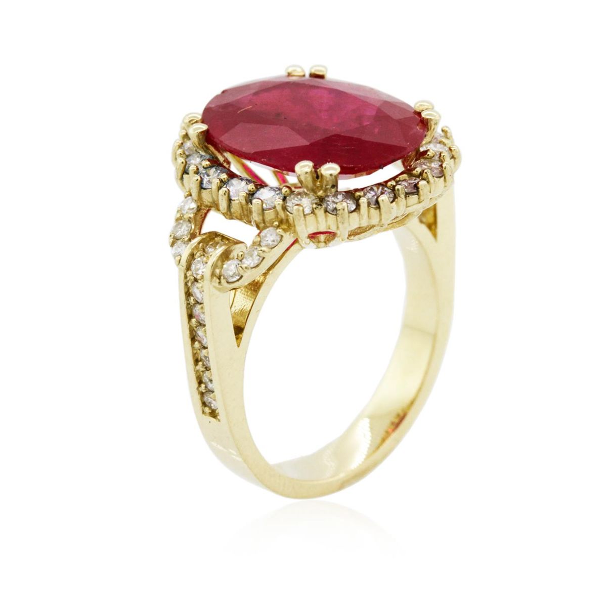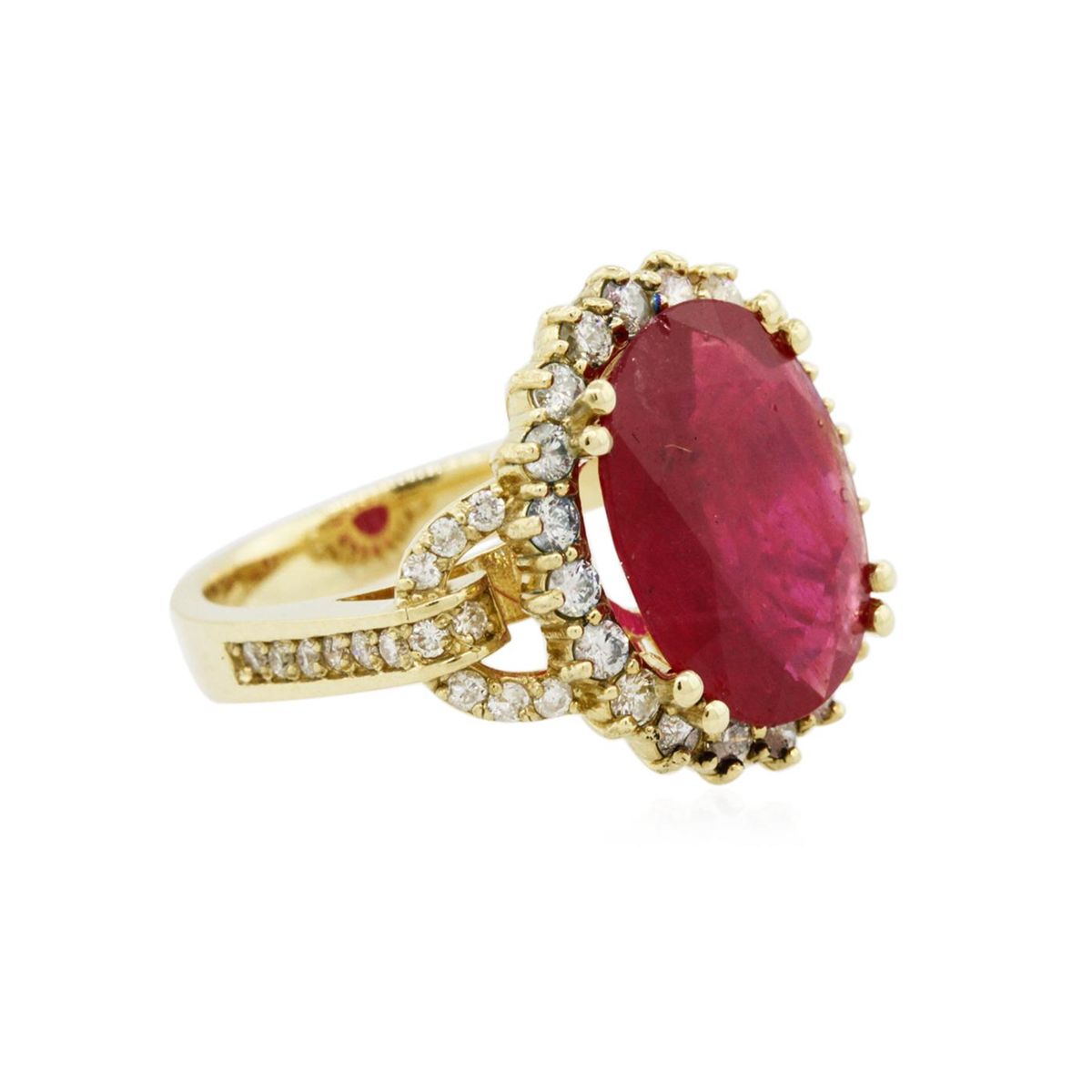 One electronically tested 14KT yellow gold ladies cast ruby and diamond ring with a bright polish finish. The featured ruby is set within a diamond bezel supported by diamond set shoulders, completed by a three and one-half millimeter wide band. Identified with markings of "K14". Condition is new, good workmanship. Containing: One prong set oval mixed cut natural ruby, measuring 15.00 x 11.50 x 3.85mm, 8%. bulge factor, approximate weight of 5.84ct., clarity is heavily included, type II, medium dark, moderately strong, red color, (GIA R 6/4), cut is good. Transmitting light somewhat diffusely, transparent to translucent. Naturally occurring internal & external characteristics are present. Indications of laboratory high temperature heat treatment, with glass & flux additives. Graded in the setting. Ruby has a low tolerance to rhodium plating, repolishing the surface, & ultrasonic cleaning. Forty-Eight prong and channel set round brilliant cut diamonds, measuring 2.10 - 1.60 x 1.11mm (depth est.) approximate total weight of 48 Stones = 1.21ct. Graded in the setting. Clarity: I-1 to I-2. Color: H - J. Total Weight of Colored Stones 5.84ct. Total Weight of Diamonds 1.21ct. Total Weight of Ring 8.50 grams. AIG Appraised at $5,260.00.