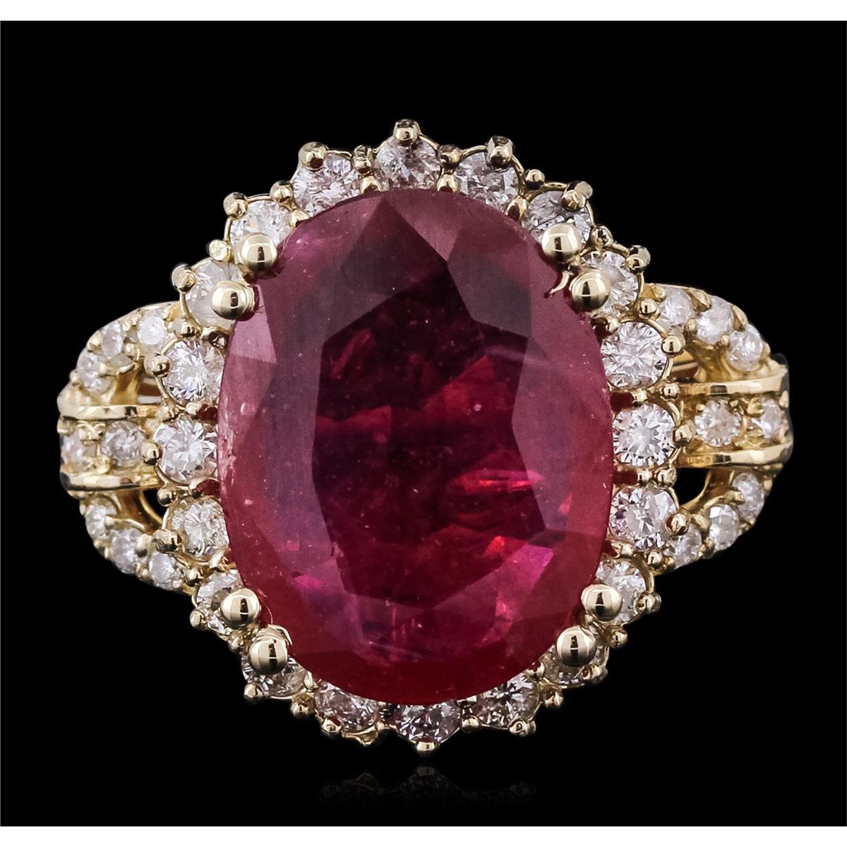 One electronically tested 14KT yellow gold ladies cast ruby and diamond ring with a bright polish finish. The featured ruby is set within a diamond bezel supported by diamond set shoulders, completed by a three and one-half millimeter wide band. Identified with markings of "K14". Condition is new, good workmanship. Containing: One prong set oval mixed cut natural ruby, measuring 15.00 x 11.50 x 3.85mm, 8%. bulge factor, approximate weight of 5.84ct., clarity is heavily included, type II, medium dark, moderately strong, red color, (GIA R 6/4), cut is good. Transmitting light somewhat diffusely, transparent to translucent. Naturally occurring internal & external characteristics are present. Indications of laboratory high temperature heat treatment, with glass & flux additives. Graded in the setting. Ruby has a low tolerance to rhodium plating, repolishing the surface, & ultrasonic cleaning. Forty-Eight prong and channel set round brilliant cut diamonds, measuring 2.10 - 1.60 x 1.11mm (depth est.) approximate total weight of 48 Stones = 1.21ct. Graded in the setting. Clarity: I-1 to I-2. Color: H - J. Total Weight of Colored Stones 5.84ct. Total Weight of Diamonds 1.21ct. Total Weight of Ring 8.50 grams. AIG Appraised at $5,260.00.