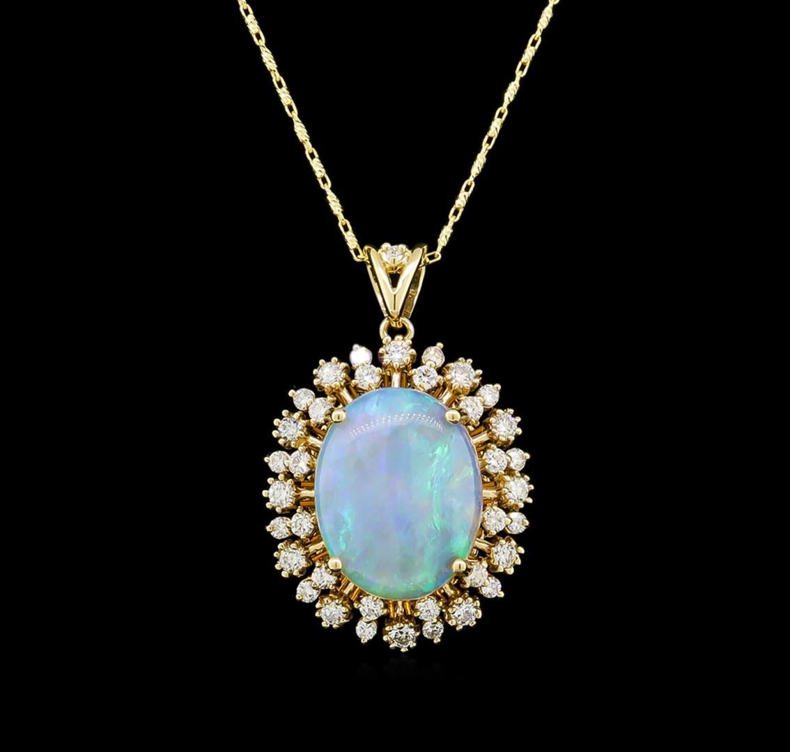 One electronically tested 14KT yellow gold ladies cast opal and diamond pendant & chain 18.0" long, with a lobster claw clasp with a bright polish finish. Identified with markings of "14K". Condition is new. Containing: One white opal that is cut in a oval shape and is prong set, measuring 16.00 mm long x 13.00 mm wide, and 6.50 mm thick and the approximate weight is 5.88 carats. The opal has a somewhat bright, green-blue play of color (fire) in a flashfire pattern; a medium dome; a good cut; no inclusions; consistent in its brightness and pattern; and is somewhat directional. Thirty-Seven prong set round brilliant cut diamonds, measuring 2.00 - 1.80 x 1.14mm (depth est.) approximate total weight of 37 Stones = 0.93ct. Clarity of SI-1 to I-1, Color of I - J, Cut is Good. Colored gemstones are presumed to have been subjected to commonly used enhancement processes. All diamonds and colored gemstones are graded in the mounting, unless otherwise stated. Total Weight of Diamonds 0.93ct. Total Weight of Opals 5.88ct. Total Weight of Pendant & Chain 8.20 grams. GGL Appraised at $4,350.00.