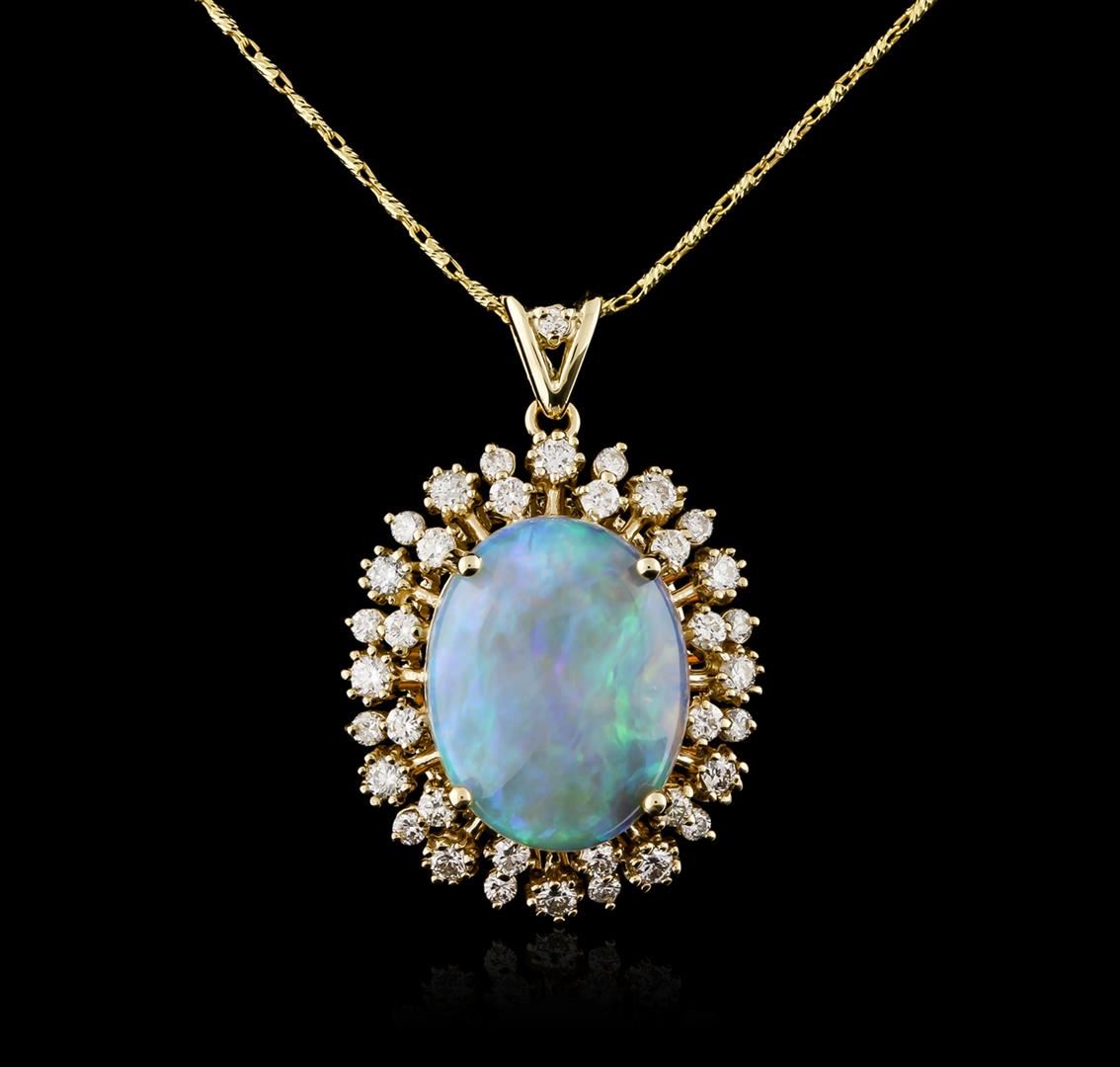 One electronically tested 14KT yellow gold ladies cast opal and diamond pendant & chain 18.0" long, with a lobster claw clasp with a bright polish finish. Identified with markings of "14K". Condition is new. Containing: One white opal that is cut in a oval shape and is prong set, measuring 16.00 mm long x 13.00 mm wide, and 6.50 mm thick and the approximate weight is 5.88 carats. The opal has a somewhat bright, green-blue play of color (fire) in a flashfire pattern; a medium dome; a good cut; no inclusions; consistent in its brightness and pattern; and is somewhat directional. Thirty-Seven prong set round brilliant cut diamonds, measuring 2.00 - 1.80 x 1.14mm (depth est.) approximate total weight of 37 Stones = 0.93ct. Clarity of SI-1 to I-1, Color of I - J, Cut is Good. Colored gemstones are presumed to have been subjected to commonly used enhancement processes. All diamonds and colored gemstones are graded in the mounting, unless otherwise stated. Total Weight of Diamonds 0.93ct. Total Weight of Opals 5.88ct. Total Weight of Pendant & Chain 8.20 grams. GGL Appraised at $4,350.00.