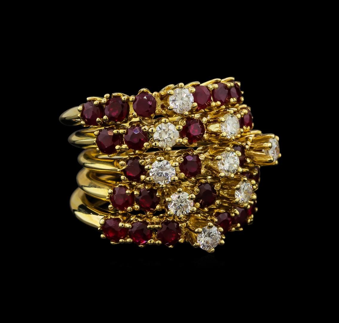 One electronically tested 14KT yellow gold ladies cast ruby and diamond ring with a bright polish finish. Identified with markings of "14K". Condition is new. Containing: Twenty-six prong set round modified brilliant cut natural rubies, measuring 3.50 - 3.50 x 2.27 mm, approximate total weight of 5.98ct., clarity is eye clean, type II, medium, moderately strong, red color, (GIA R 5/4), cut is good. Nine prong set round brilliant cut diamonds, measuring 3.00 - 3.00 x 1.80mm (depth est.) approximate total weight of 9 Stones = 0.89ct. Clarity: SI-2 to I-1. Color: G - H, Cut is Good. Colored gemstones are presumed to have been subjected to commonly used enhancement processes. All diamonds and colored gemstones are graded in the mounting, unless otherwise stated. Total Weight of Colored Stones 5.98ct. Total Weight of Diamonds 0.89ct. Total Weight of Ring 21.20 grams. GGL Appraised at $4,870.00.