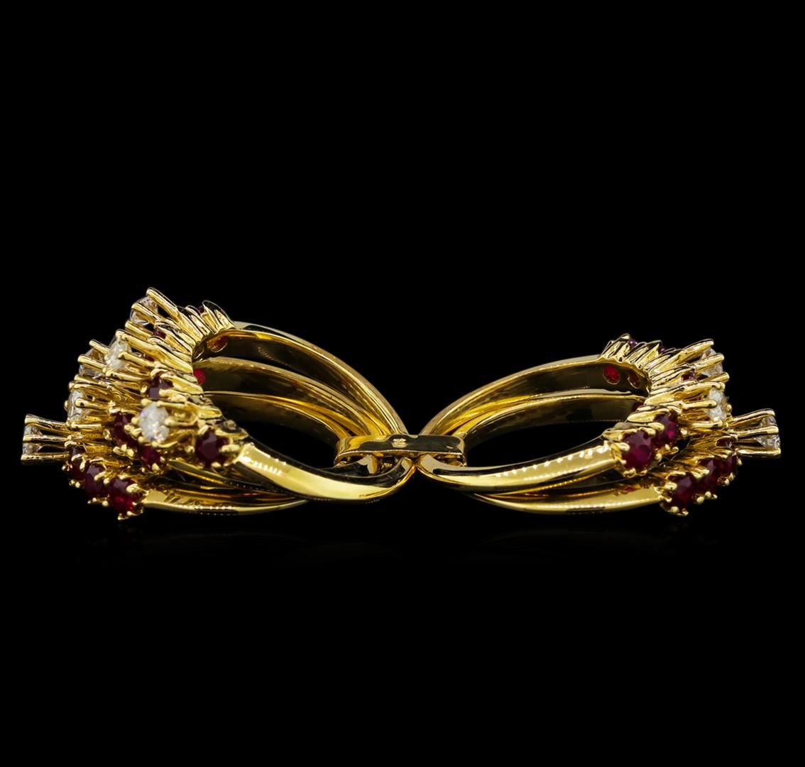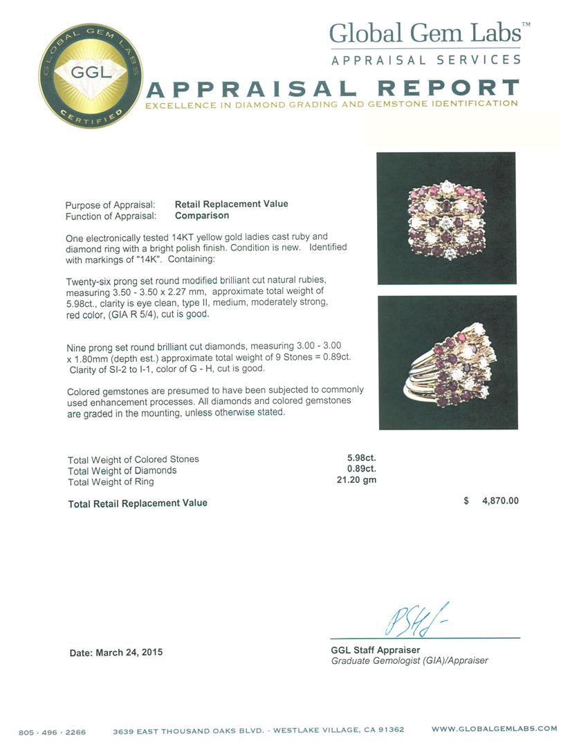 One electronically tested 14KT yellow gold ladies cast ruby and diamond ring with a bright polish finish. Identified with markings of "14K". Condition is new. Containing: Twenty-six prong set round modified brilliant cut natural rubies, measuring 3.50 - 3.50 x 2.27 mm, approximate total weight of 5.98ct., clarity is eye clean, type II, medium, moderately strong, red color, (GIA R 5/4), cut is good. Nine prong set round brilliant cut diamonds, measuring 3.00 - 3.00 x 1.80mm (depth est.) approximate total weight of 9 Stones = 0.89ct. Clarity: SI-2 to I-1. Color: G - H, Cut is Good. Colored gemstones are presumed to have been subjected to commonly used enhancement processes. All diamonds and colored gemstones are graded in the mounting, unless otherwise stated. Total Weight of Colored Stones 5.98ct. Total Weight of Diamonds 0.89ct. Total Weight of Ring 21.20 grams. GGL Appraised at $4,870.00.