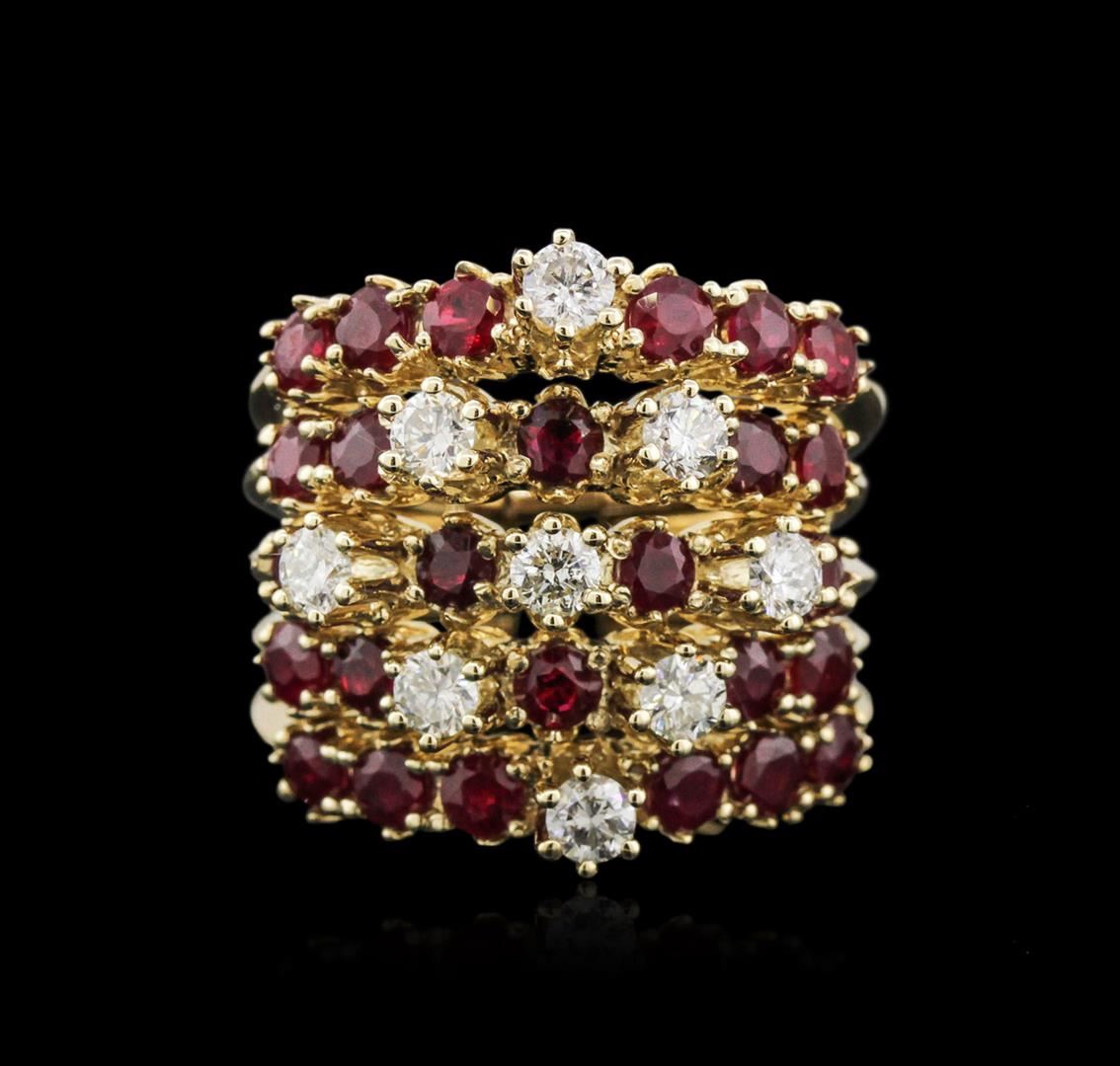One electronically tested 14KT yellow gold ladies cast ruby and diamond ring with a bright polish finish. Identified with markings of "14K". Condition is new. Containing: Twenty-six prong set round modified brilliant cut natural rubies, measuring 3.50 - 3.50 x 2.27 mm, approximate total weight of 5.98ct., clarity is eye clean, type II, medium, moderately strong, red color, (GIA R 5/4), cut is good. Nine prong set round brilliant cut diamonds, measuring 3.00 - 3.00 x 1.80mm (depth est.) approximate total weight of 9 Stones = 0.89ct. Clarity: SI-2 to I-1. Color: G - H, Cut is Good. Colored gemstones are presumed to have been subjected to commonly used enhancement processes. All diamonds and colored gemstones are graded in the mounting, unless otherwise stated. Total Weight of Colored Stones 5.98ct. Total Weight of Diamonds 0.89ct. Total Weight of Ring 21.20 grams. GGL Appraised at $4,870.00.