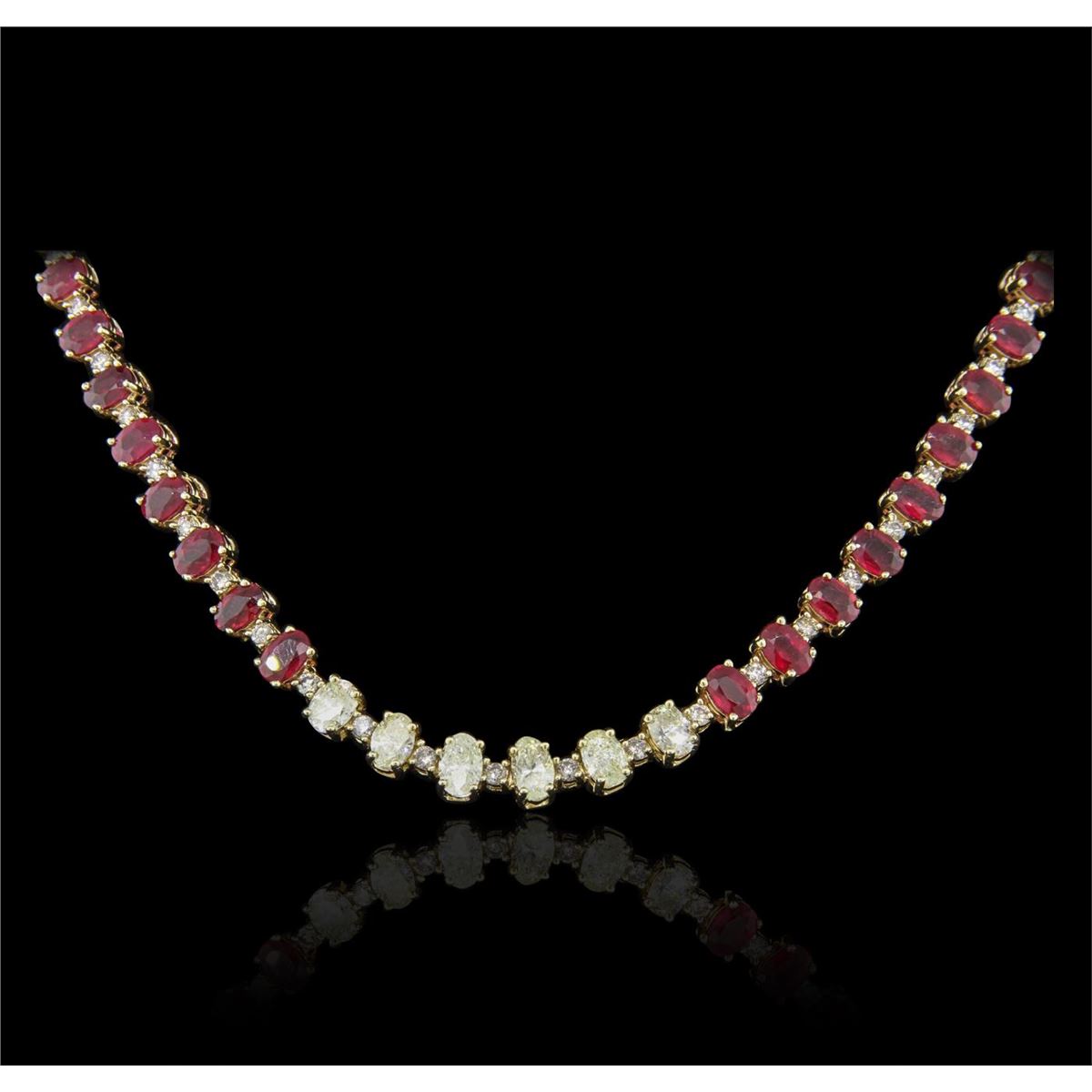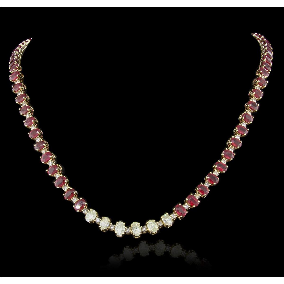 One electronically tested 14KT yellow gold ladies cast & assembled ruby and diamond necklace with a bright polish finish. Condition is new, good workmanship. Seventeen and one-half inch length necklace features a flexible ribbon consisting of oval shaped rubies and diamonds interspersed by round brilliant diamonds, terminating in a concealed clasp with safety. Identified with markings of "14K". Containing: Seventy-four prong set oval mixed cut natural rubies, measuring 6.20 x 4.50 x 2.60mm, 10%. bulge factor, approximate. Total Weight of 50.40ct., clarity is heavily included, type II, medium dark, very slightly brownish, slightly purplish red color, (GIA slpR 6/3), cut is good. Transmitting light somewhat diffusely, transparent to translucent. Naturally occurring internal & external characteristics are present. Indications of laboratory high temperature heat treatment, with glass & flux additives. Measurements & the color grade are an average for the group. Graded in the setting. Ruby has a low tolerance to rhodium plating, repolishing the surface, & ultrasonic cleaning. Six prong set oval shaped cut diamonds, measuring 6.20 x 4.50 x 2.85mm (depth est.), 10.00.%. GTCF approximate. Total Weight of 6 Stones = 3.41ct. The group is composed of a mix of faint and very light yellow natural color diamonds. Graded in the setting. Clarity: SI-2 to I-1 Thirty-One prong set round brilliant cut diamonds, measuring 2.50 - 2.30 x 1.44mm (depth est.) approximate. Total Weight of 31 Stones = 1.59ct. Faint brown secondary color throughout. Graded in the setting. Clarity: I-1 to I-3. Color: I - K. Total Weight of Colored Stones 50.40ct. Total Weight of Diamonds 5.00ct. Total Weight of Necklace 39.52 grams. AIG Appraised at $26,945.00.