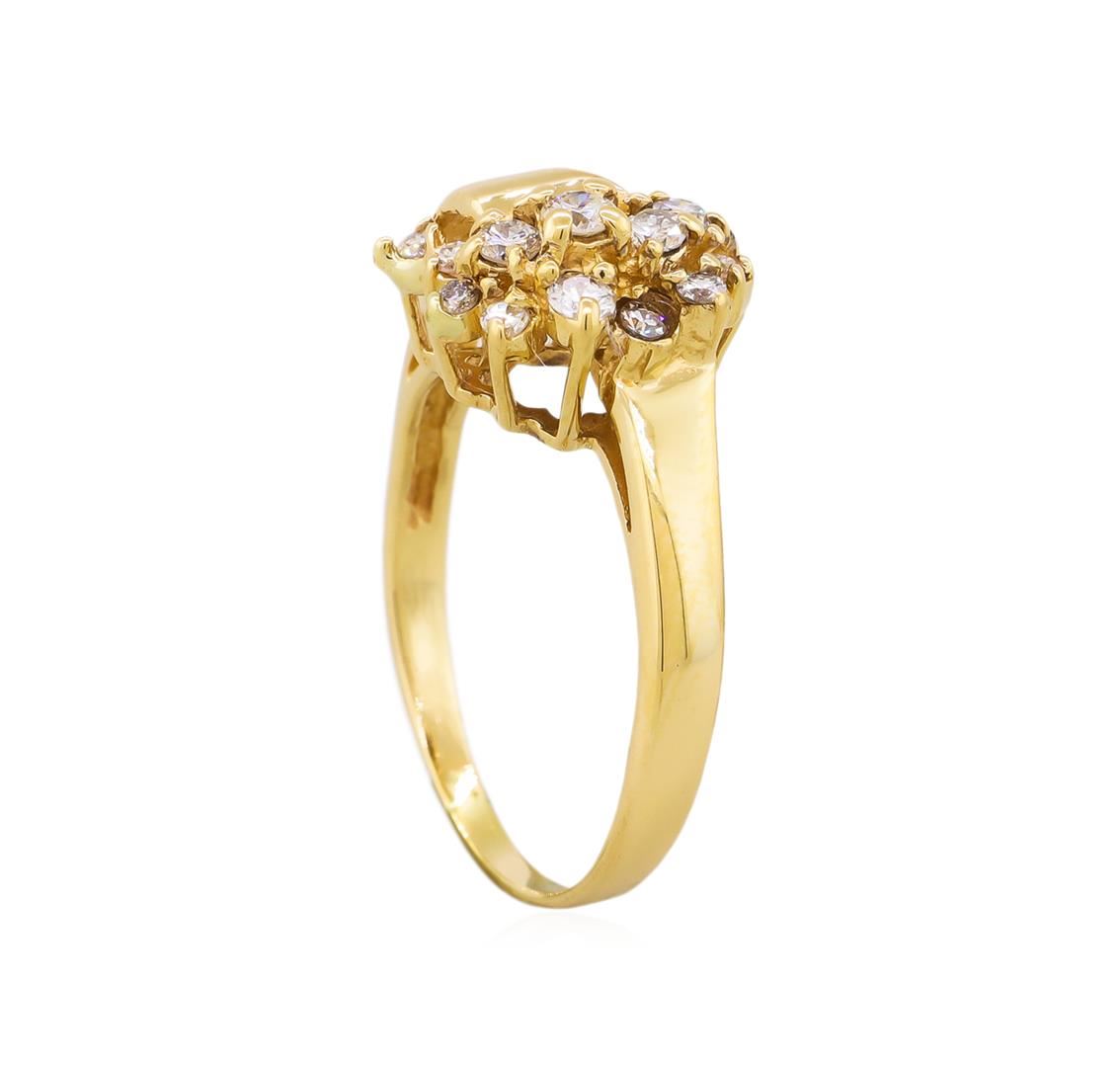 This ring is made of 14KT Yellow Gold weighing approximately 3.35 grams. There are approximately thirteen round cut diamonds with and total approximate weight of .50ctw. The ring is a size 6.75.