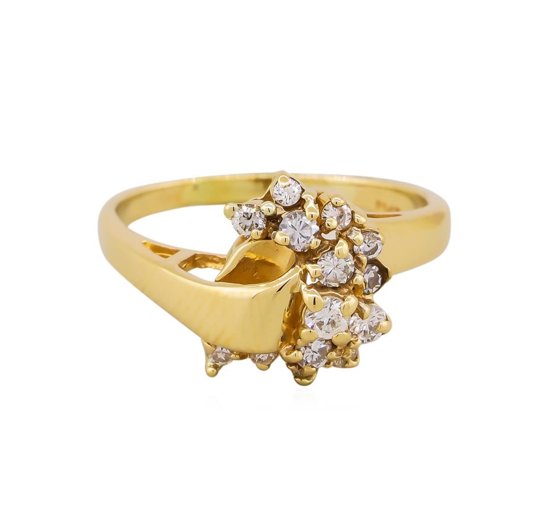 This ring is made of 14KT Yellow Gold weighing approximately 3.35 grams. There are approximately thirteen round cut diamonds with and total approximate weight of .50ctw. The ring is a size 6.75.
