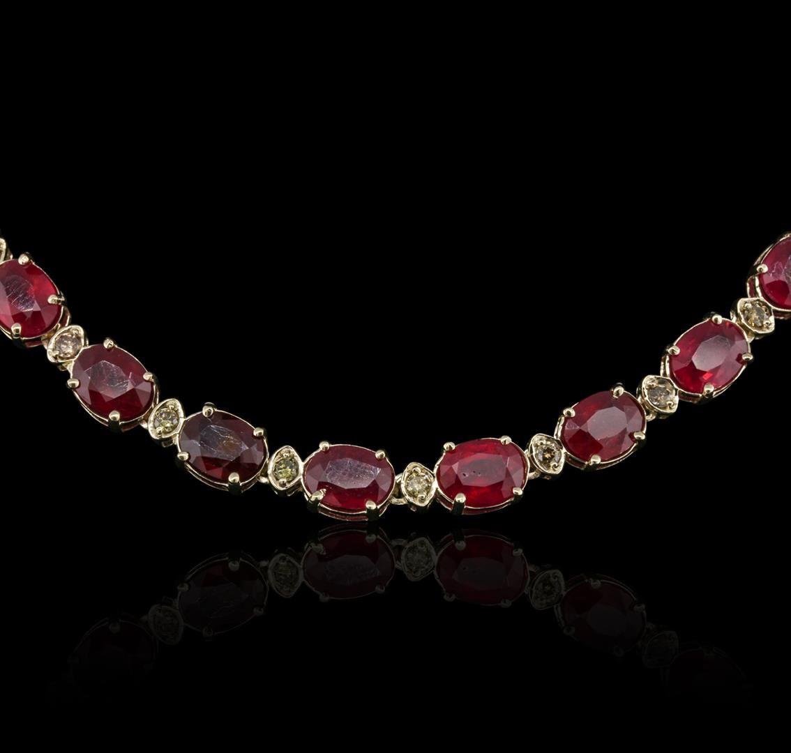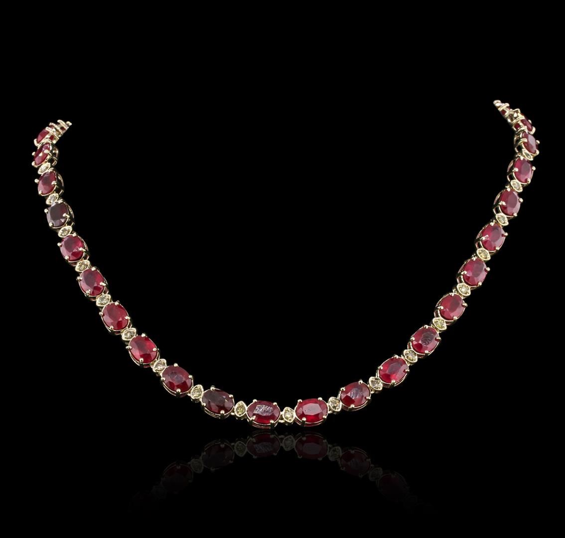 One electronically tested 14KT yellow gold ladies cast & assembled ruby and diamond necklace with a bright polish finish. Condition is new, good workmanship. Eighteen inch length necklace features a flexible ruby and diamond ribbon, terminating in a concealed clasp with twin safeties. Containing: Thirty-six prong set oval mixed cut natural rubies, measuring 7.50 x 6.00 x 4.00mm, approximate. Total Weight of 52.66ct., clarity is heavily included, type II, medium dark, very slightly brownish, slightly purplish red color, (GIA slpR 6/3), cut is good. Transmitting light somewhat diffusely, transparent to translucent. Naturally occurring internal & external characteristics are present. Indications of laboratory high temperature heat treatment, with glass & flux additives. Measurements & the color grade are an average for the group. Graded in the setting. Ruby has a low tolerance to rhodium plating, repolishing the surface, & ultrasonic cleaning. Thirty-Six prong set round brilliant cut diamonds, measuring 2.50 - 2.40 x 1.47mm (depth est.) approximate. Total Weight of 36 Stones = 2.03ct. Faint secondary color throughout. Graded in the setting. Clarity: SI-1 to I-1. Total Weight of Colored Stones 52.66ct. Total Weight of Diamonds 2.03ct. Total Weight of Necklace 40.98 grams. AIG Appraised at $20,760.00.
