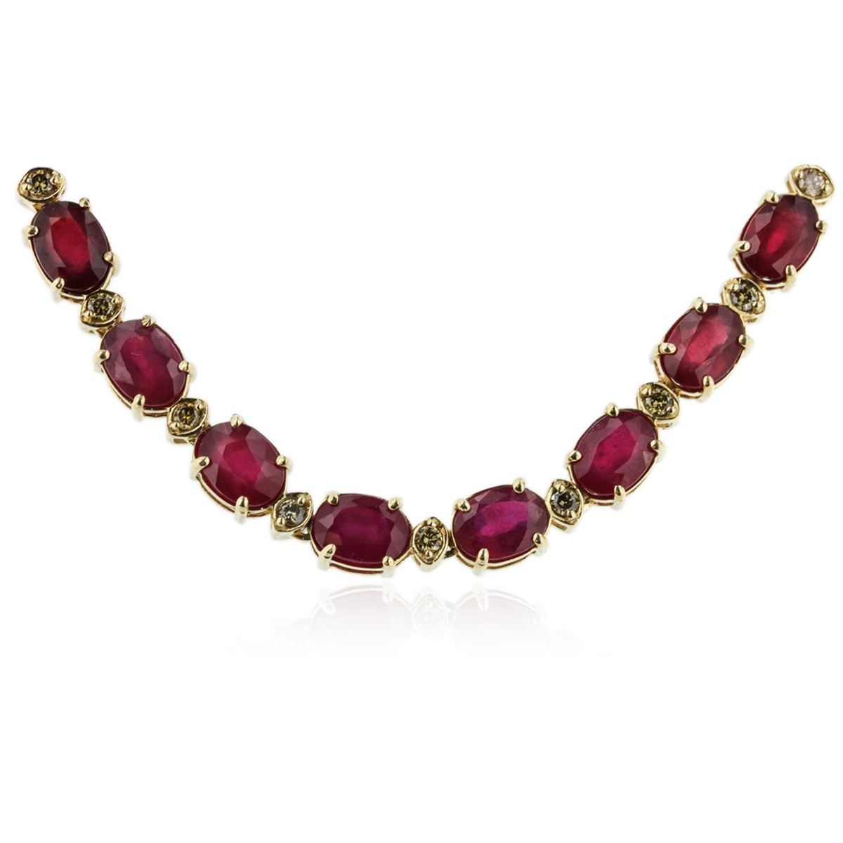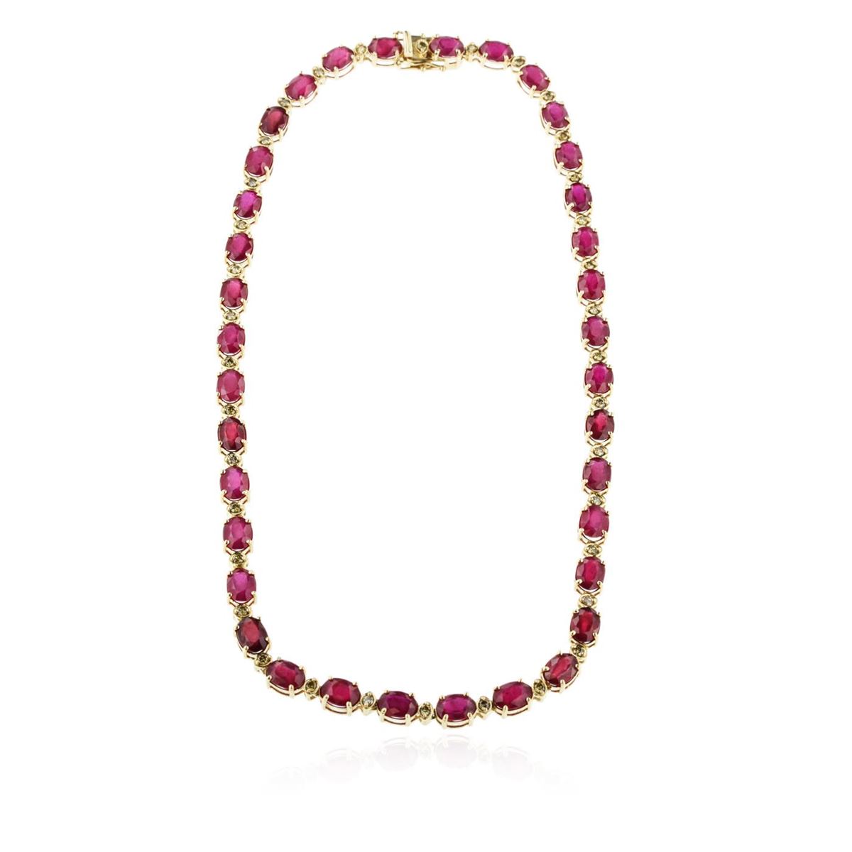 One electronically tested 14KT yellow gold ladies cast & assembled ruby and diamond necklace with a bright polish finish. Condition is new, good workmanship. Seventeen and three-quarter inch length necklace features a flexible ruby and diamond ribbon, terminating in a concealed clasp with twin safeties. Containing: Thirty-six prong set oval mixed cut natural rubies, measuring 7.50 x 6.00 x 4.00mm, approximate. Total Weight of 52.70ct., clarity is heavily included, type II, medium dark, very slightly brownish, slightly purplish red color, (GIA slpR 6/3), cut is good. Transmitting light somewhat diffusely, transparent to translucent. Naturally occurring internal & external characteristics are present. Indications of laboratory high temperature heat treatment, with glass & flux additives. Measurements & the color grade are an average for the group. Graded in the setting. Ruby has a low tolerance to rhodium plating, repolishing the surface, & ultrasonic cleaning. Thirty-Six prong set round brilliant cut diamonds, measuring 2.40 - 2.30 x 1.41mm (depth est.) approximate. Total Weight of 36 Stones = 1.90ct. Faint secondary color throughout. Graded in the setting. Clarity: SI-1 to I-1. Total Weight of Colored Stones 52.70ct. Total Weight of Diamonds 1.90ct. Total Weight of Necklace 42.80 grams. AIG Appraised at $20,895.00.
