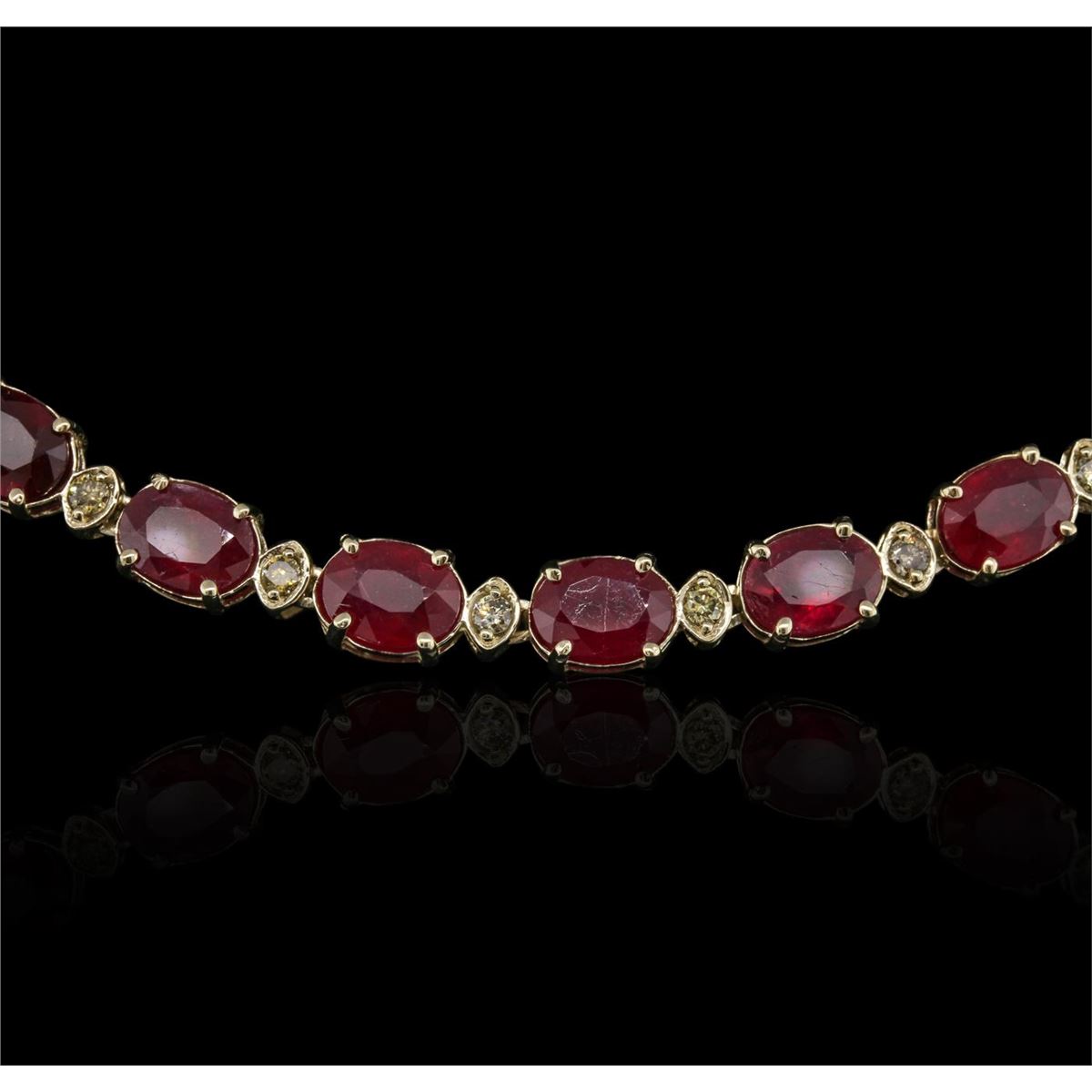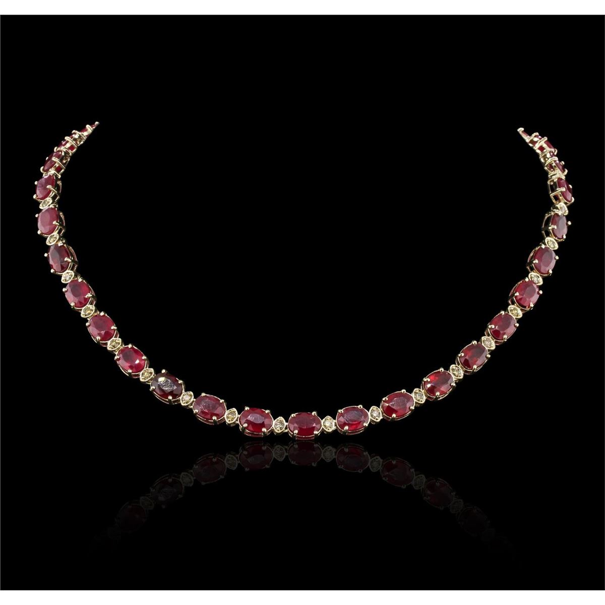 One electronically tested 14KT yellow gold ladies cast & assembled ruby and diamond necklace with a bright polish finish. Condition is new, good workmanship. Seventeen and three-quarter inch length necklace features a flexible ruby and diamond ribbon, terminating in a concealed clasp with twin safeties. Containing: Thirty-six prong set oval mixed cut natural rubies, measuring 7.50 x 6.00 x 4.00mm, approximate. Total Weight of 52.70ct., clarity is heavily included, type II, medium dark, very slightly brownish, slightly purplish red color, (GIA slpR 6/3), cut is good. Transmitting light somewhat diffusely, transparent to translucent. Naturally occurring internal & external characteristics are present. Indications of laboratory high temperature heat treatment, with glass & flux additives. Measurements & the color grade are an average for the group. Graded in the setting. Ruby has a low tolerance to rhodium plating, repolishing the surface, & ultrasonic cleaning. Thirty-Six prong set round brilliant cut diamonds, measuring 2.40 - 2.30 x 1.41mm (depth est.) approximate. Total Weight of 36 Stones = 1.90ct. Faint secondary color throughout. Graded in the setting. Clarity: SI-1 to I-1. Total Weight of Colored Stones 52.70ct. Total Weight of Diamonds 1.90ct. Total Weight of Necklace 42.80 grams. AIG Appraised at $20,895.00.