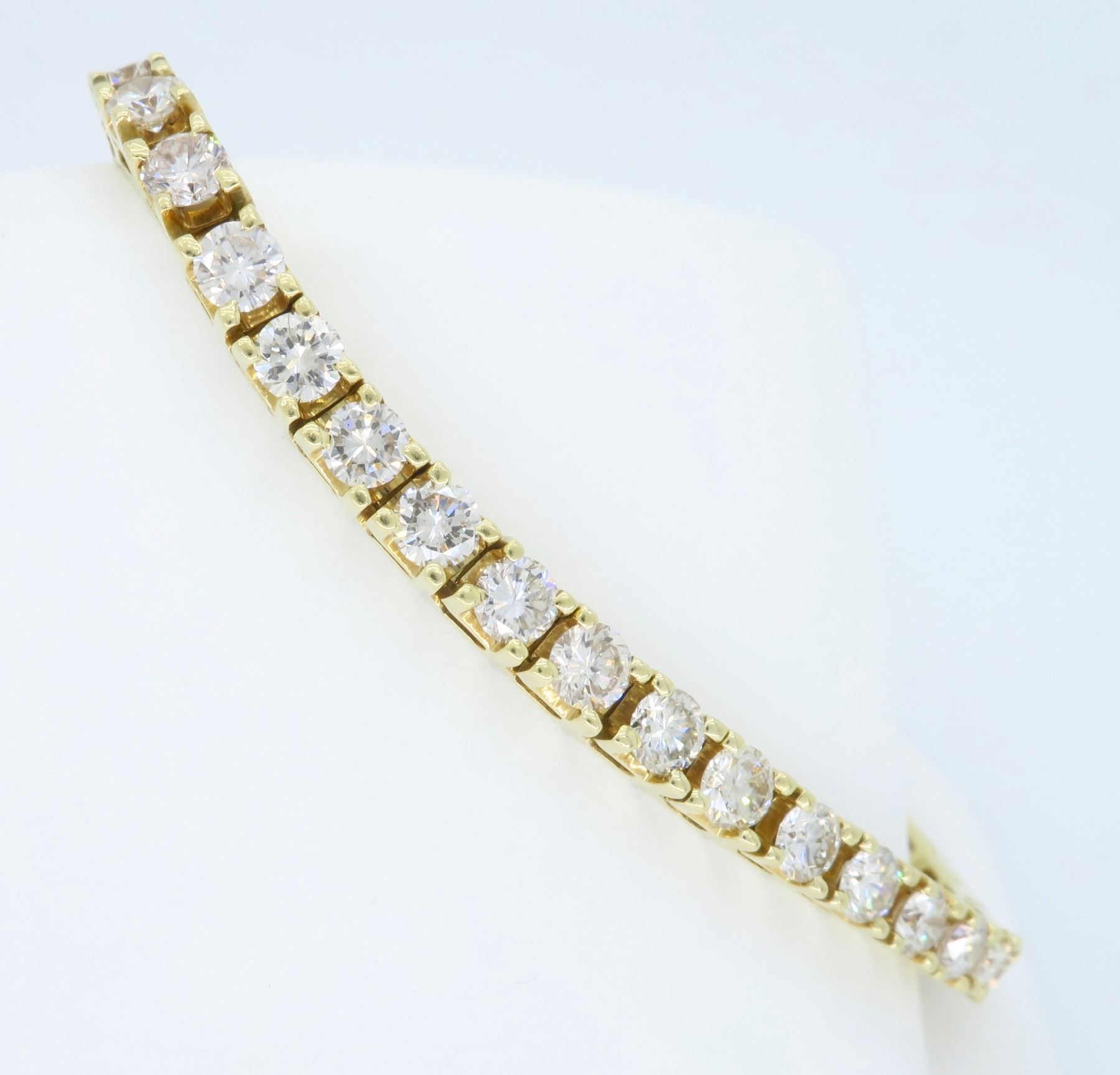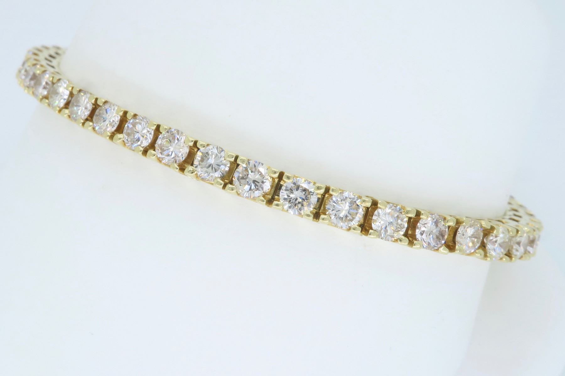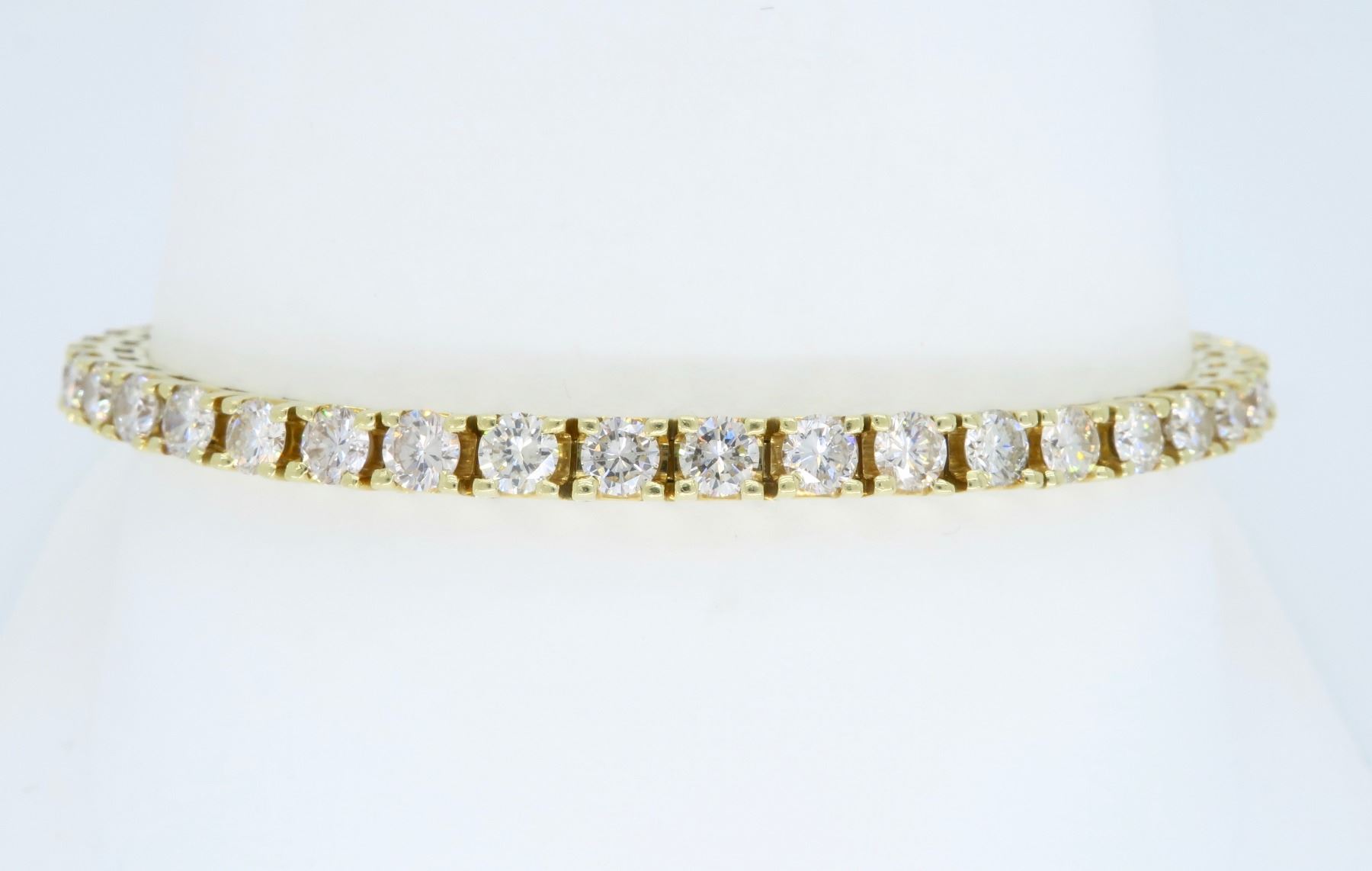 One 14KT Yellow Gold 6.00ctw Diamond Tennis Bracelet. (46) Round Diamonds with a total weight of 6.00cts with a color of I-K and clarity of VS-2 to SI-2. Total weight of this bracelet is 22 grams. Total length of this bracelet is 7 inches.
