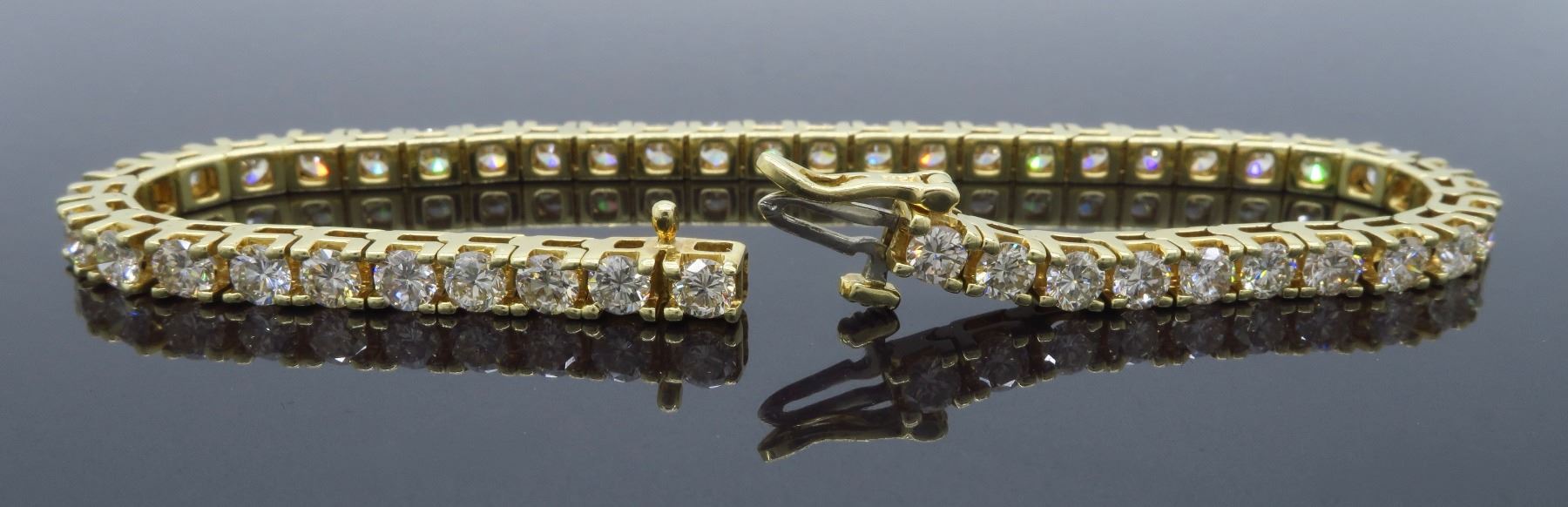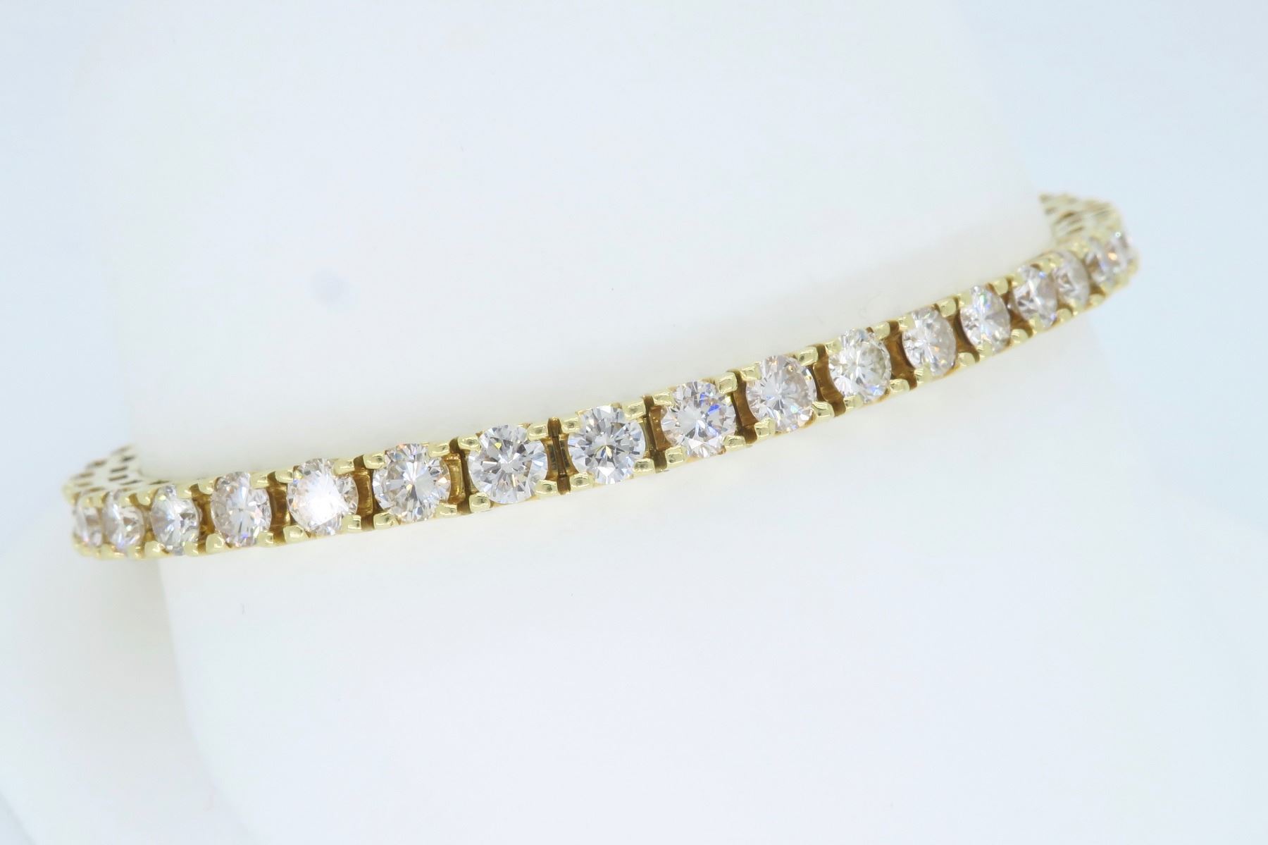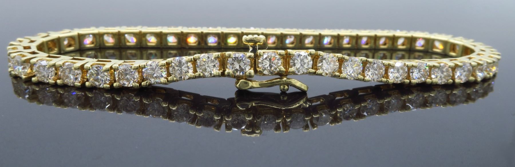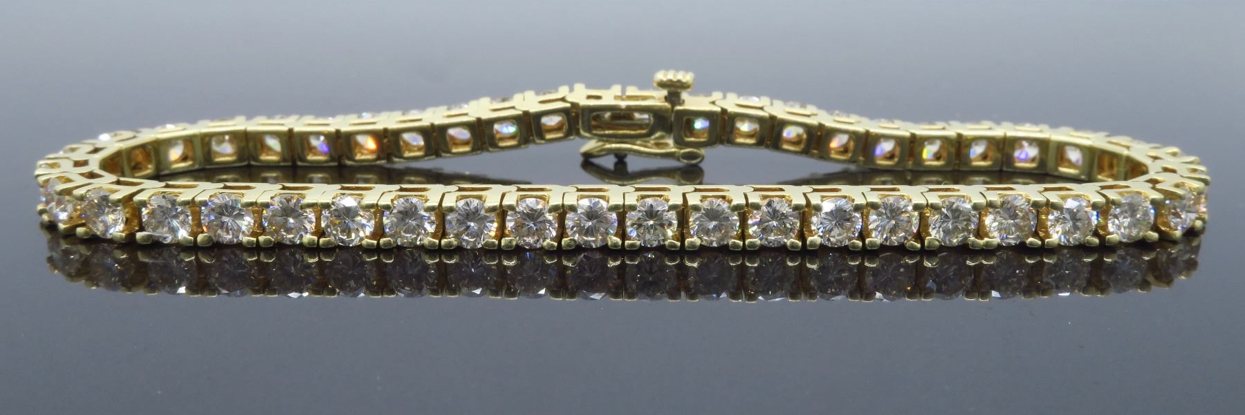 One 14KT Yellow Gold 6.00ctw Diamond Tennis Bracelet. (46) Round Diamonds with a total weight of 6.00cts with a color of I-K and clarity of VS-2 to SI-2. Total weight of this bracelet is 22 grams. Total length of this bracelet is 7 inches.