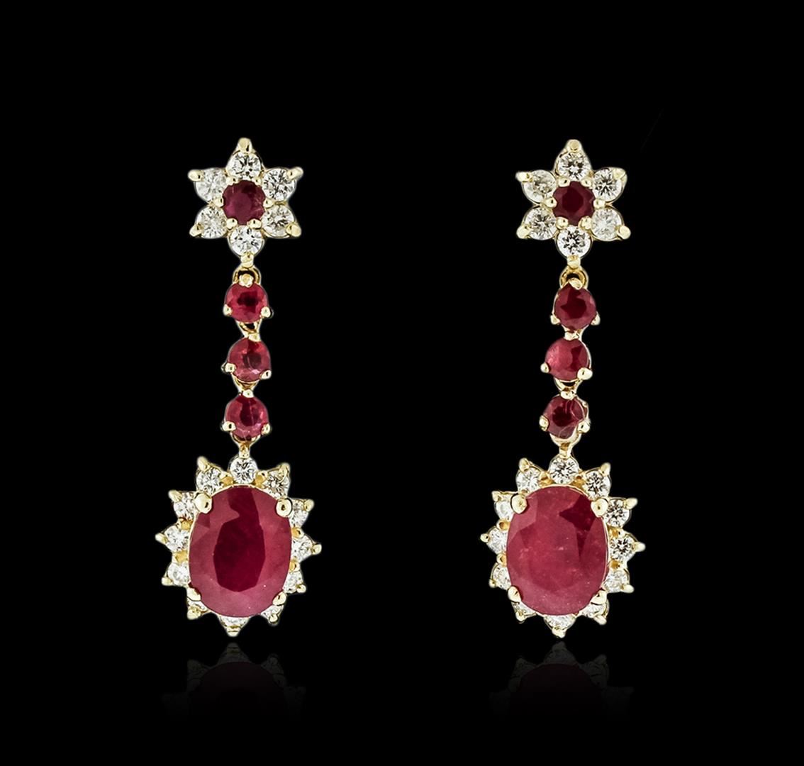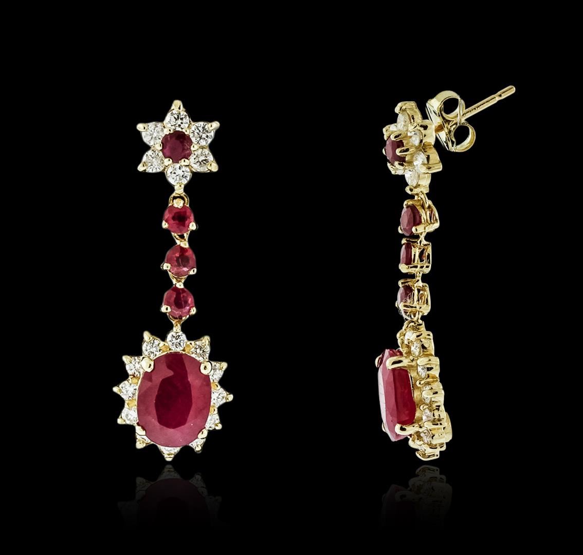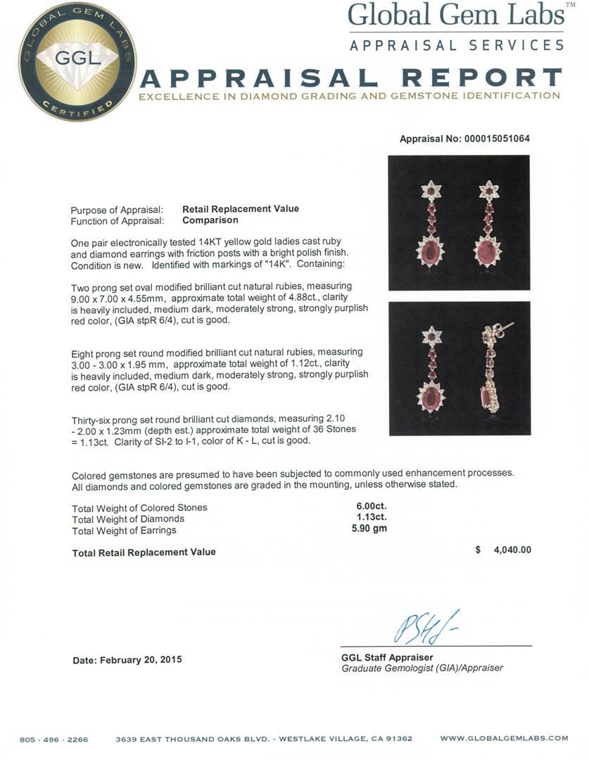 One pair electronically tested 14KT yellow gold ladies cast ruby and diamond earrings with friction posts with a bright polish finish. Identified with markings of "14K". Condition is new. Containing: Two prong set oval modified brilliant cut natural rubies, measuring 9.00 x 7.00 x 4.55mm, approximate total weight of 4.88ct., clarity is heavily included, medium dark, moderately strong, strongly purplish red color, (GIA stpR 6/4), cut is good. Eight prong set round modified brilliant cut natural rubies, measuring 3.00 - 3.00 x 1.95 mm, approximate total weight of 1.12ct., clarity is heavily included, medium dark, moderately strong, strongly purplish red color, (GIA stpR 6/4), cut is good. Thirty-Six prong set round brilliant cut diamonds, measuring 2.10 - 2.00 x 1.23mm (depth est.) approximate total weight of 36 Stones = 1.13ct. Clarity: SI-2 to I-1. Color: K - L, Cut is Good. Colored gemstones are presumed to have been subjected to commonly used enhancement processes. All diamonds and colored gemstones are graded in the mounting, unless otherwise stated. Total Weight of Colored Stones 6.00ct. Total Weight of Diamonds 1.13ct. Total Weight of Earrings 5.90 grams. GGL Appraised at $4,040.00.