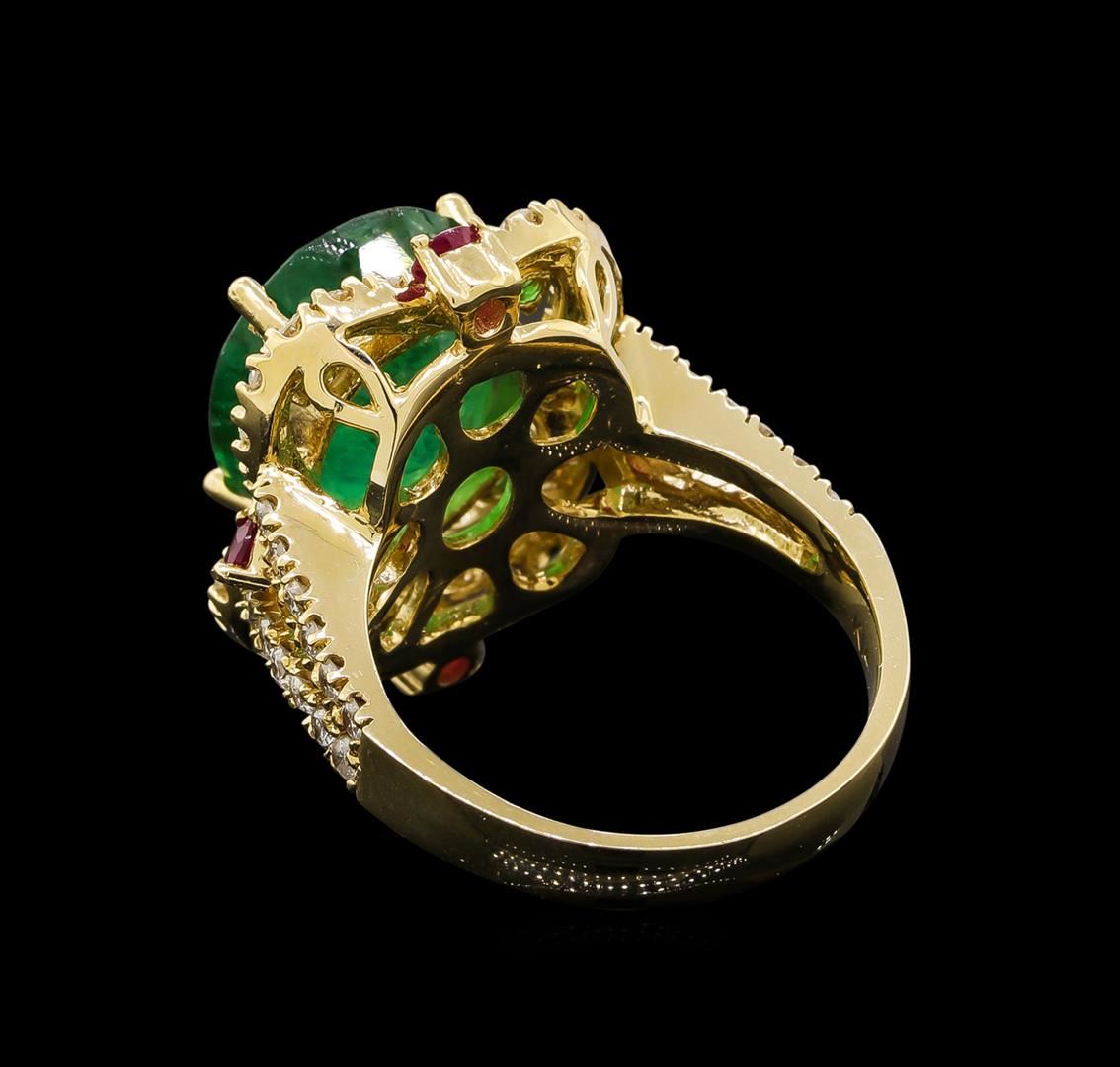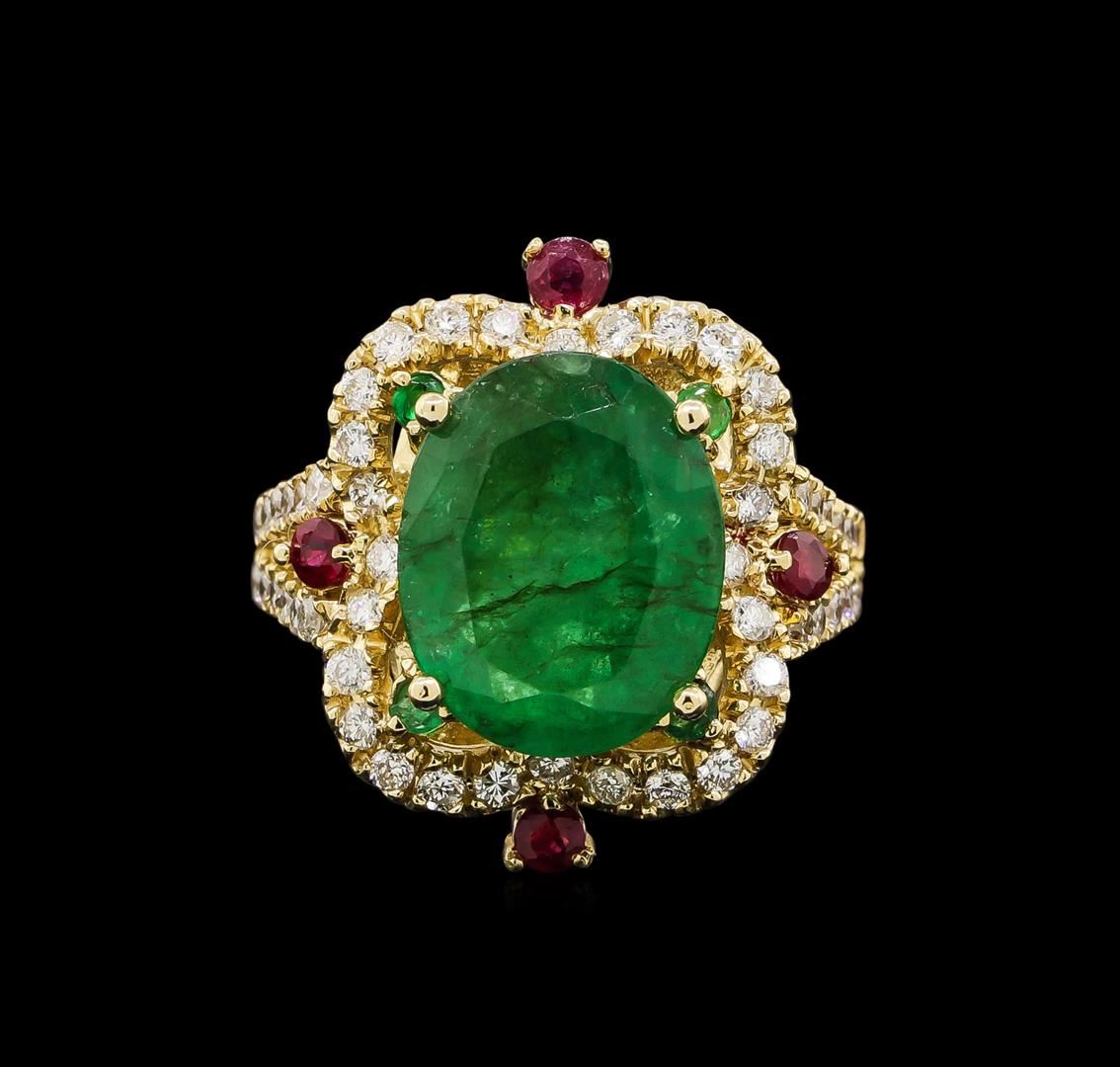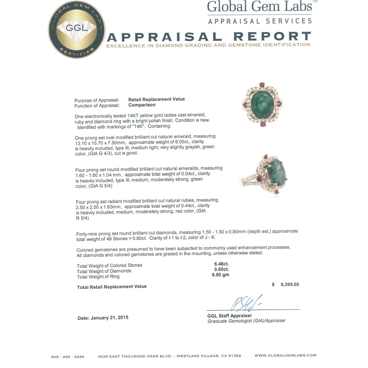 One electronically tested 14KT yellow gold ladies cast emerald, ruby and diamond ring with a bright polish finish. Identified with markings of "14K". Condition is new. Containing: One prong set oval modified brilliant cut natural emerald, measuring 13.10 x 10.70 x 7.50mm, approximate weight of 6.00ct., clarity is heavily included, type III, medium light, very slightly grayish, green color, (GIA G 4/3), cut is good. Four prong set round modified brilliant cut natural emeralds, measuring 1.60 - 1.60 x 1.04 mm, approximate total weight of 0.04ct., clarity is heavily included, type III, medium, moderately strong, green color, (GIA G 5/4)Four prong set radiant modified brilliant cut natural rubies, measuring 2.50 x 2.50 x 1.63mm, approximate total weight of 0.44ct., clarity is heavily included, medium, moderately strong, red color, (GIA R 5/4)Forty-Nine prong set round brilliant cut diamonds, measuring 1.50 - 1.50 x 0.90mm (depth est.) approximate total weight of 49 Stones = 0.60ct. Clarity: I-1 to I-2. Color: J - K. Colored gemstones are presumed to have been subjected to commonly used enhancement processes. All diamonds and colored gemstones are graded in the mounting, unless otherwise stated. Total Weight of Colored Stones 6.48ct. Total Weight of Diamonds 0.60ct. Total Weight of Ring 8.90 grams. GGL Appraised at $6,395.00.