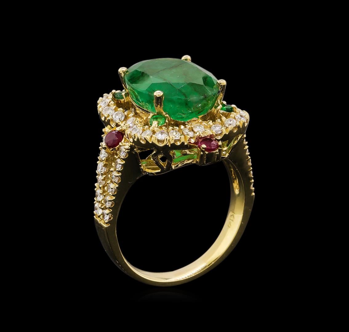 One electronically tested 14KT yellow gold ladies cast emerald, ruby and diamond ring with a bright polish finish. Identified with markings of "14K". Condition is new. Containing: One prong set oval modified brilliant cut natural emerald, measuring 13.10 x 10.70 x 7.50mm, approximate weight of 6.00ct., clarity is heavily included, type III, medium light, very slightly grayish, green color, (GIA G 4/3), cut is good. Four prong set round modified brilliant cut natural emeralds, measuring 1.60 - 1.60 x 1.04 mm, approximate total weight of 0.04ct., clarity is heavily included, type III, medium, moderately strong, green color, (GIA G 5/4)Four prong set radiant modified brilliant cut natural rubies, measuring 2.50 x 2.50 x 1.63mm, approximate total weight of 0.44ct., clarity is heavily included, medium, moderately strong, red color, (GIA R 5/4)Forty-Nine prong set round brilliant cut diamonds, measuring 1.50 - 1.50 x 0.90mm (depth est.) approximate total weight of 49 Stones = 0.60ct. Clarity: I-1 to I-2. Color: J - K. Colored gemstones are presumed to have been subjected to commonly used enhancement processes. All diamonds and colored gemstones are graded in the mounting, unless otherwise stated. Total Weight of Colored Stones 6.48ct. Total Weight of Diamonds 0.60ct. Total Weight of Ring 8.90 grams. GGL Appraised at $6,395.00.