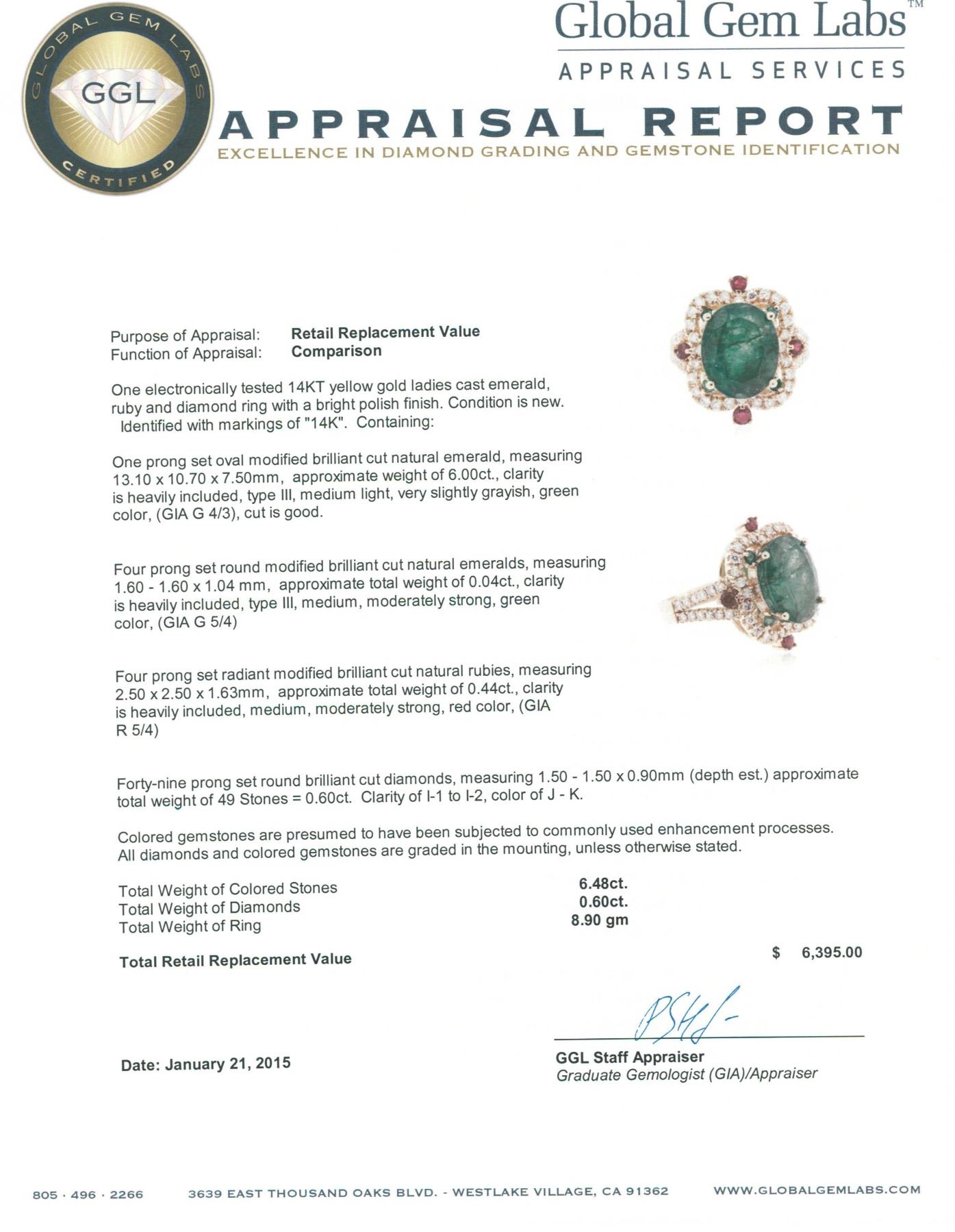 One electronically tested 14KT yellow gold ladies cast emerald, ruby and diamond ring with a bright polish finish. Identified with markings of "14K". Condition is new. Containing: One prong set oval modified brilliant cut natural emerald, measuring 13.10 x 10.70 x 7.50mm, approximate weight of 6.00ct., clarity is heavily included, type III, medium light, very slightly grayish, green color, (GIA G 4/3), cut is good. Four prong set round modified brilliant cut natural emeralds, measuring 1.60 - 1.60 x 1.04 mm, approximate total weight of 0.04ct., clarity is heavily included, type III, medium, moderately strong, green color, (GIA G 5/4)Four prong set radiant modified brilliant cut natural rubies, measuring 2.50 x 2.50 x 1.63mm, approximate total weight of 0.44ct., clarity is heavily included, medium, moderately strong, red color, (GIA R 5/4)Forty-Nine prong set round brilliant cut diamonds, measuring 1.50 - 1.50 x 0.90mm (depth est.) approximate total weight of 49 Stones = 0.60ct. Clarity: I-1 to I-2. Color: J - K. Colored gemstones are presumed to have been subjected to commonly used enhancement processes. All diamonds and colored gemstones are graded in the mounting, unless otherwise stated. Total Weight of Colored Stones 6.48ct. Total Weight of Diamonds 0.60ct. Total Weight of Ring 8.90 grams. GGL Appraised.