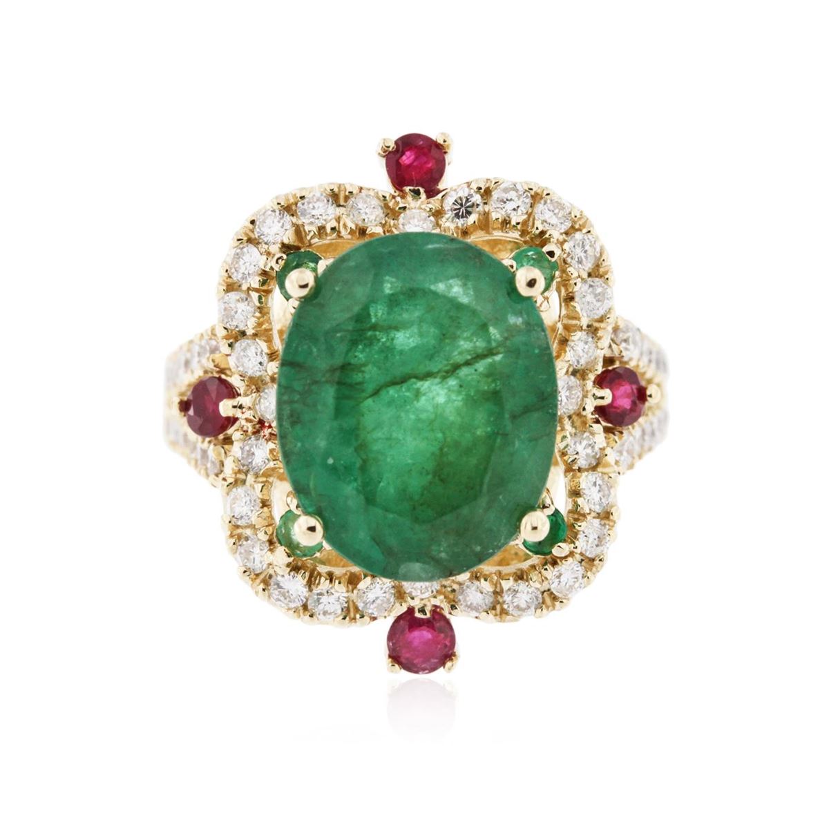 One electronically tested 14KT yellow gold ladies cast emerald, ruby and diamond ring with a bright polish finish. Identified with markings of "14K". Condition is new. Containing: One prong set oval modified brilliant cut natural emerald, measuring 13.10 x 10.70 x 7.50mm, approximate weight of 6.00ct., clarity is heavily included, type III, medium light, very slightly grayish, green color, (GIA G 4/3), cut is good. Four prong set round modified brilliant cut natural emeralds, measuring 1.60 - 1.60 x 1.04 mm, approximate total weight of 0.04ct., clarity is heavily included, type III, medium, moderately strong, green color, (GIA G 5/4)Four prong set radiant modified brilliant cut natural rubies, measuring 2.50 x 2.50 x 1.63mm, approximate total weight of 0.44ct., clarity is heavily included, medium, moderately strong, red color, (GIA R 5/4)Forty-Nine prong set round brilliant cut diamonds, measuring 1.50 - 1.50 x 0.90mm (depth est.) approximate total weight of 49 Stones = 0.60ct. Clarity: I-1 to I-2. Color: J - K. Colored gemstones are presumed to have been subjected to commonly used enhancement processes. All diamonds and colored gemstones are graded in the mounting, unless otherwise stated. Total Weight of Colored Stones 6.48ct. Total Weight of Diamonds 0.60ct. Total Weight of Ring 8.90 grams. GGL Appraised at $6,395.00.