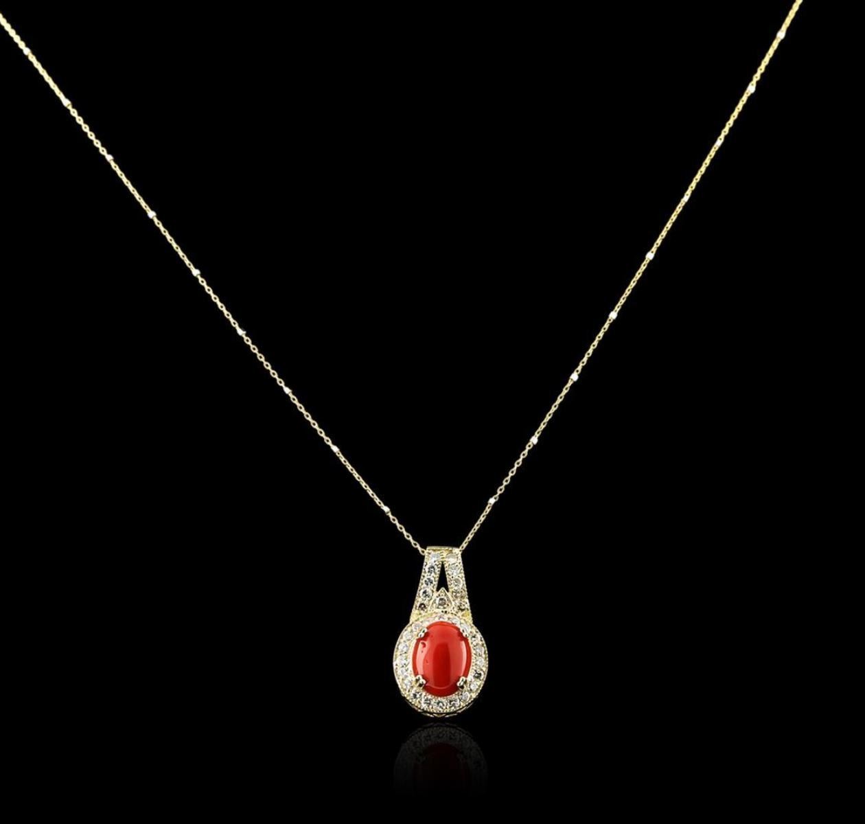 One electronically tested 14KT yellow gold ladies cast coral and diamond pendant & chain 18.0" long, with a spring ring clasp with a bright polish finish. Identified with markings of "14K". Condition is new. Containing: One prong set oval cabochon cut natural red coral, measuring 11.20 x 8.80 x 5.72mm, approximate weight of 6.16ct., clarity is heavily included, medium dark, brownish, red color, (GIA R 6/1), cut is good. Thirty-One prong set round brilliant cut diamonds, measuring 1.70 - 1.70 x 1.02mm (depth est.) approximate total weight of 31 Stones = 0.56ct. Clarity: SI-1 to SI-2. Color: K - L, Cut is Good. Diamonds and colored gemstones are graded in the mounting, unless otherwise stated. Colored gemstones are presumed to have been subjected to commonly used enhancement processes. Total Weight of Colored Stones 6.16ct. Total Weight of Diamonds 0.56ct. Total Weight of Pendant & Chain 5.70 grams. GGL Appraised.