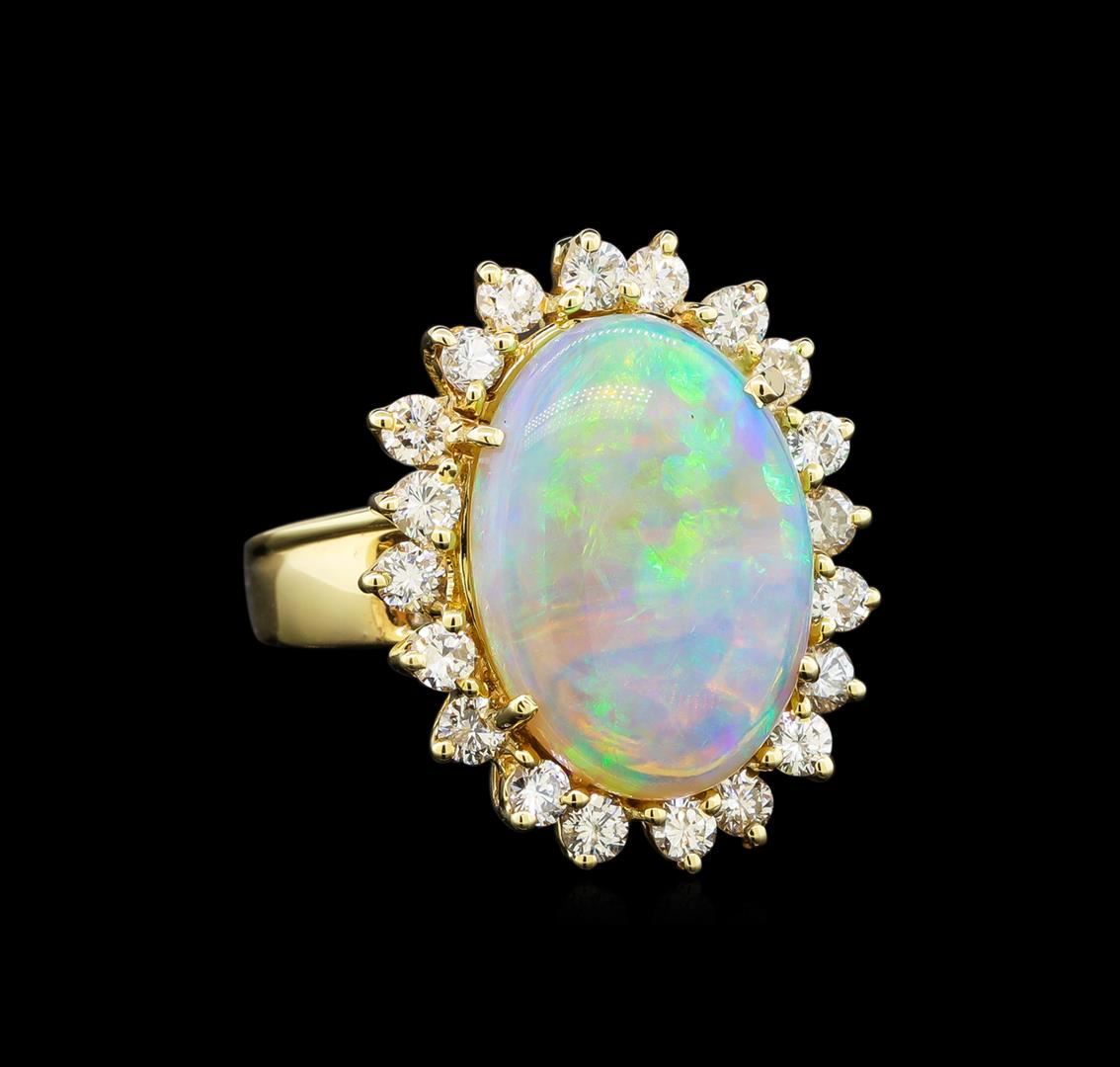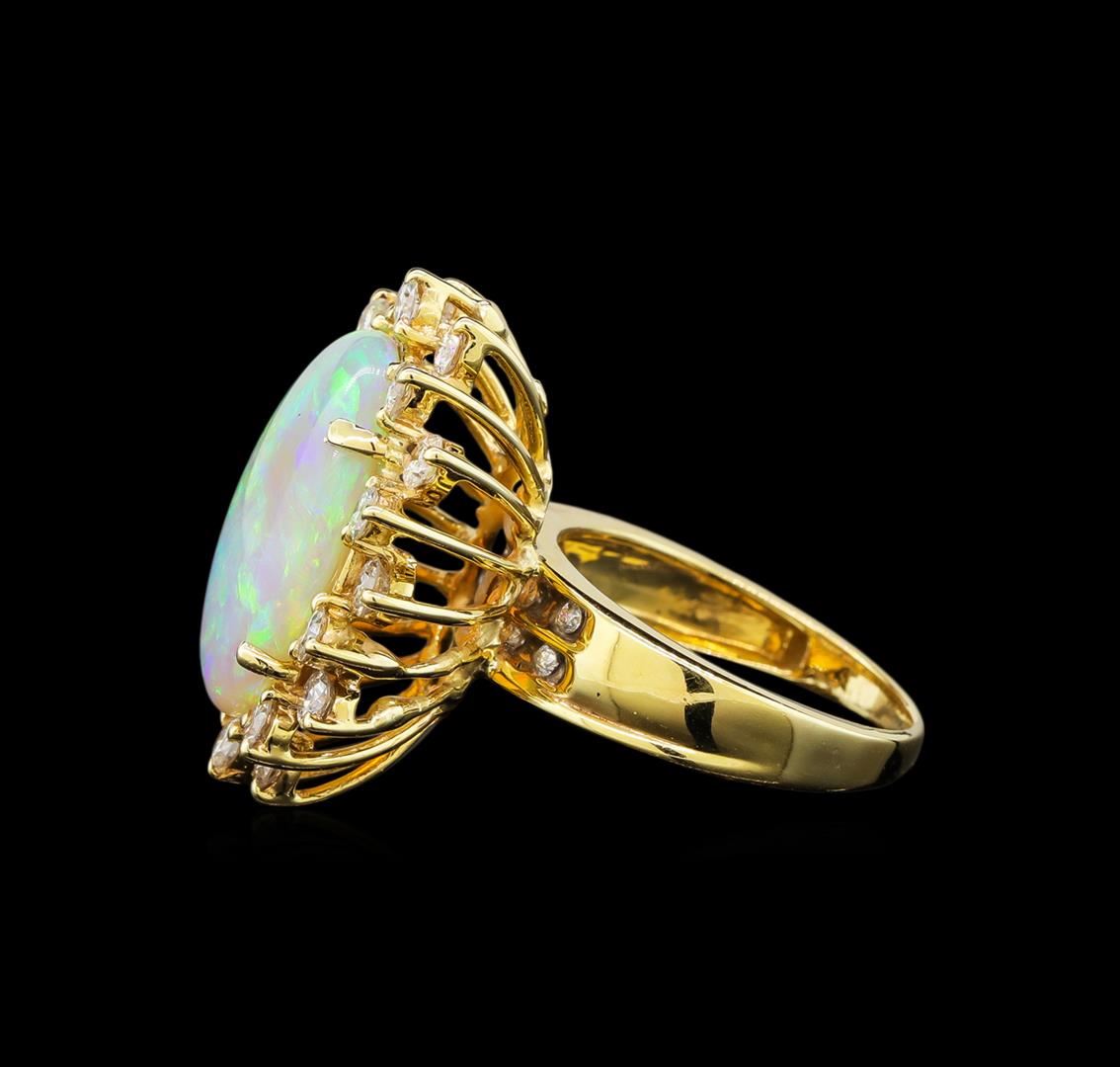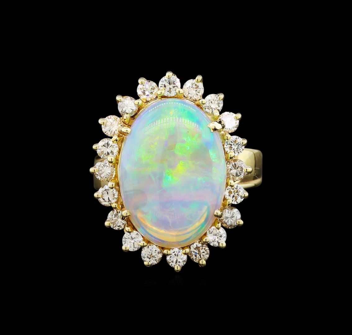 One electronically tested 14KT yellow gold ladies cast opal & diamond ring with a bright finish. The featured opal is set within a diamond bezel, supported by a ribbed under gallery, completed by a two millimeter wide band. Identified with markings of "14K". Condition is good. Containing: One crystal opal that is cut in a oval shaped cabochon and is prong set, measuring 17.10 mm long x 12.30 mm wide, and 4.70 mm thick and the approximate weight is 6.16 carats. The opal has a bright, blue-green play of color (fire) in a flashfire pattern; a high dome; a good cut; slightly included; minor dull spot in its brightness and pattern; and is somewhat directional. Graded in the setting. Twenty prong set round brilliant cut diamonds, measuring 2.50 - 2.30 x 1.42mm (depth est.) approximate total weight of 20 Stones = 0.90ct. Graded in the setting. Clarity: SI-1 to I-1. Color: F - G. Total Weight of Diamonds 0.90ct. Total Weight of Opals 6.16ct. Total Weight of Ring 7.25 grams. AIG Appraised at $4,950.00.