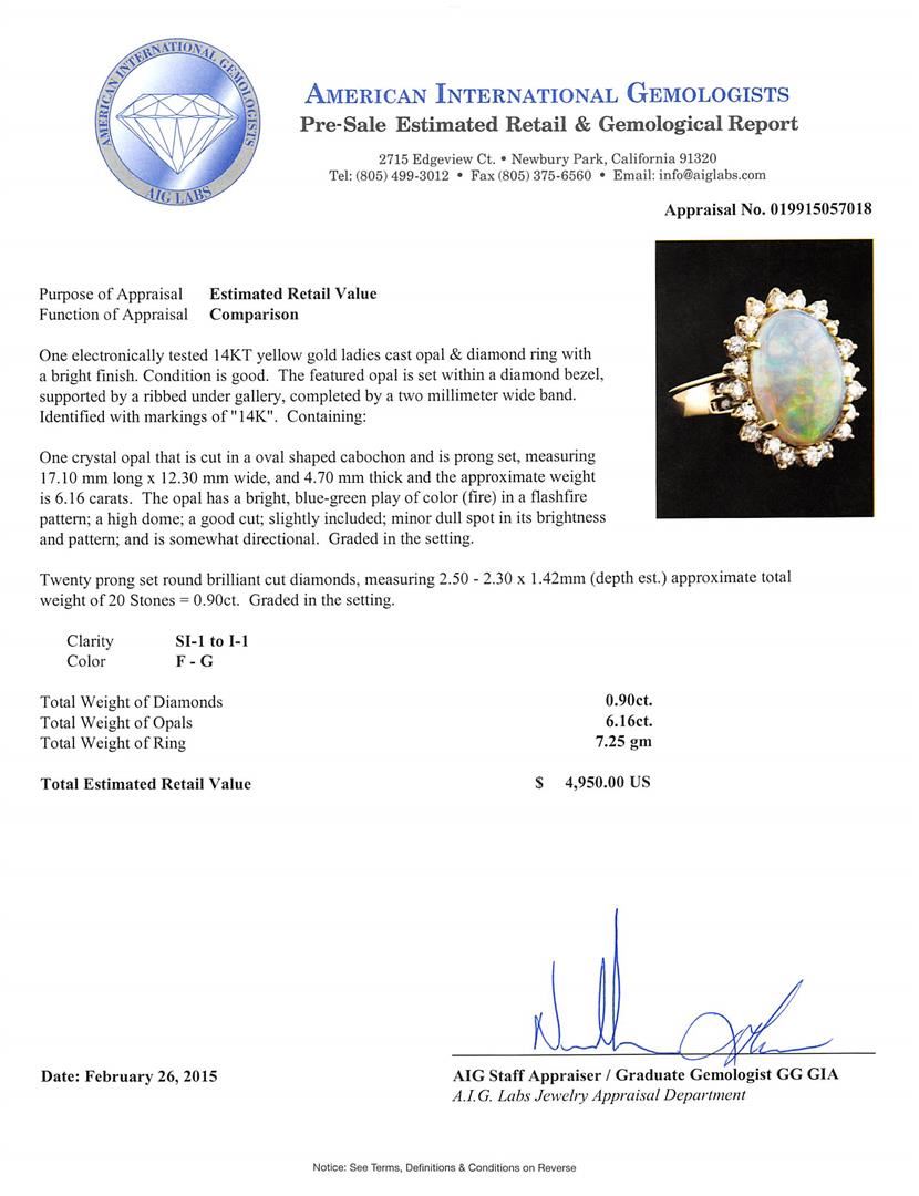 One electronically tested 14KT yellow gold ladies cast opal & diamond ring with a bright finish. The featured opal is set within a diamond bezel, supported by a ribbed under gallery, completed by a two millimeter wide band. Identified with markings of "14K". Condition is good. Containing: One crystal opal that is cut in a oval shaped cabochon and is prong set, measuring 17.10 mm long x 12.30 mm wide, and 4.70 mm thick and the approximate weight is 6.16 carats. The opal has a bright, blue-green play of color (fire) in a flashfire pattern; a high dome; a good cut; slightly included; minor dull spot in its brightness and pattern; and is somewhat directional. Graded in the setting. Twenty prong set round brilliant cut diamonds, measuring 2.50 - 2.30 x 1.42mm (depth est.) approximate total weight of 20 Stones = 0.90ct. Graded in the setting. Clarity: SI-1 to I-1. Color: F - G. Total Weight of Diamonds 0.90ct. Total Weight of Opals 6.16ct. Total Weight of Ring 7.25 grams. AIG Appraised at $4,950.00.