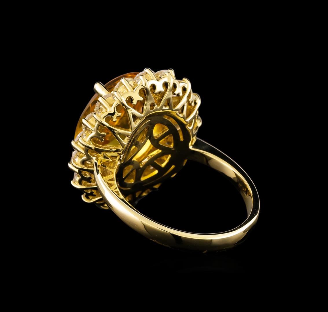 One electronically tested 14KT yellow gold ladies combination cast & assembled citrine and diamond ring with a flat shank with a bright polish finish. Identified with markings of "K14". Condition is new. Containing: One prong set oval modified brilliant cut natural citrine quartz, measuring 14.31 x 12.26 x 6.57mm, approximate weight of 6.17ct., clarity is eye clean, type I, medium light, brownish, yellow color, (GIA Y 4/3), cut is good. Sixteen prong set round brilliant cut diamonds, measuring 3.00 - 3.00 x 1.80mm (depth est.) approximate total weight of 16 Stones = 1.58ct. Clarity: SI-2 to I-1. Color: J, Cut is Good. Sixteen prong set round brilliant cut diamonds, measuring 1.50 - 1.50 x 0.90mm (depth est.) approximate total weight of 16 Stones = 0.20 ct. Clarity: SI-2 to I-1. Color: J, Cut is Good. Colored gemstones are presumed to have been subjected to commonly used enhancement processes. All diamonds and colored gemstones are graded in the mounting, unless otherwise stated. Total Weight of Colored Stones 6.17ct. Total Weight of Diamonds 1.78ct. Total Weight of Ring 8.40 grams. GGL Appraised.