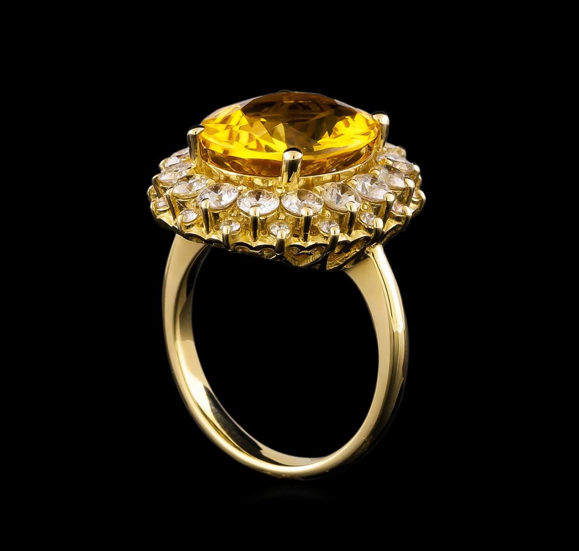 One electronically tested 14KT yellow gold ladies combination cast & assembled citrine and diamond ring with a flat shank with a bright polish finish. Identified with markings of "K14". Condition is new. Containing: One prong set oval modified brilliant cut natural citrine quartz, measuring 14.31 x 12.26 x 6.57mm, approximate weight of 6.17ct., clarity is eye clean, type I, medium light, brownish, yellow color, (GIA Y 4/3), cut is good. Sixteen prong set round brilliant cut diamonds, measuring 3.00 - 3.00 x 1.80mm (depth est.) approximate total weight of 16 Stones = 1.58ct. Clarity: SI-2 to I-1. Color: J, Cut is Good. Sixteen prong set round brilliant cut diamonds, measuring 1.50 - 1.50 x 0.90mm (depth est.) approximate total weight of 16 Stones = 0.20 ct. Clarity: SI-2 to I-1. Color: J, Cut is Good. Colored gemstones are presumed to have been subjected to commonly used enhancement processes. All diamonds and colored gemstones are graded in the mounting, unless otherwise stated. Total Weight of Colored Stones 6.17ct. Total Weight of Diamonds 1.78ct. Total Weight of Ring 8.40 grams. GGL Appraised.