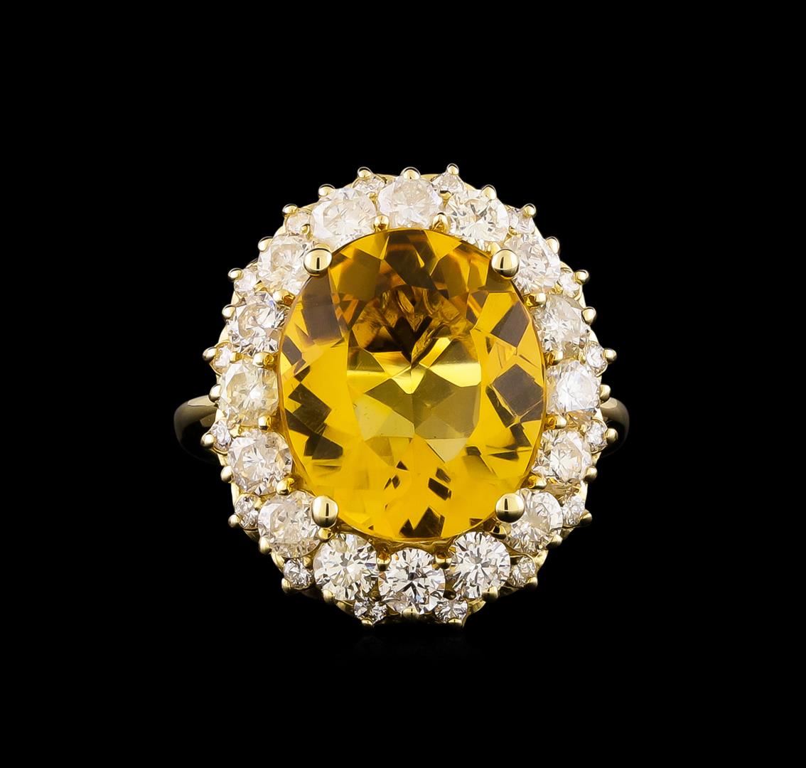 One electronically tested 14KT yellow gold ladies combination cast & assembled citrine and diamond ring with a flat shank with a bright polish finish. Identified with markings of "K14". Condition is new. Containing: One prong set oval modified brilliant cut natural citrine quartz, measuring 14.31 x 12.26 x 6.57mm, approximate weight of 6.17ct., clarity is eye clean, type I, medium light, brownish, yellow color, (GIA Y 4/3), cut is good. Sixteen prong set round brilliant cut diamonds, measuring 3.00 - 3.00 x 1.80mm (depth est.) approximate total weight of 16 Stones = 1.58ct. Clarity: SI-2 to I-1. Color: J, Cut is Good. Sixteen prong set round brilliant cut diamonds, measuring 1.50 - 1.50 x 0.90mm (depth est.) approximate total weight of 16 Stones = 0.20 ct. Clarity: SI-2 to I-1. Color: J, Cut is Good. Colored gemstones are presumed to have been subjected to commonly used enhancement processes. All diamonds and colored gemstones are graded in the mounting, unless otherwise stated. Total Weight of Colored Stones 6.17ct. Total Weight of Diamonds 1.78ct. Total Weight of Ring 8.40 grams. GGL Appraised.