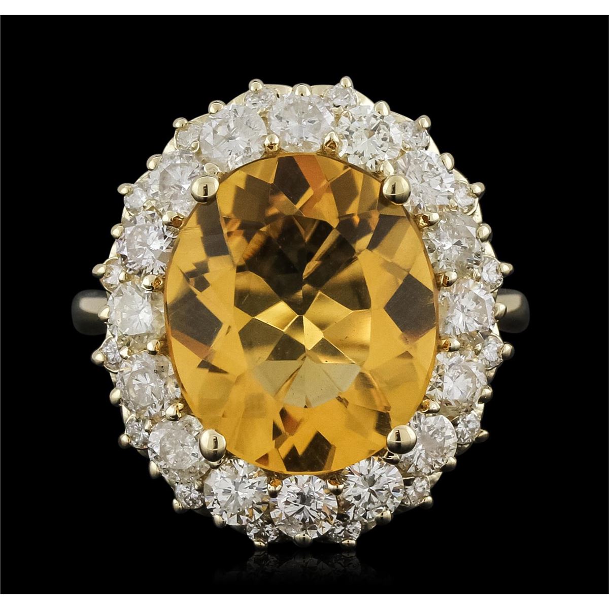 One electronically tested 14KT yellow gold ladies combination cast & assembled citrine and diamond ring with a flat shank with a bright polish finish. Identified with markings of "K14". Condition is new. Containing: One prong set oval modified brilliant cut natural citrine quartz, measuring 14.31 x 12.26 x 6.57mm, approximate weight of 6.17ct., clarity is eye clean, type I, medium light, brownish, yellow color, (GIA Y 4/3), cut is good. Sixteen prong set round brilliant cut diamonds, measuring 3.00 - 3.00 x 1.80mm (depth est.) approximate total weight of 16 Stones = 1.58ct. Clarity: SI-2 to I-1. Color: J, Cut is Good. Sixteen prong set round brilliant cut diamonds, measuring 1.50 - 1.50 x 0.90mm (depth est.) approximate total weight of 16 Stones = 0.20ct. Clarity: SI-2 to I-1. Color: J, Cut is Good. Colored gemstones are presumed to have been subjected to commonly used enhancement processes. All diamonds and colored gemstones are graded in the mounting, unless otherwise stated. Total Weight of Colored Stones 6.17ct. Total Weight of Diamonds 1.78ct. Total Weight of Ring 8.40 grams. GGL Appraised at $6,490.00.