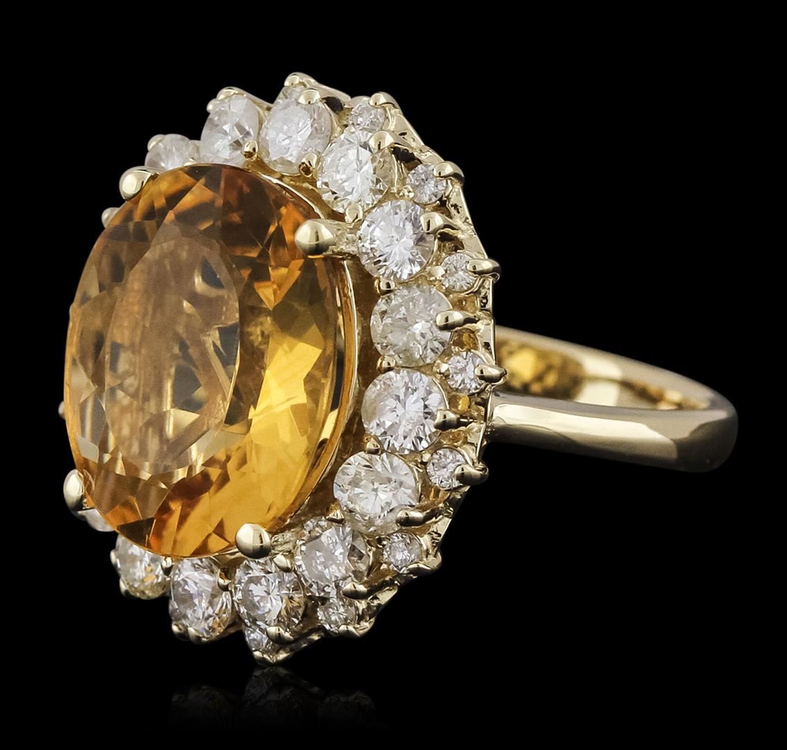 One electronically tested 14KT yellow gold ladies combination cast & assembled citrine and diamond ring with a flat shank with a bright polish finish. Identified with markings of "K14". Condition is new. Containing: One prong set oval modified brilliant cut natural citrine quartz, measuring 14.31 x 12.26 x 6.57mm, approximate weight of 6.17ct., clarity is eye clean, type I, medium light, brownish, yellow color, (GIA Y 4/3), cut is good. Sixteen prong set round brilliant cut diamonds, measuring 3.00 - 3.00 x 1.80mm (depth est.) approximate total weight of 16 Stones = 1.58ct. Clarity: SI-2 to I-1. Color: J, Cut is Good. Sixteen prong set round brilliant cut diamonds, measuring 1.50 - 1.50 x 0.90mm (depth est.) approximate total weight of 16 Stones = 0.20ct. Clarity: SI-2 to I-1. Color: J, Cut is Good. Colored gemstones are presumed to have been subjected to commonly used enhancement processes. All diamonds and colored gemstones are graded in the mounting, unless otherwise stated. Total Weight of Colored Stones 6.17ct. Total Weight of Diamonds 1.78ct. Total Weight of Ring 8.40 grams. GGL Appraised at $6,490.00.