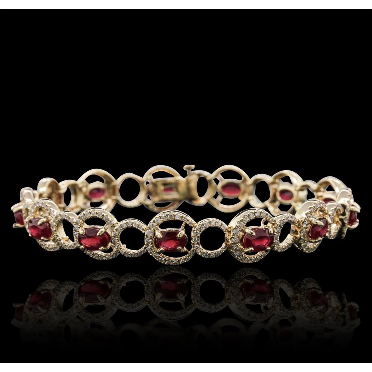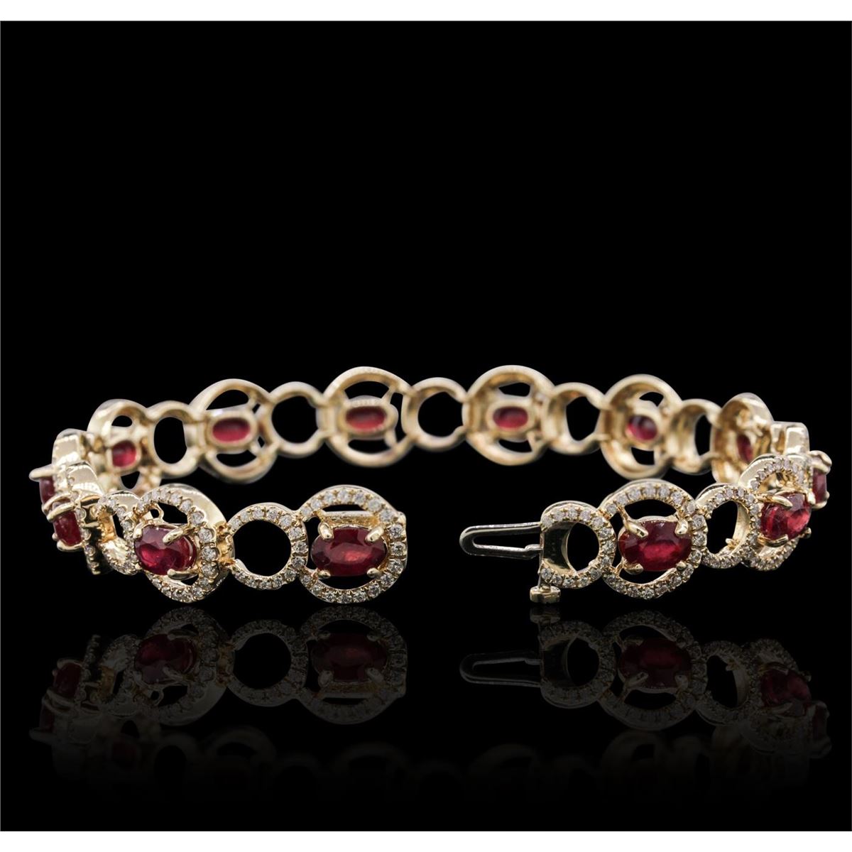 One electronically tested 14KT yellow gold ladies combination cast & assembled ruby and diamond bracelet with a hidden box clasp with a bright polish finish. Measurements: 7.25" in length. Identified with markings of "14K". Condition is new. Containing: Thirteen prong set oval modified brilliant cut natural rubies, measuring 5.60 x 4.18 x 3.00mm, approximate total weight of 6.24ct., clarity is heavily included, type II, medium, moderately strong, strongly purplish red color, (GIA stpR 5/4), cut is very good. Five Hundred Twenty prong set round brilliant cut diamonds, measuring 1.00 - 1.00 x 0.60mm (depth est.) approximate total weight of 520 Stones = 1.87ct. Clarity: I-1 to I-2. Color: I - J, Cut is Good. Colored gemstones are presumed to have been subjected to commonly used enhancement processes. All diamonds and colored gemstones are graded in the mounting, unless otherwise stated. Total Weight of Colored Stones 6.24ct. Total Weight of Diamonds 1.87ct. Total Weight of Bracelet 17.50 grams. GGL Appraised at $10,235.00.